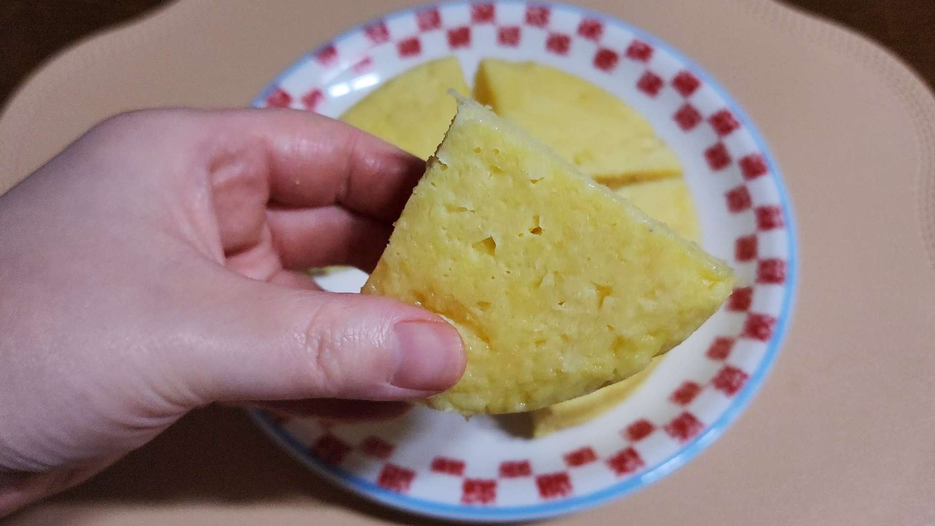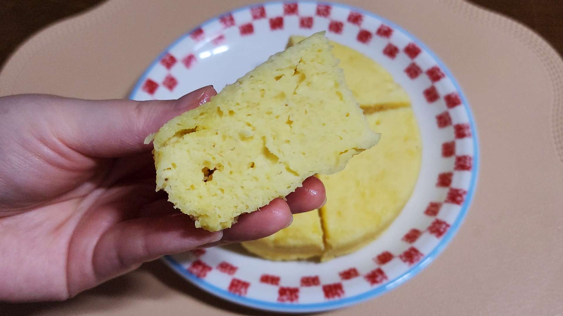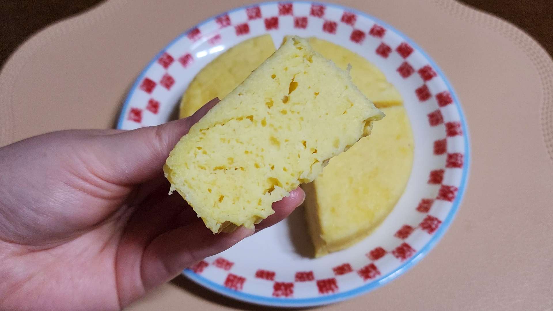 그릇에 고구마 케이크를 담고 먹기 좋은 크기로 잘라줍니다.