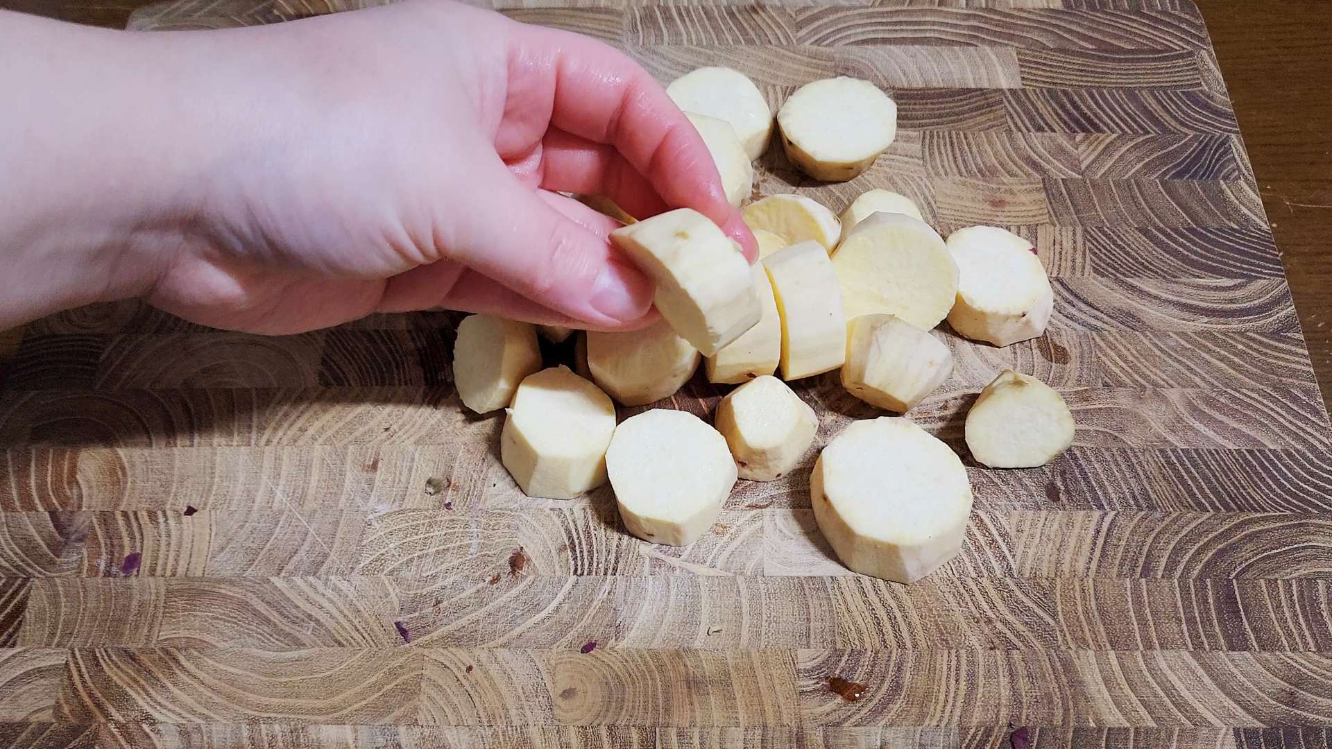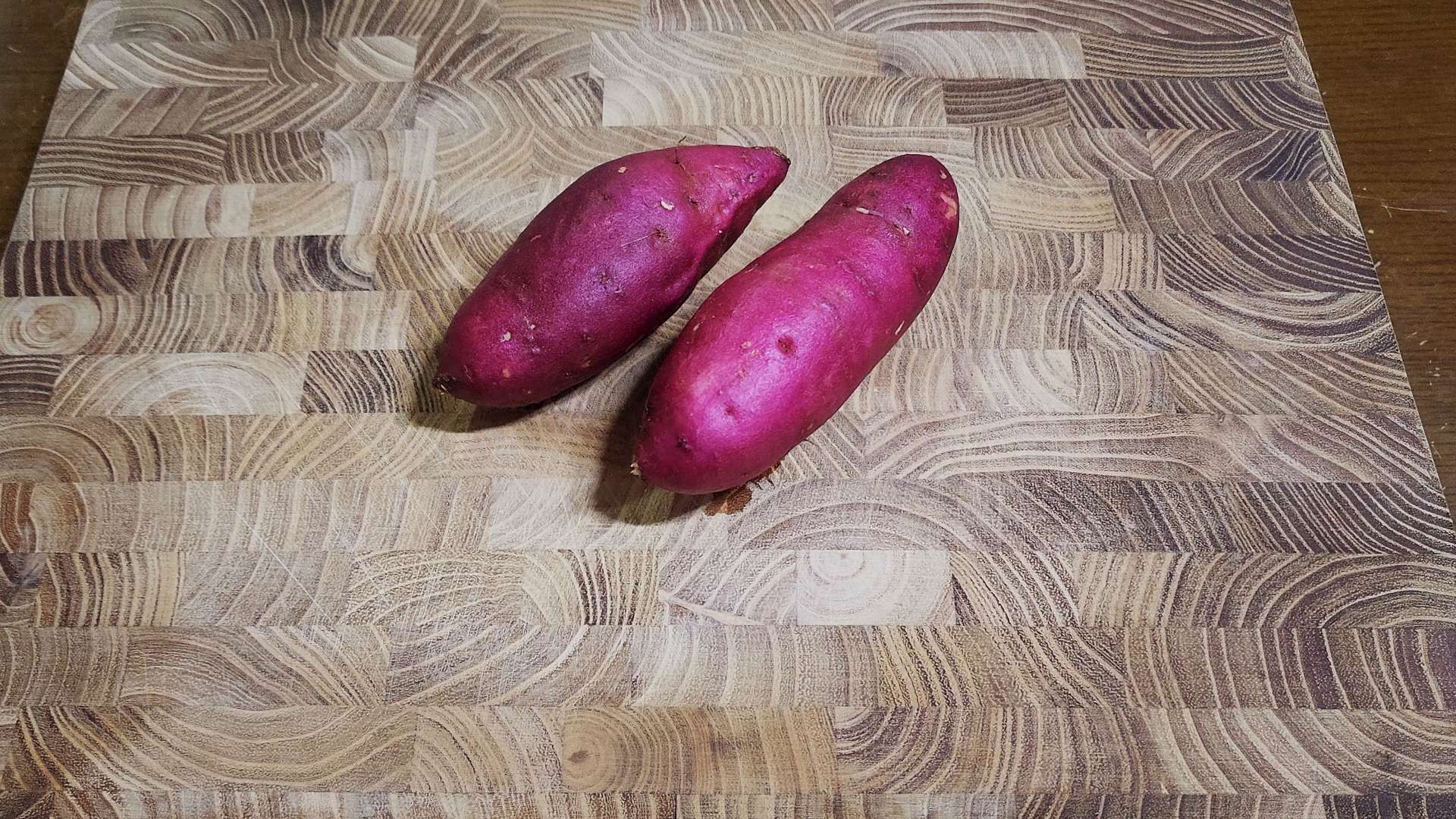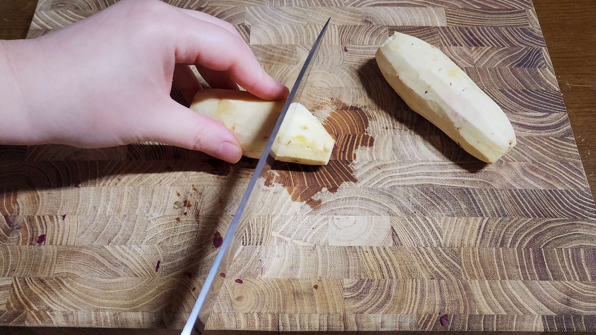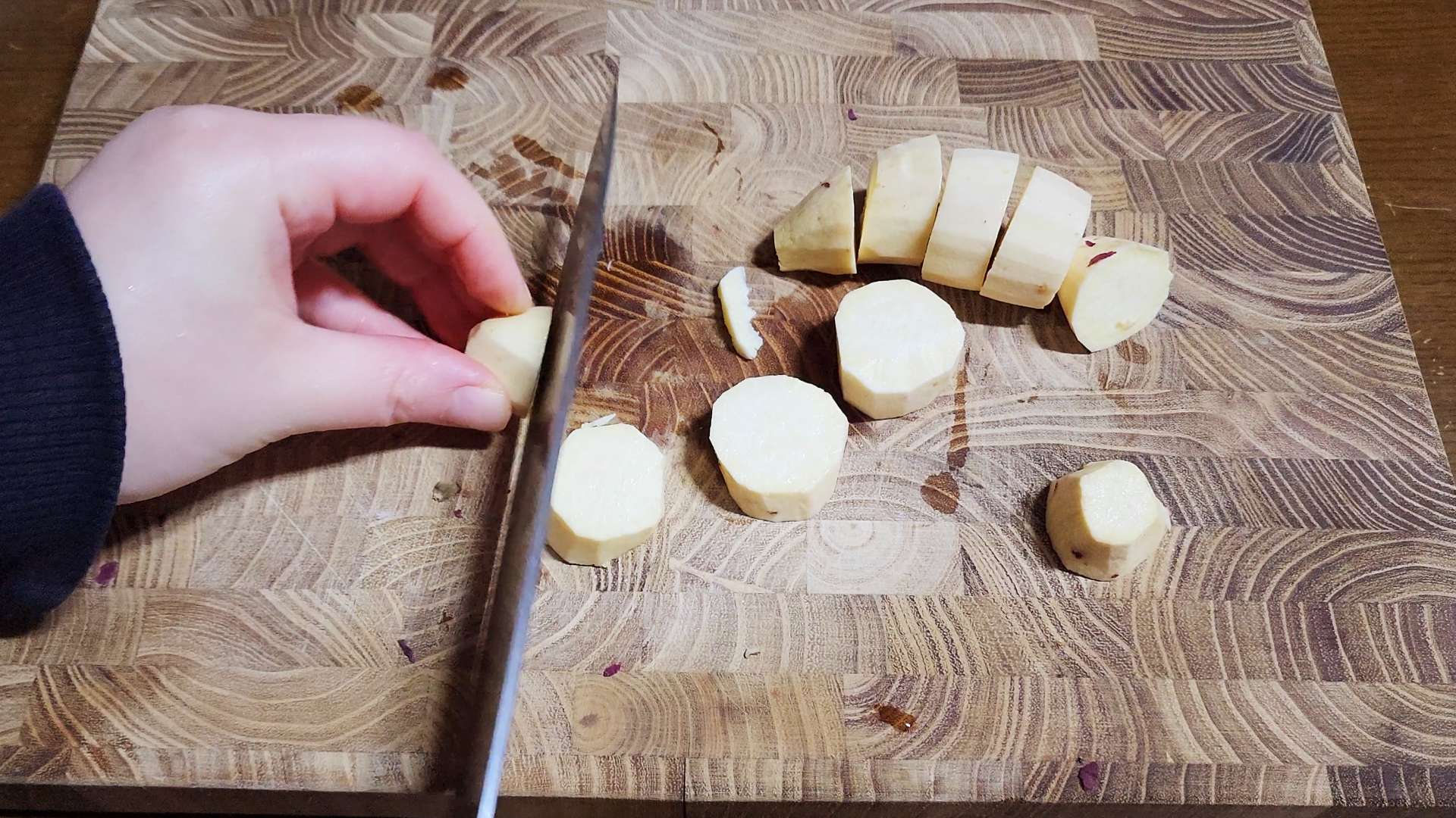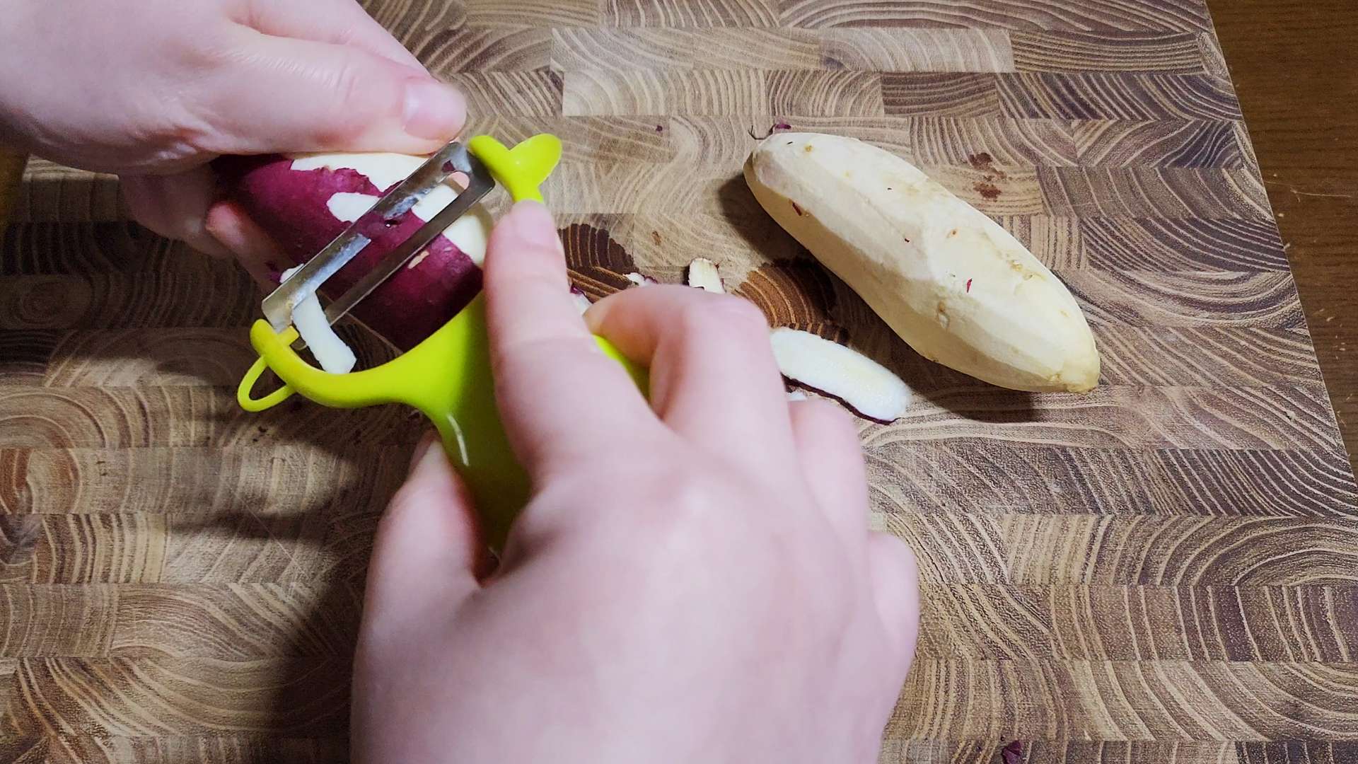 고구마 200g은 껍질을 벗기고 1.5cm 두께로 썰어줍니다.