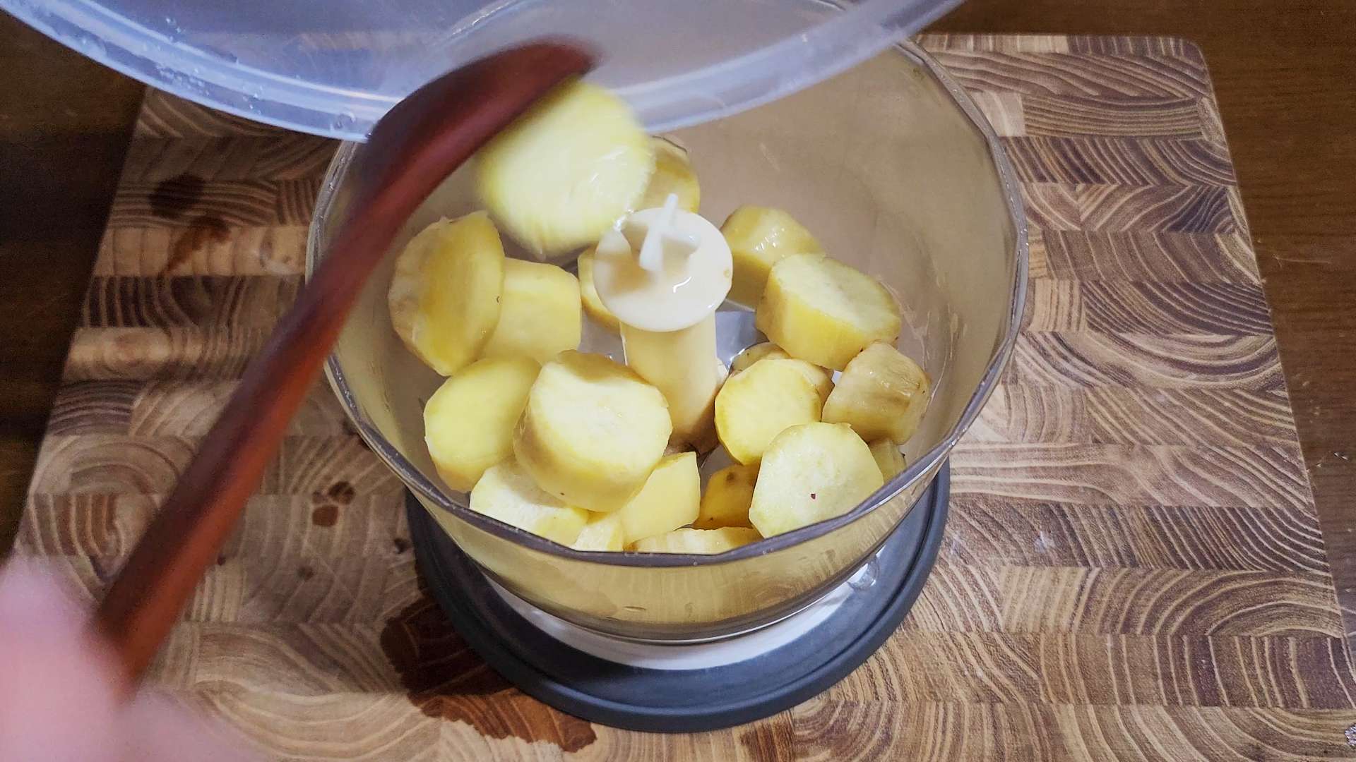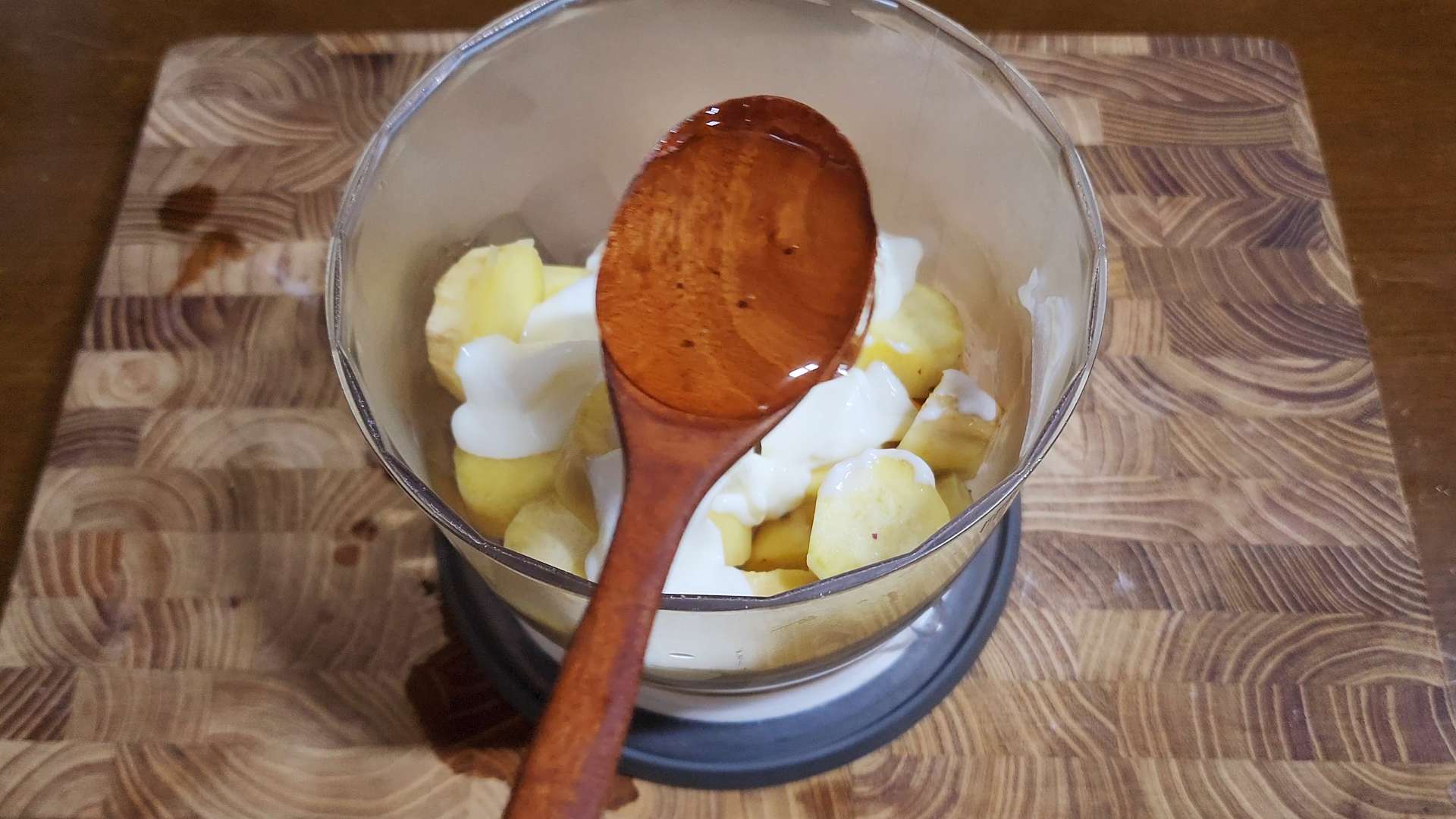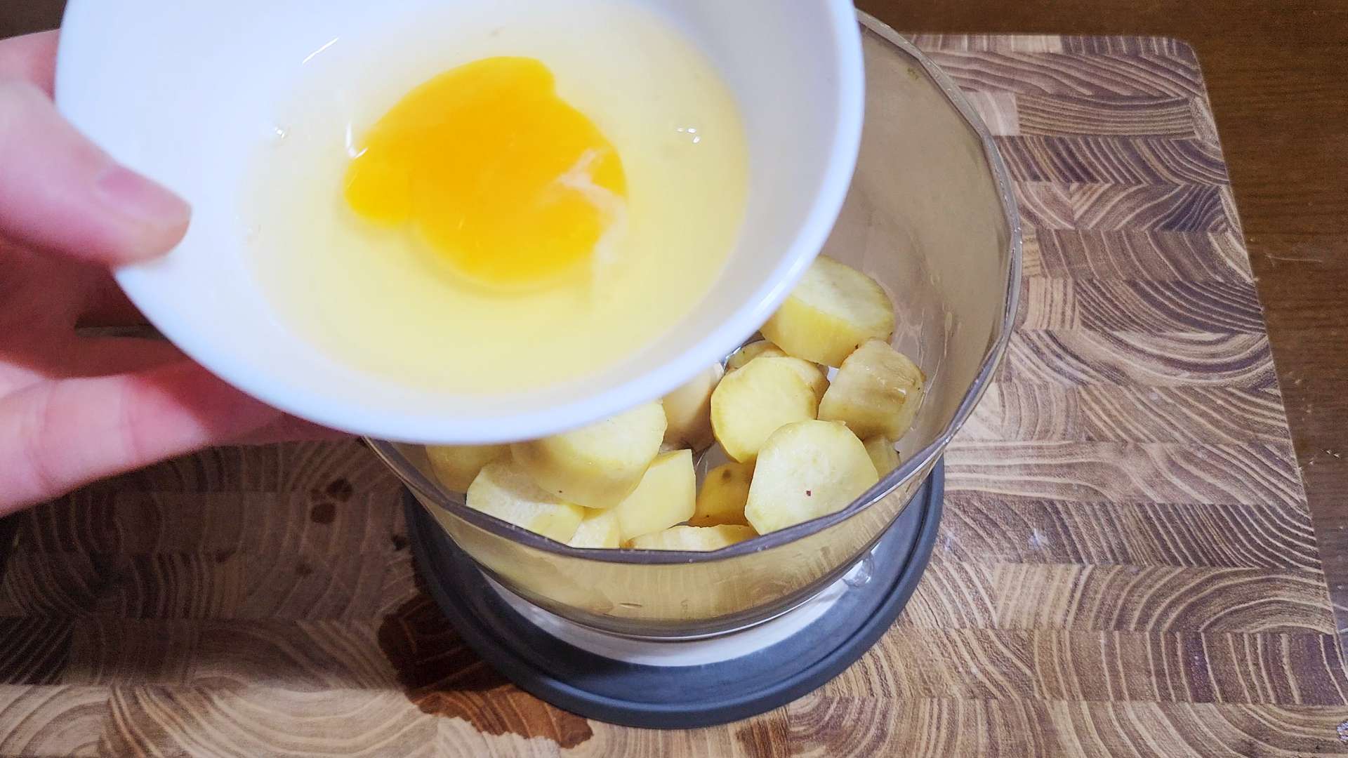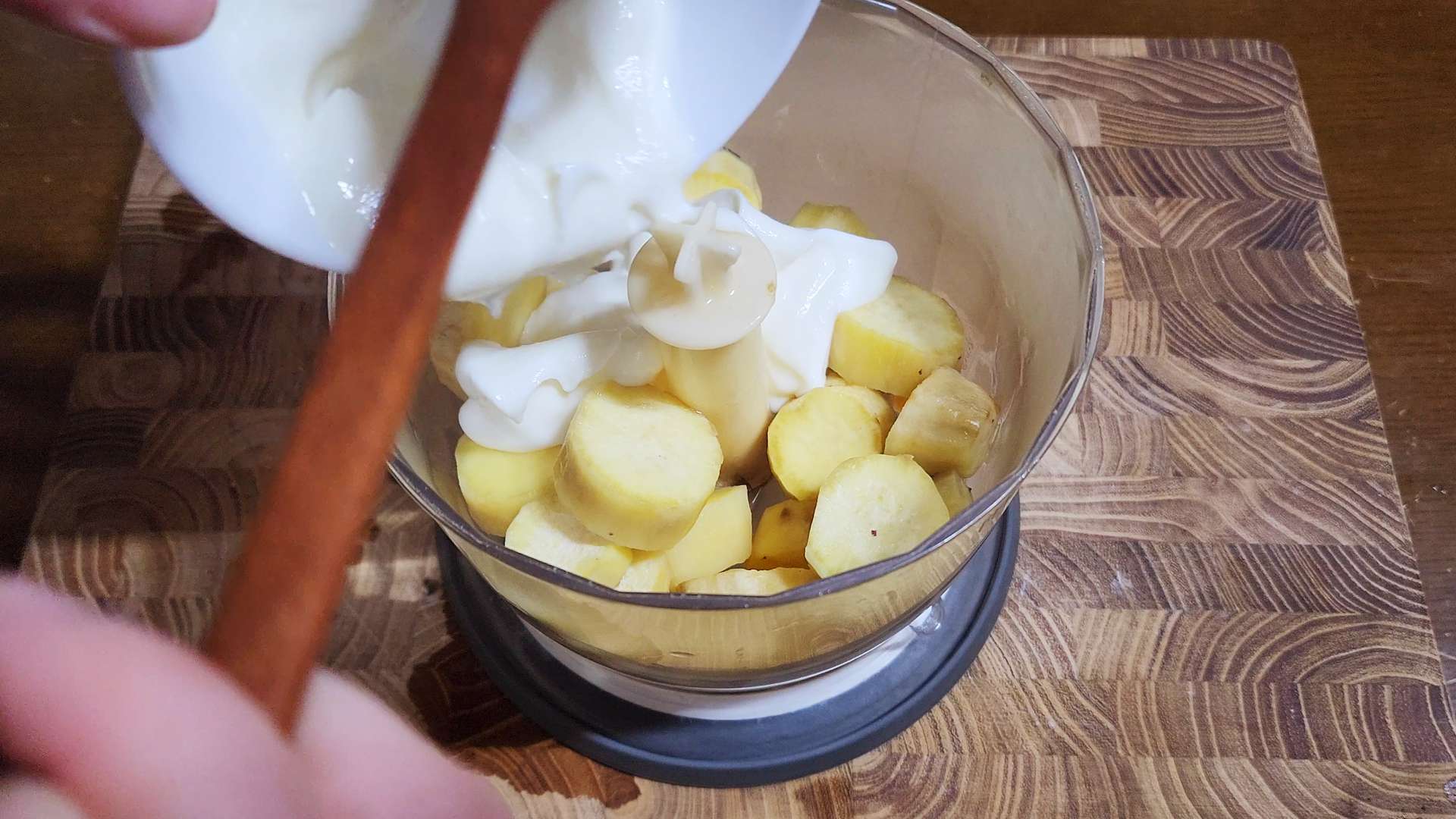 찐 고구마, 달걀 1개, 플레인 요거트 7T, 올리고당 1T 넣고 믹서기에 갈아줍니다.