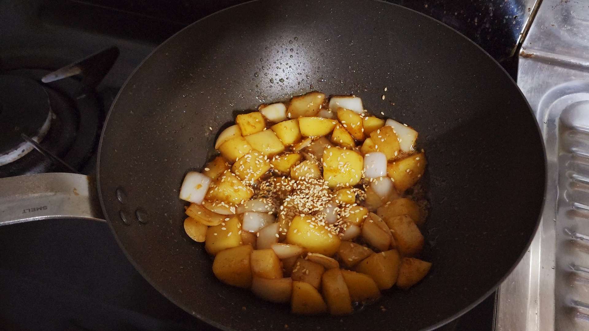감자가 익으면 센 불에서 물엿 1T, 통깨를 넣고 섞어줍니다.