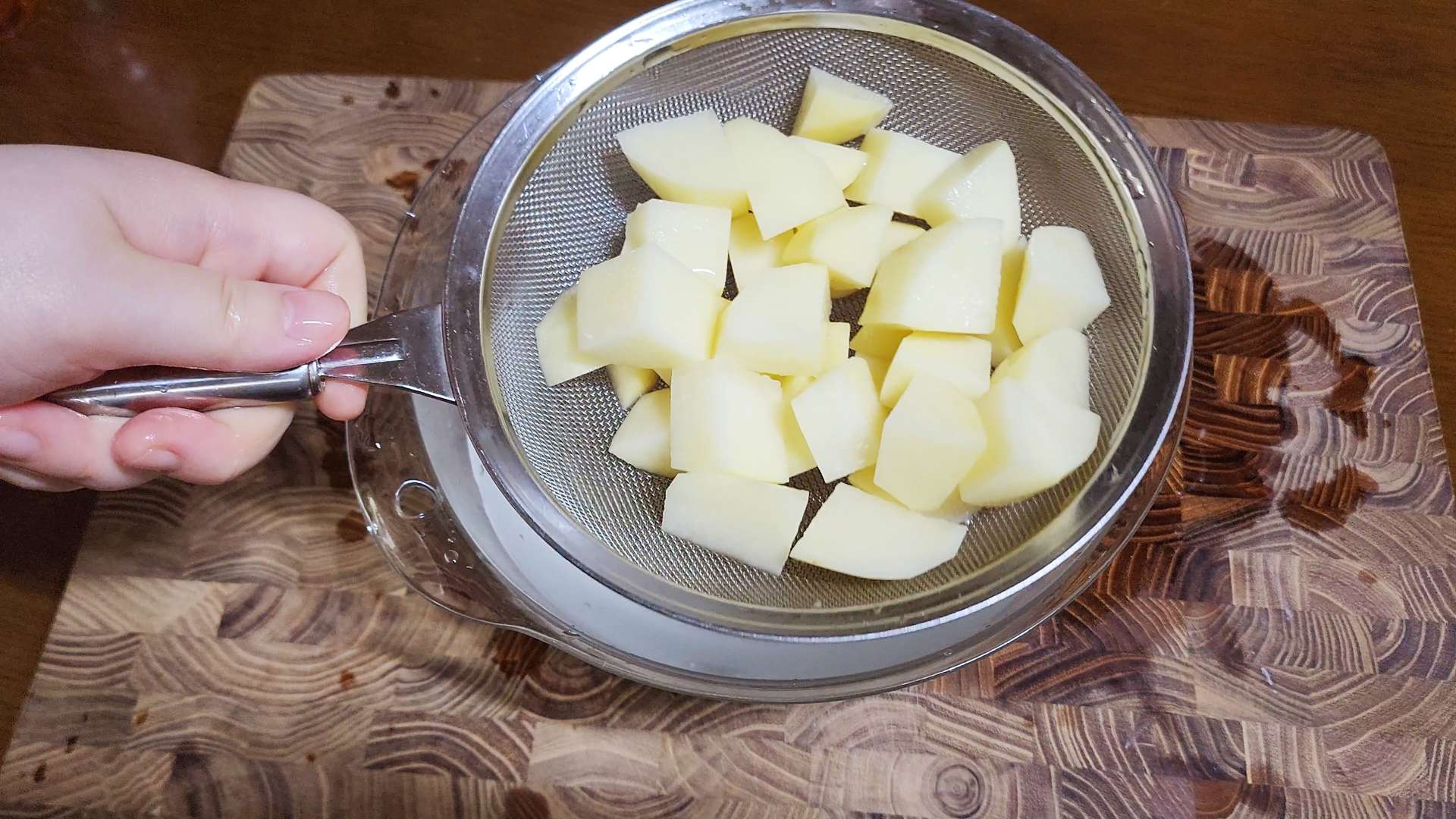 감자는 찬물에 헹구고 체에 밭쳐 물기를 제거해줍니다.