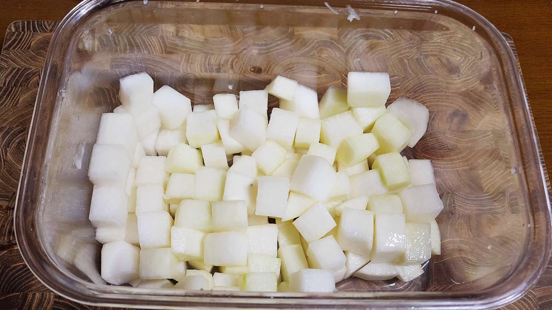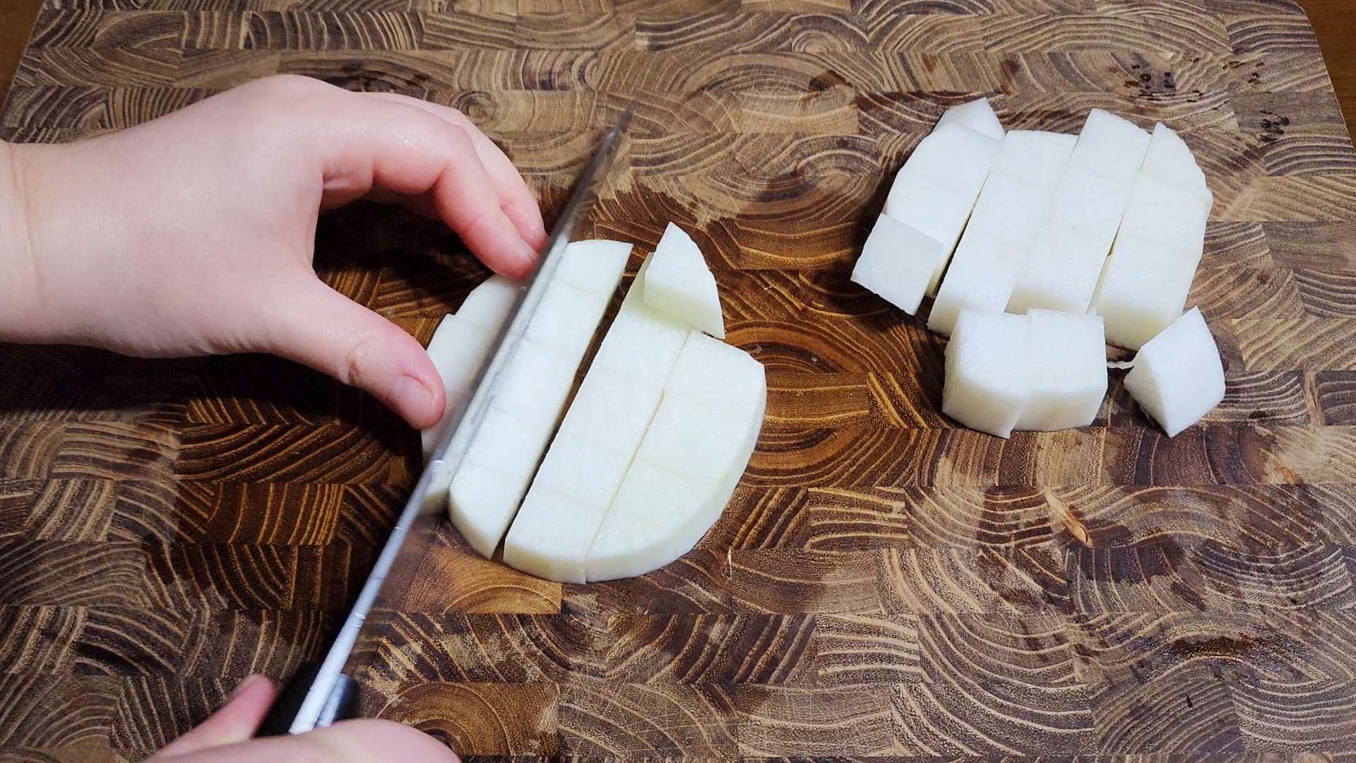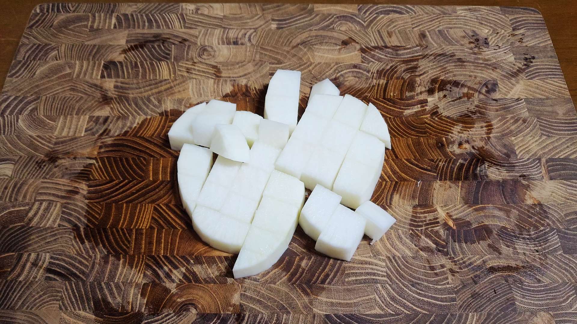 무는 껍질을 벗기고 3cm 두께로 자르고 큼직하게 깍둑 썰기해줍니다.