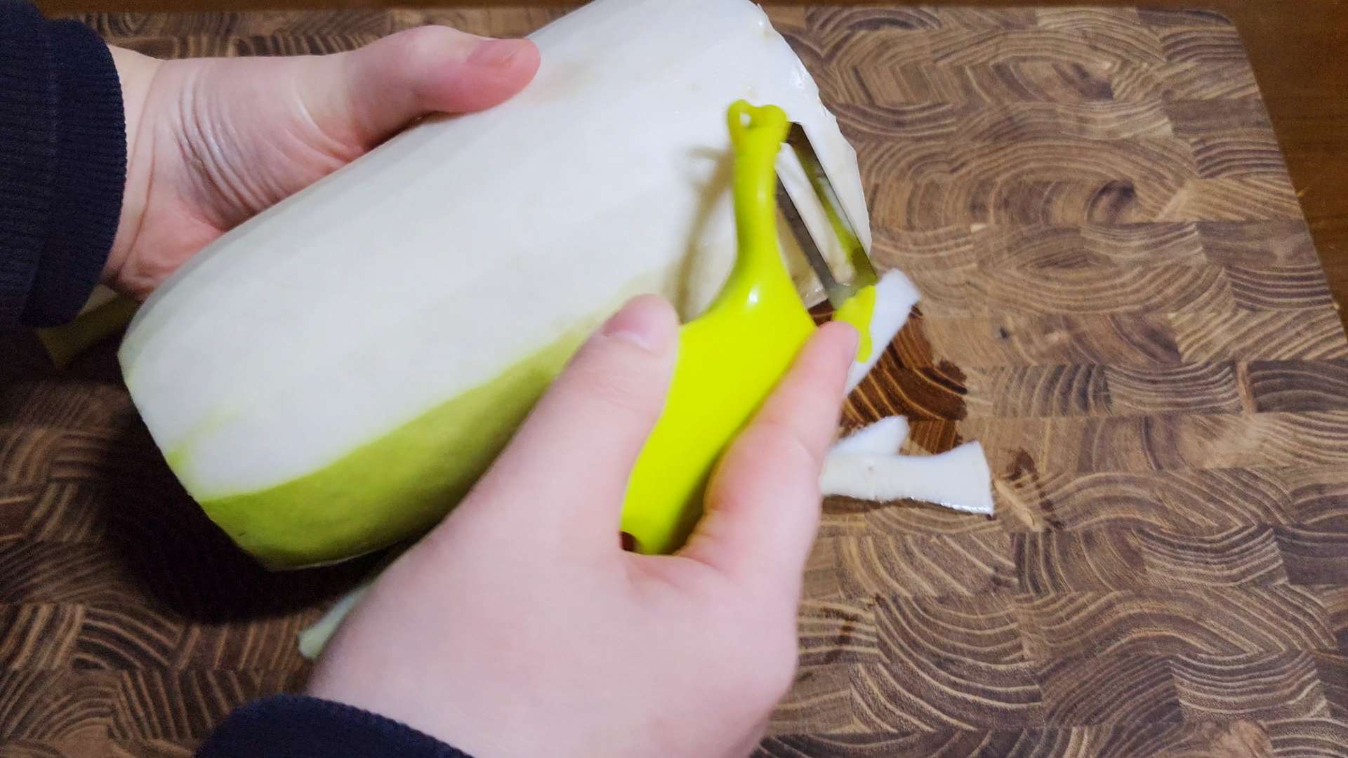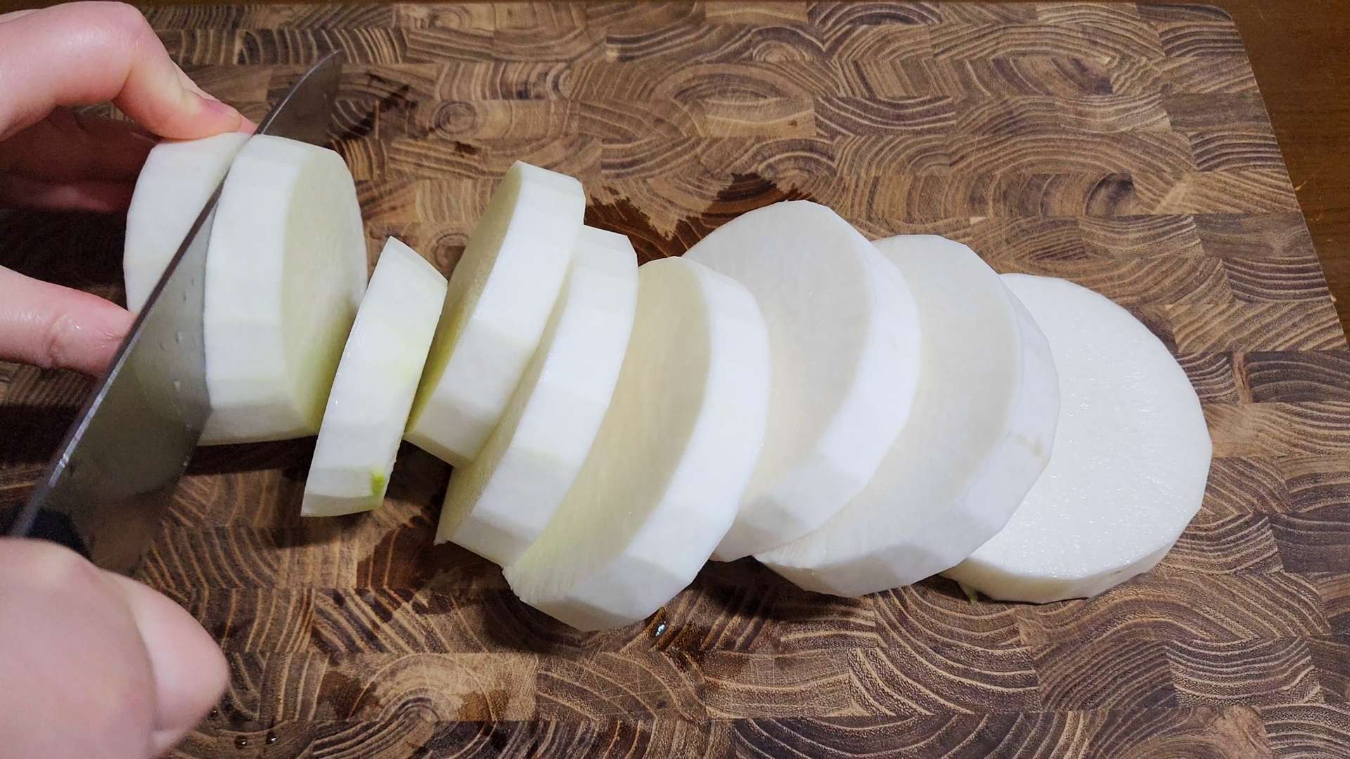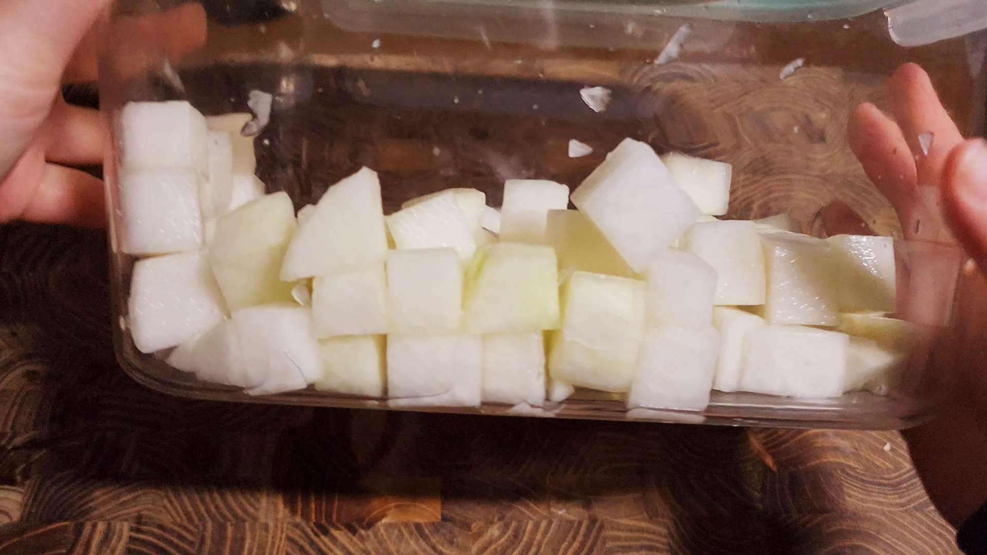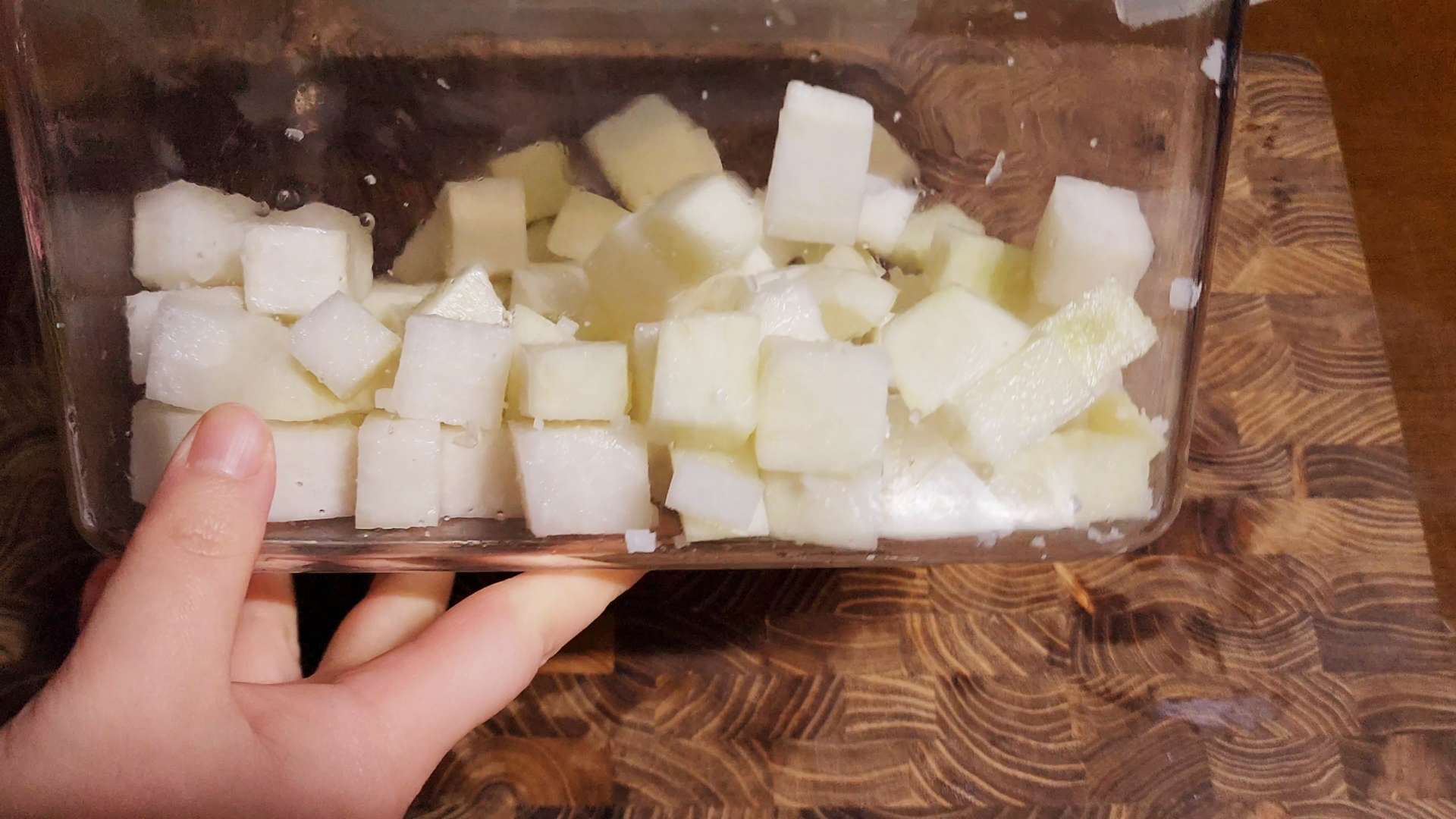 무는 껍질을 벗기고 3cm 두께로 자르고 큼직하게 깍둑 썰기해줍니다.