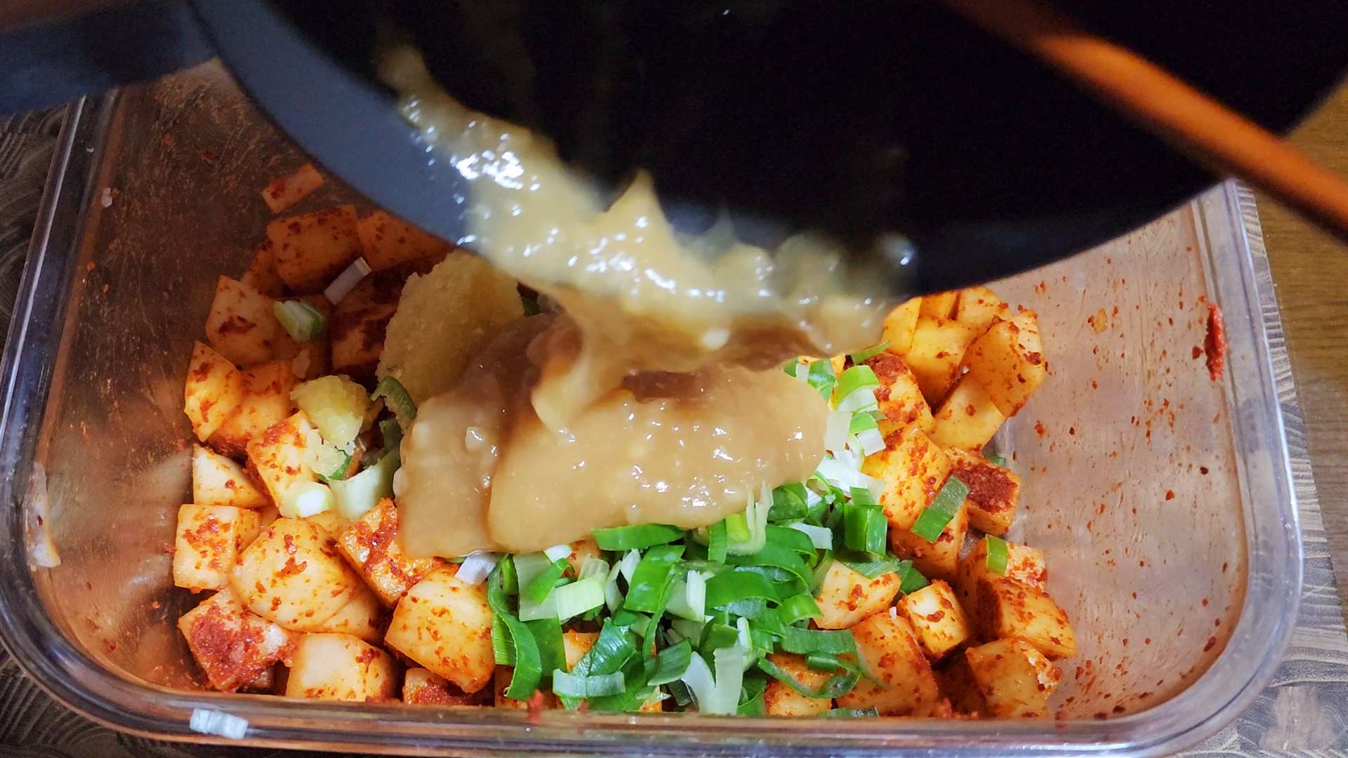대파, 새우젓 1.5T, 새우젓 국물 0.5T, 다진마늘 2T, 다진생강 1/3T, 식힌 배풀을 넣고 섞어줍니다.