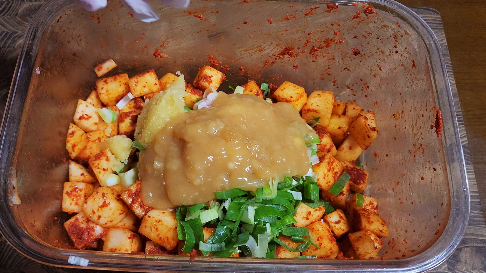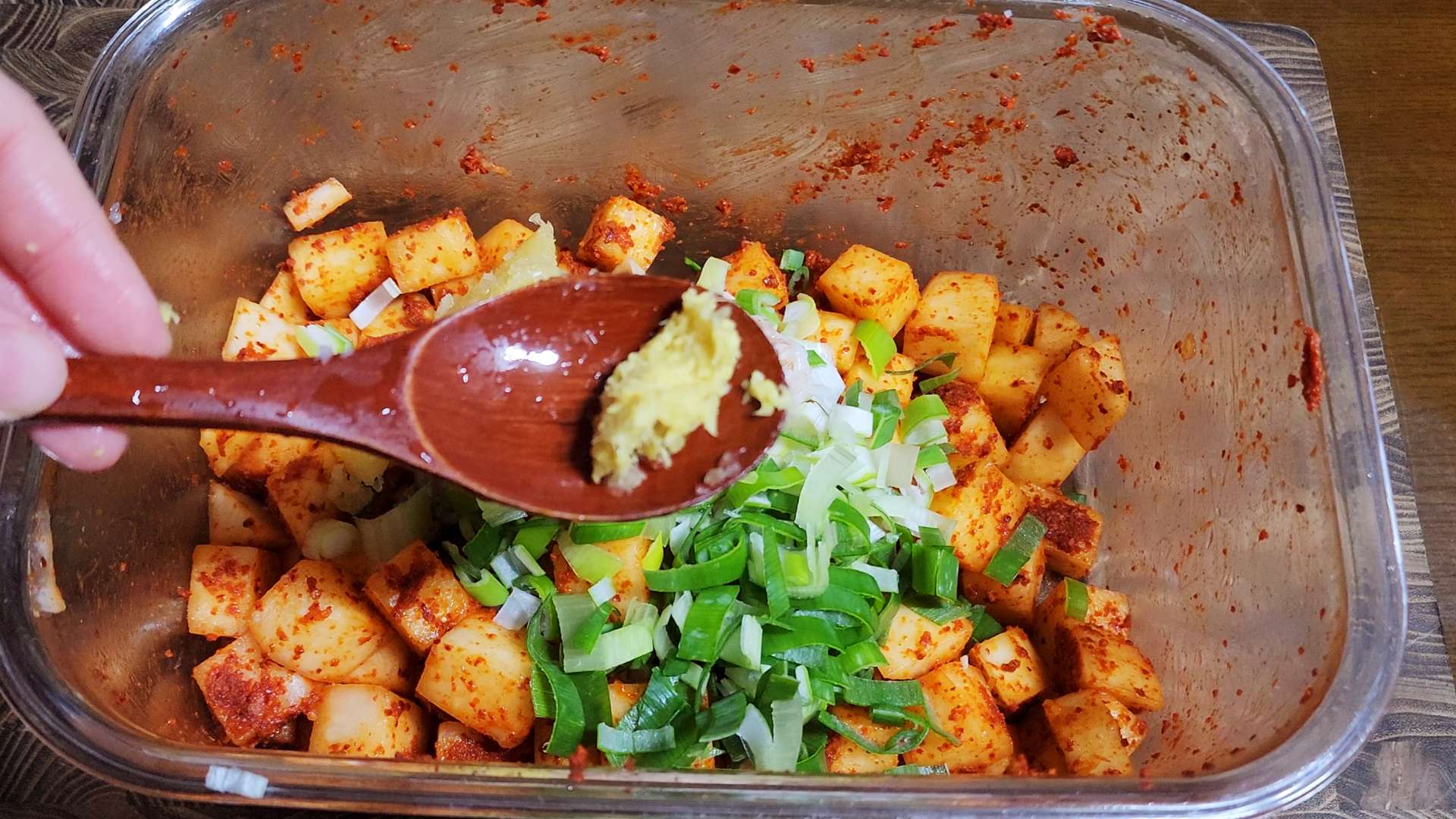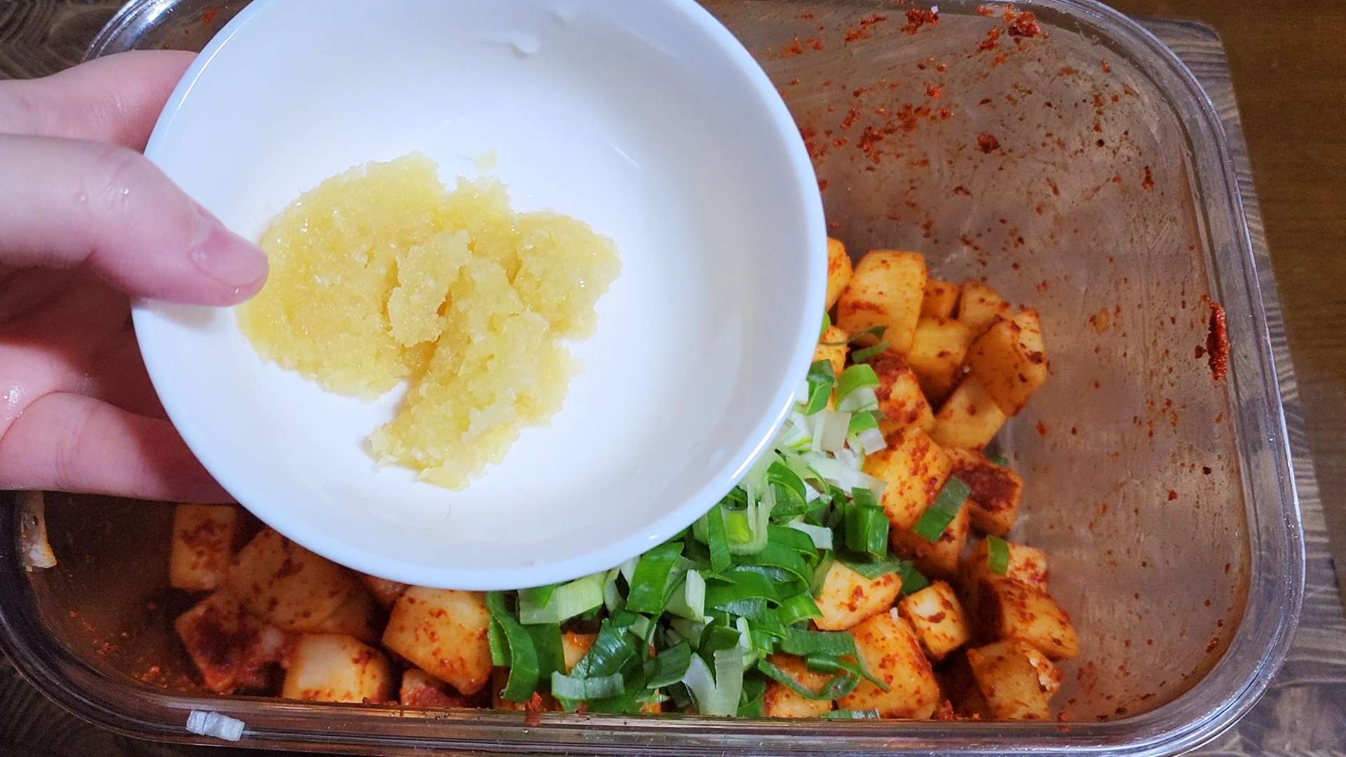 양념: 고춧가루 3T, 새우젓 1.5T, 새우젓 국물 0.5T, 다진마늘 2T, 다진생강 1/3T