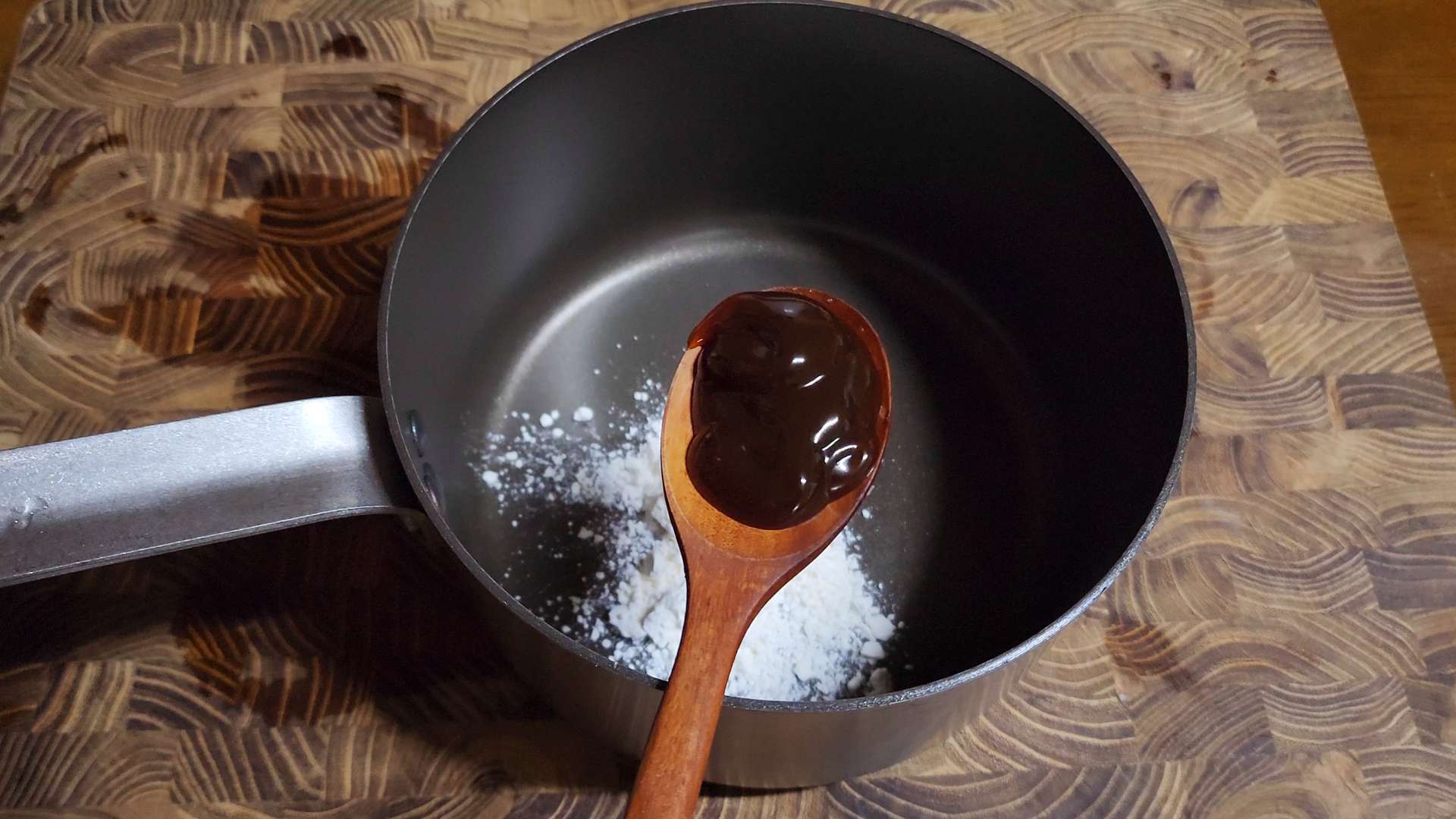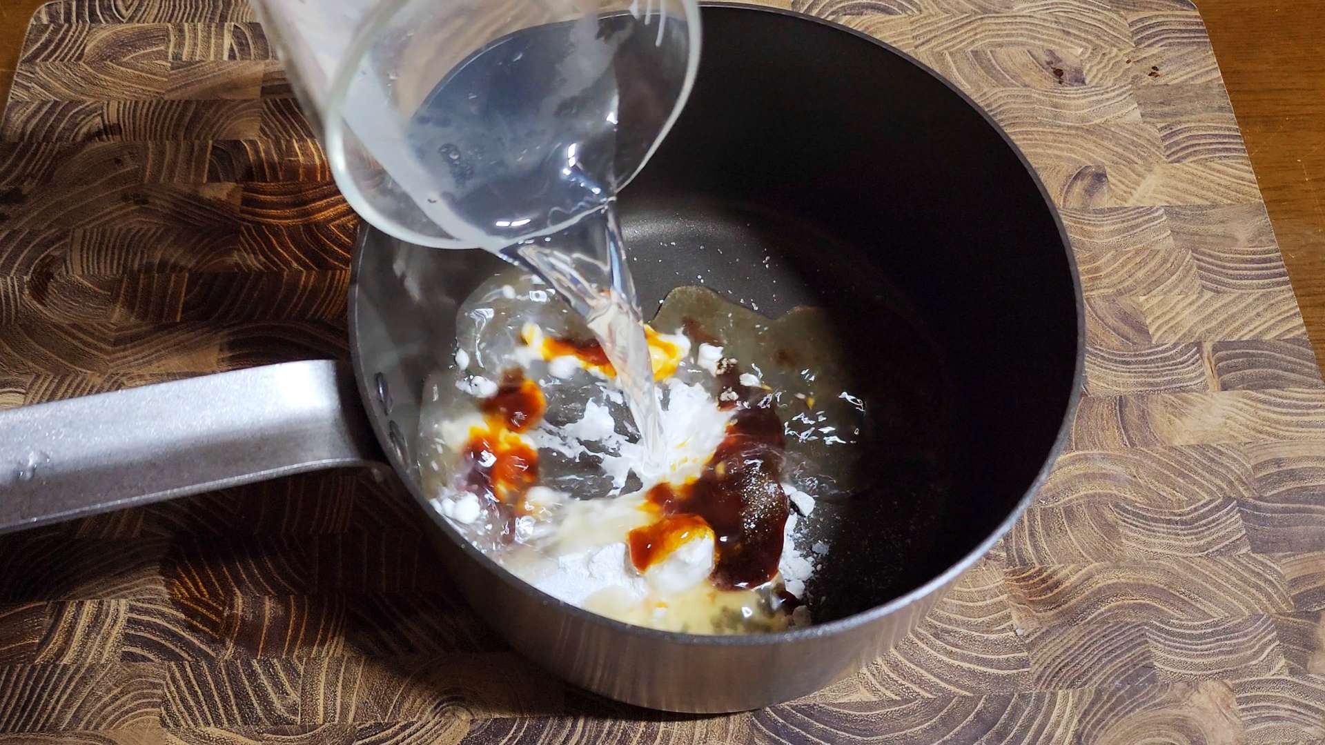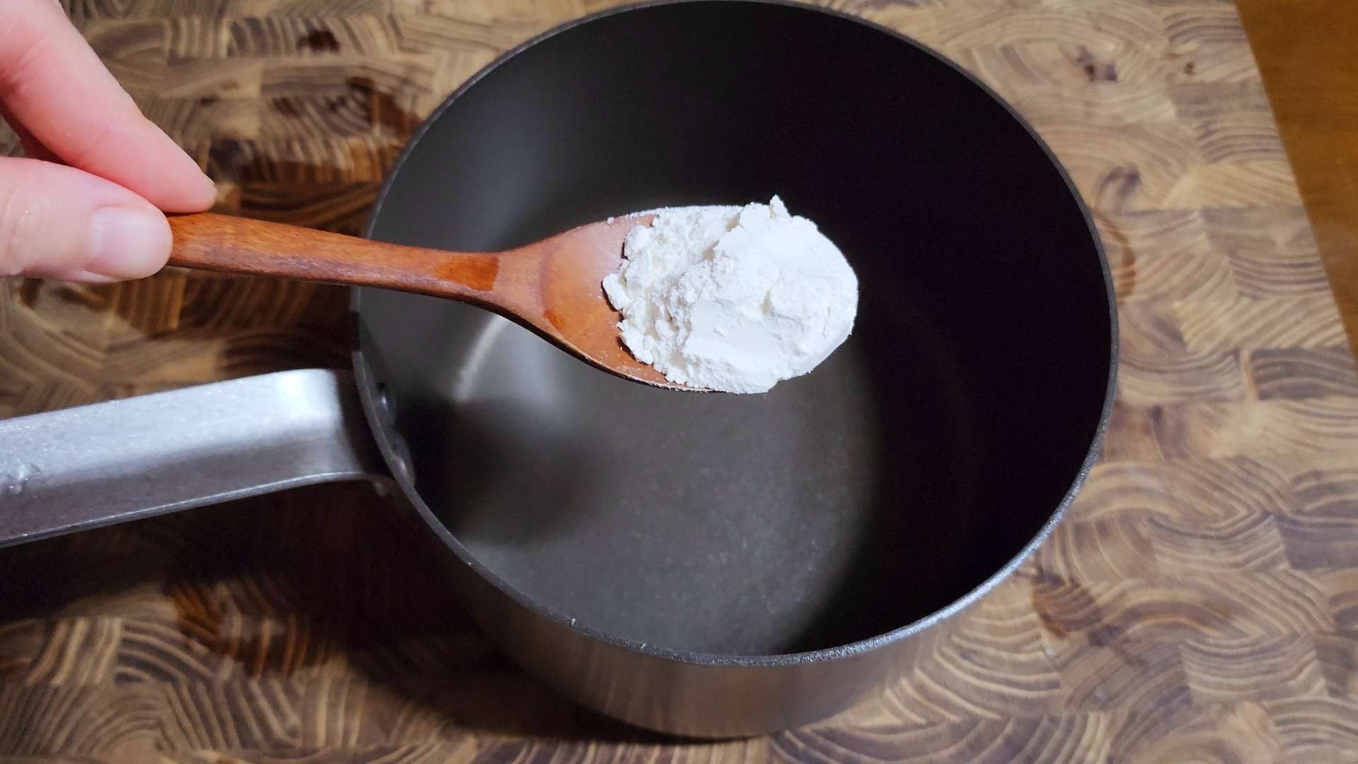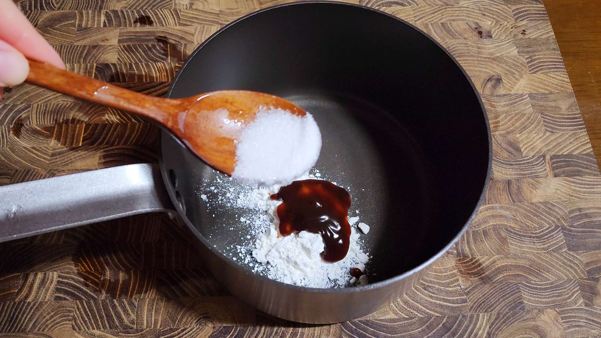냄비에 밀가루 1.5T, 굴소스 듬뿍 1T, 설탕 0.5T,