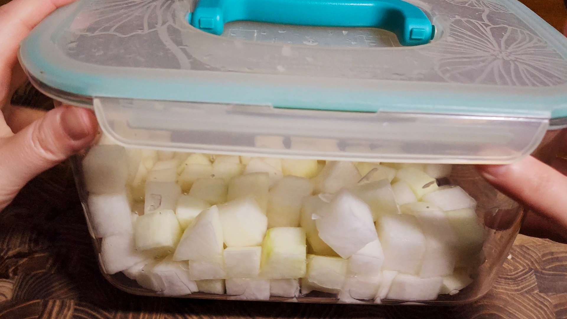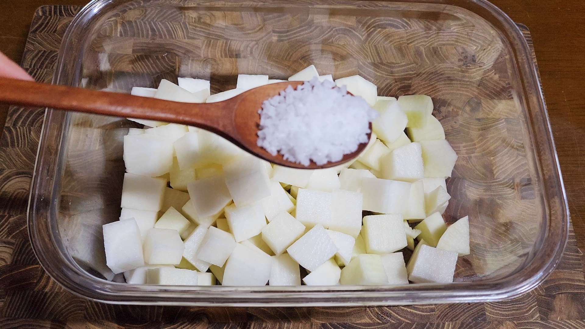 밀폐용기에 무, 굵은소금 1T를 넣고 뚜껑을 닫아 흔들어 1시간 정도 절여줍니다.