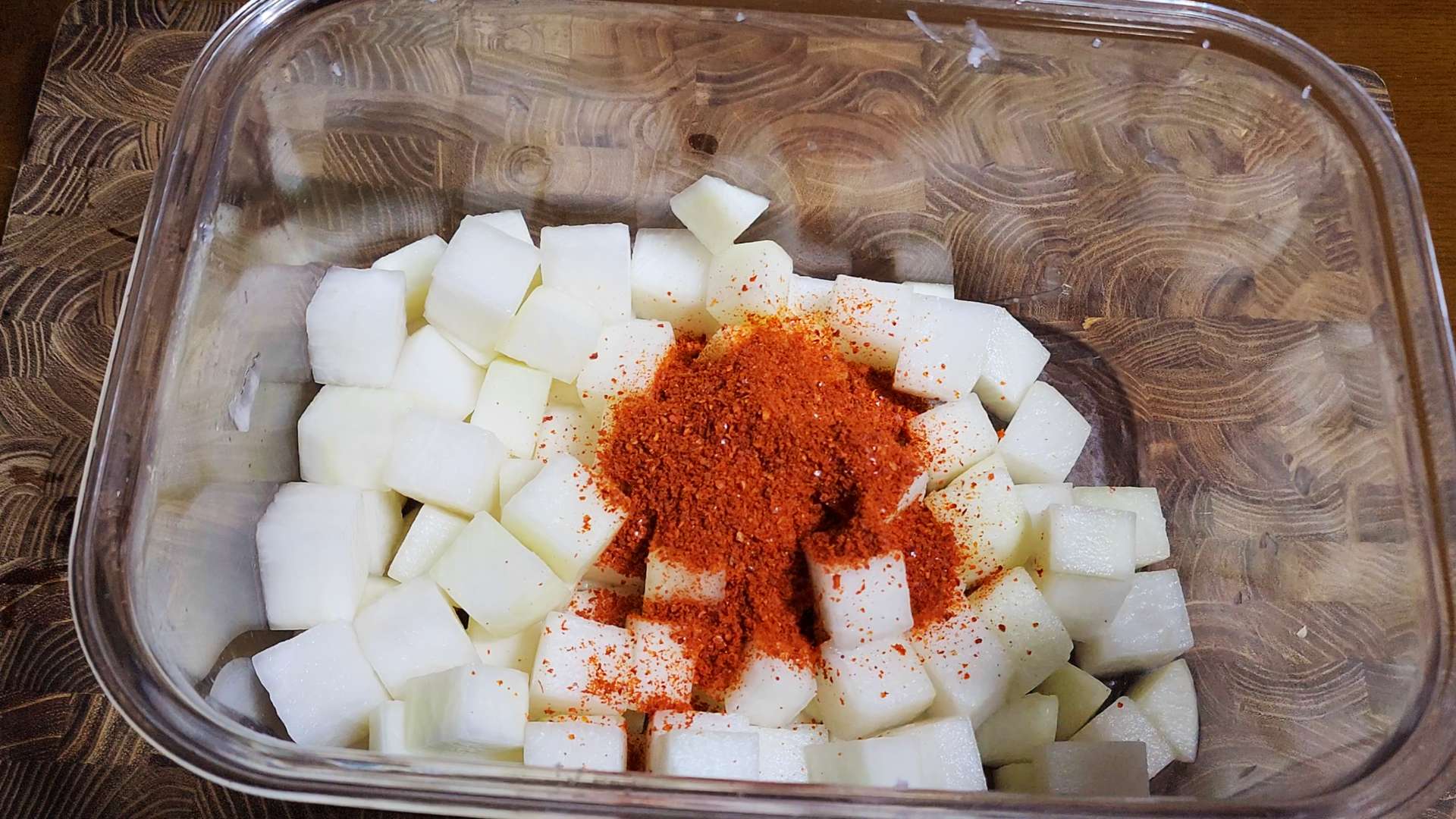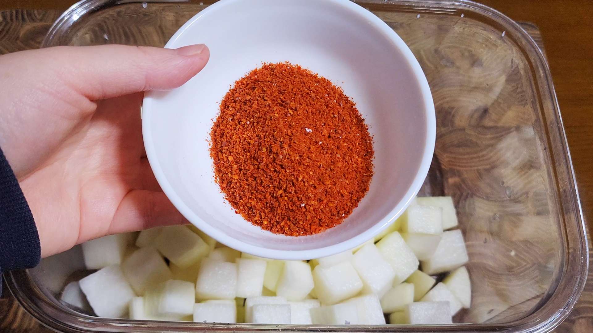 밀폐용기에 절인 무, 고춧가루 3T를 넣고 뚜껑을 닫아 흔들어 섞어줍니다.