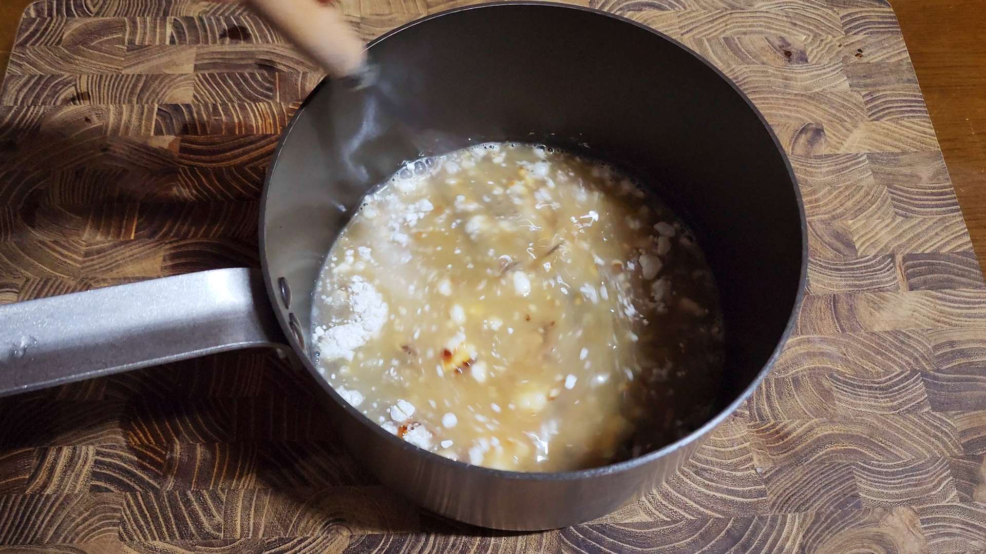 끓기 시작하면 약불로 줄이고 걸쭉해질 때까지 저어가며 끓여줍니다.
