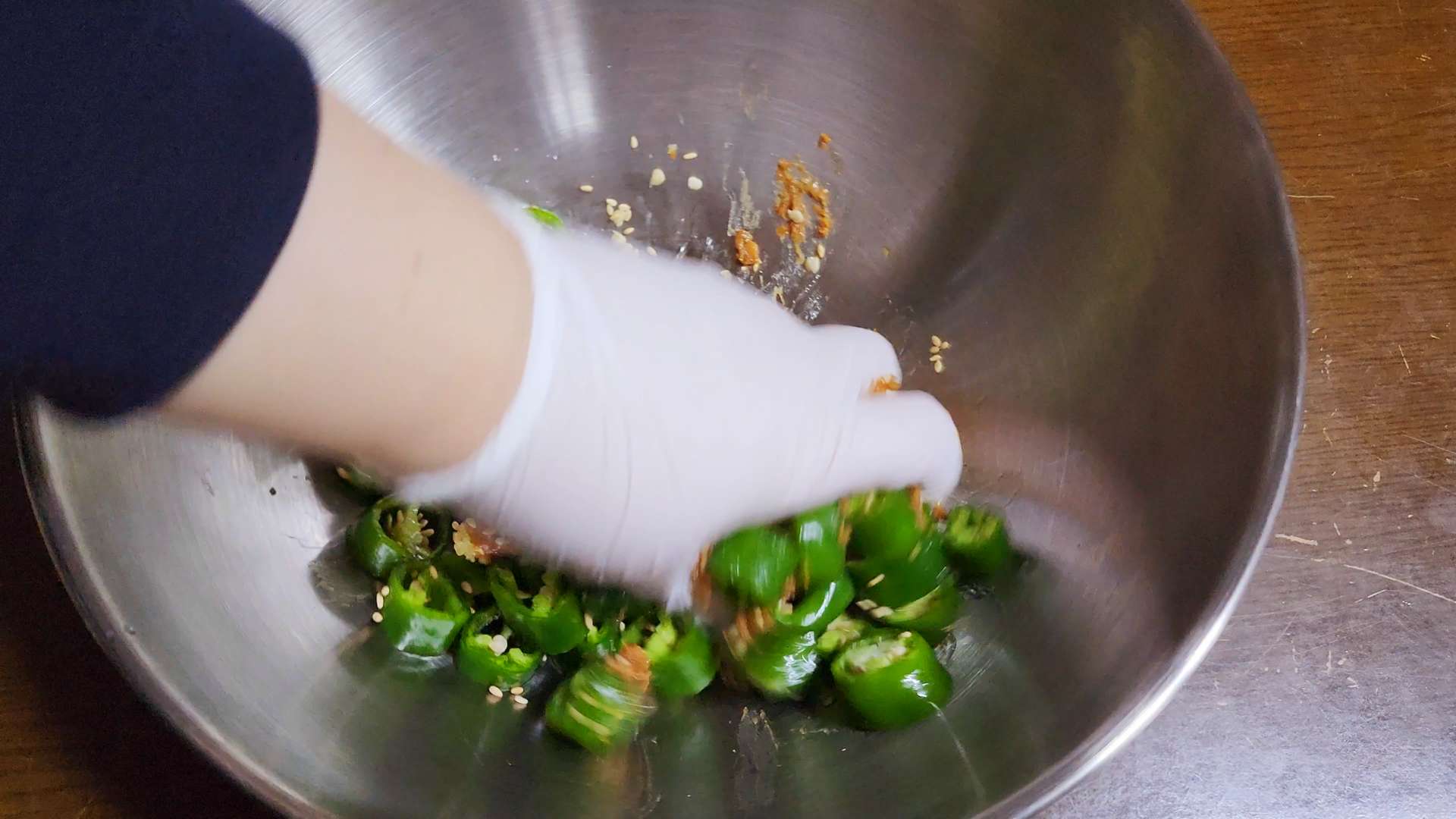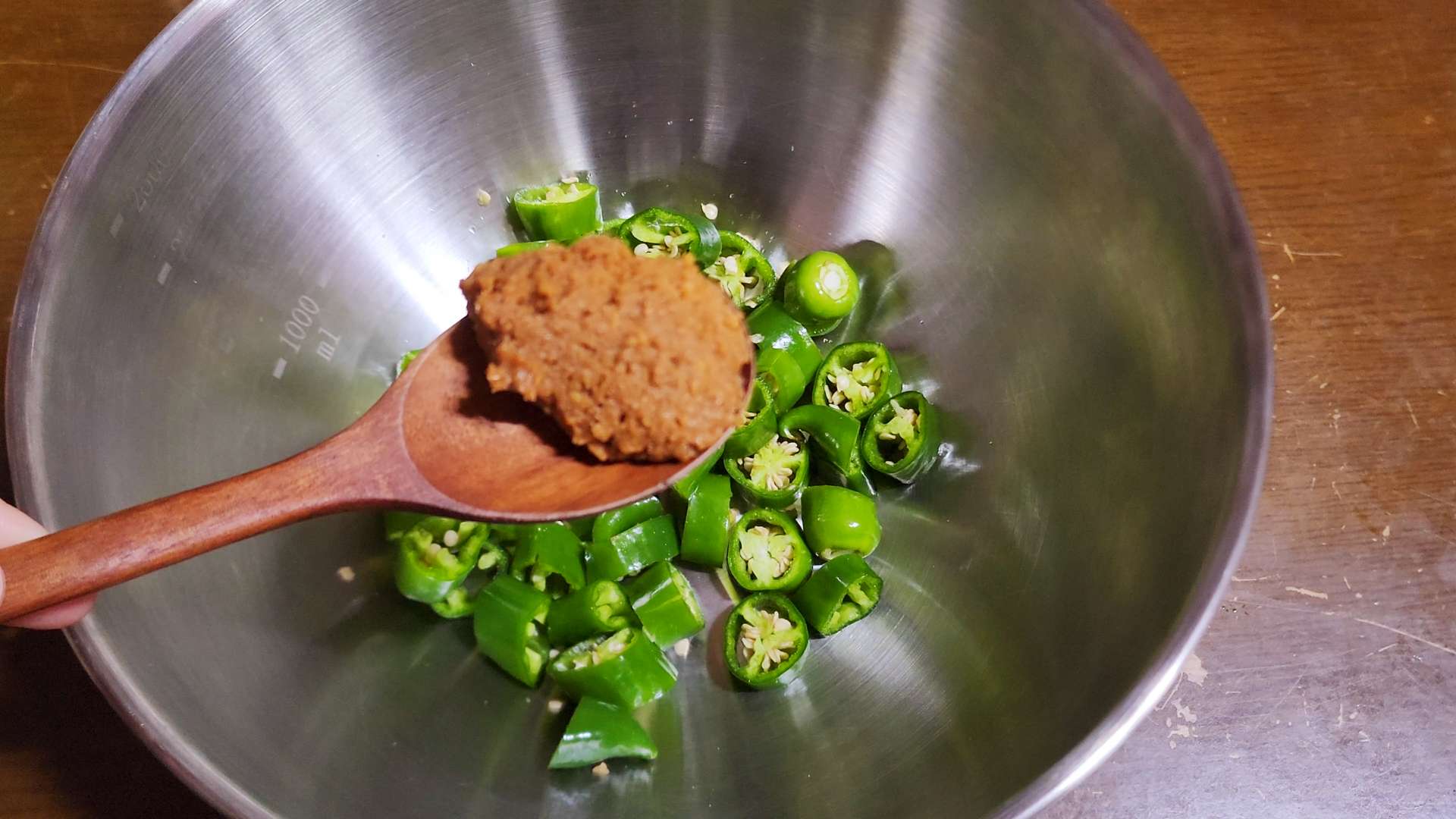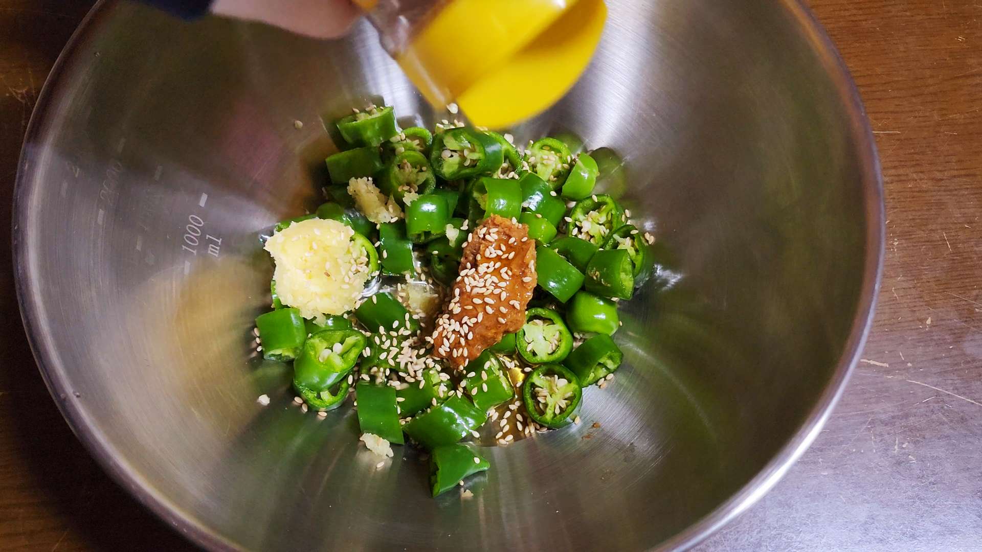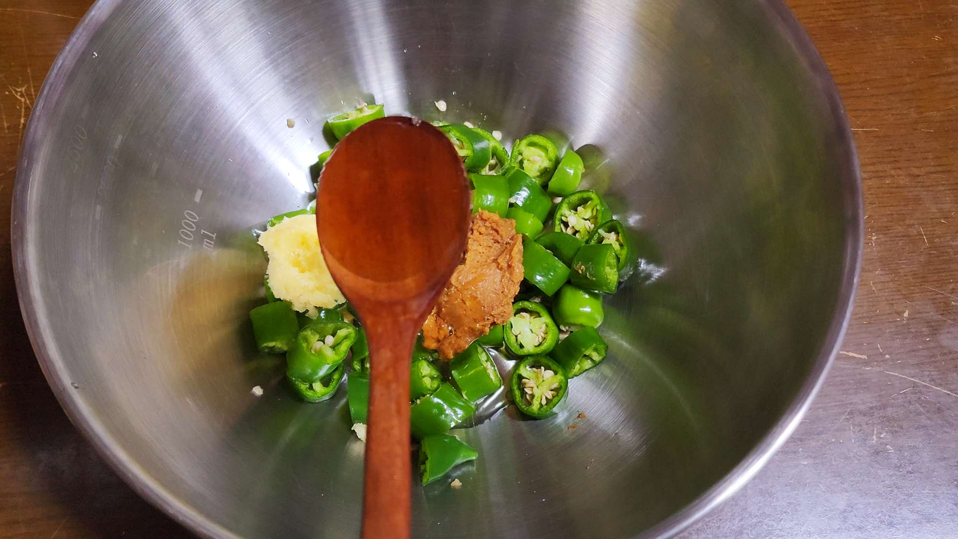오이고추, 된장 1T, 물엿 1T, 다진마늘 1T, 참기름 1T, 통깨 넣고 버무려줍니다.