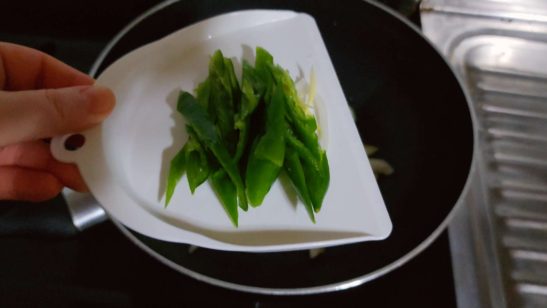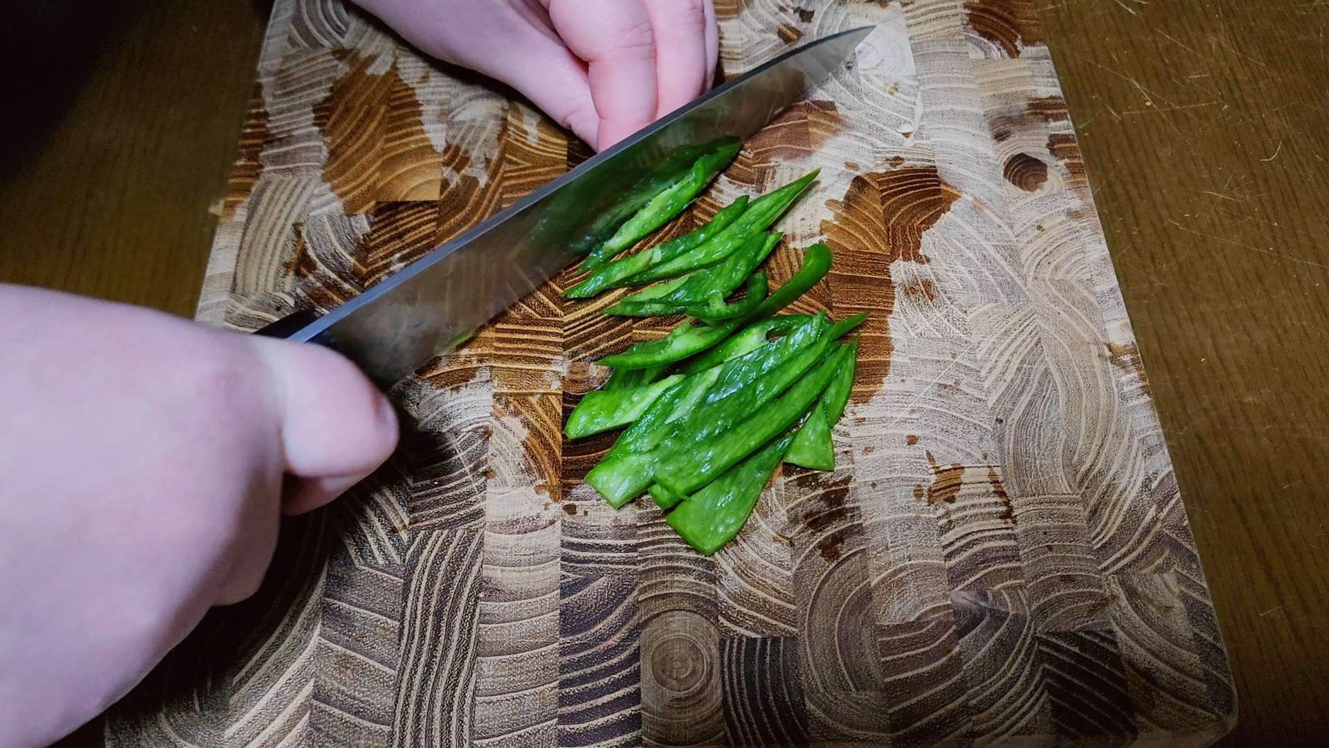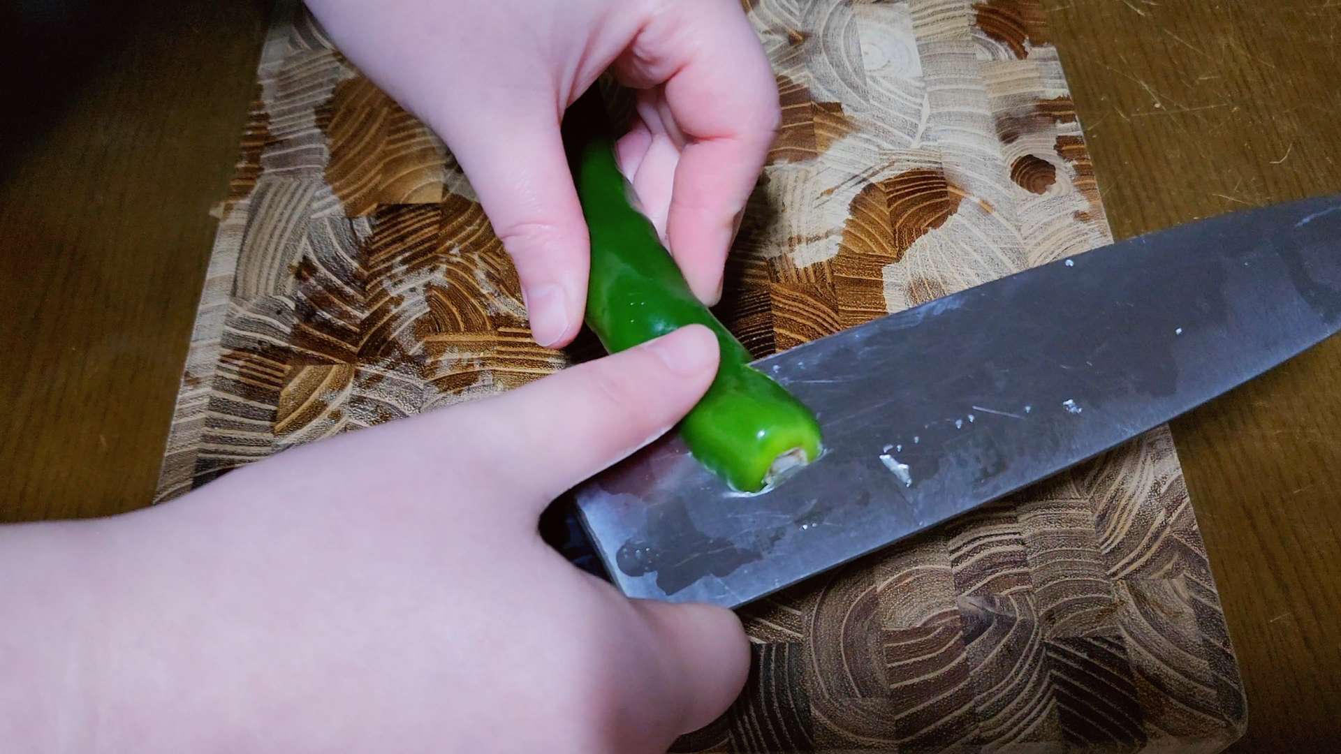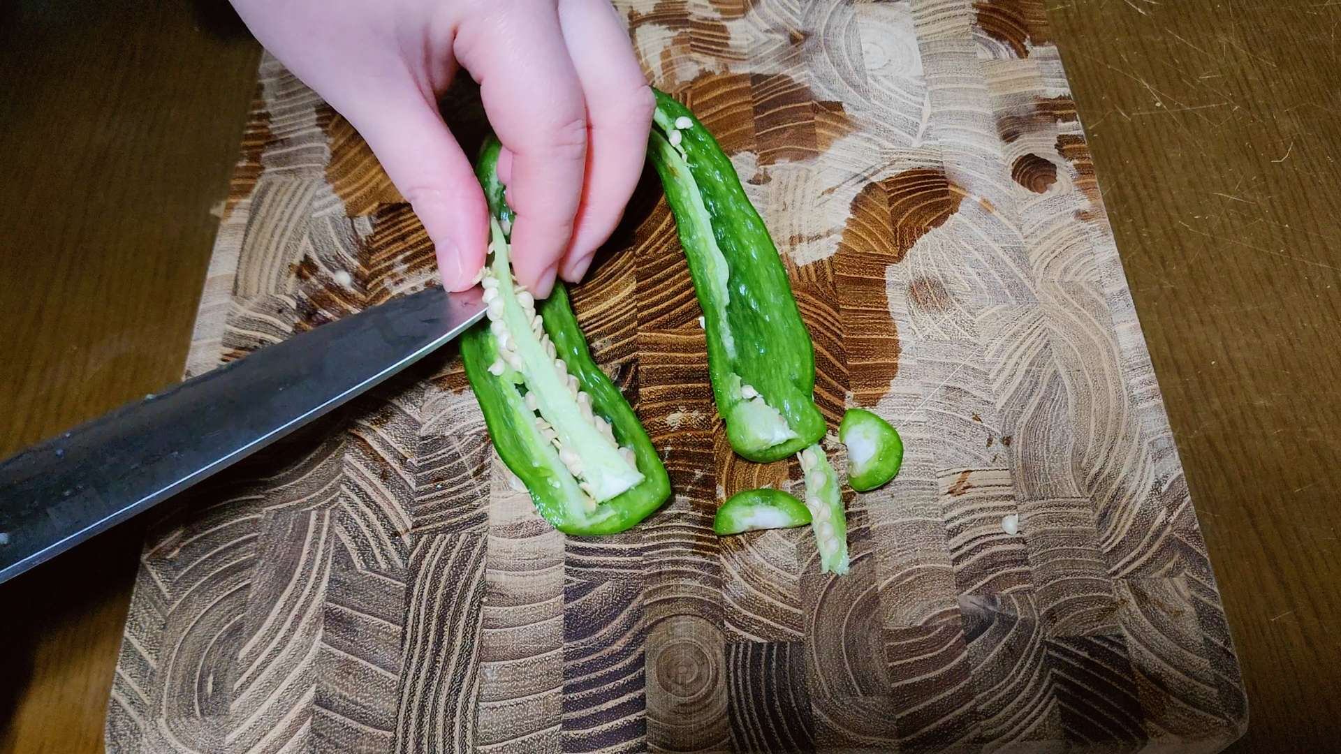 풋고추는 반으로 잘라 씨를 제거하고 채썰어 줍니다.
