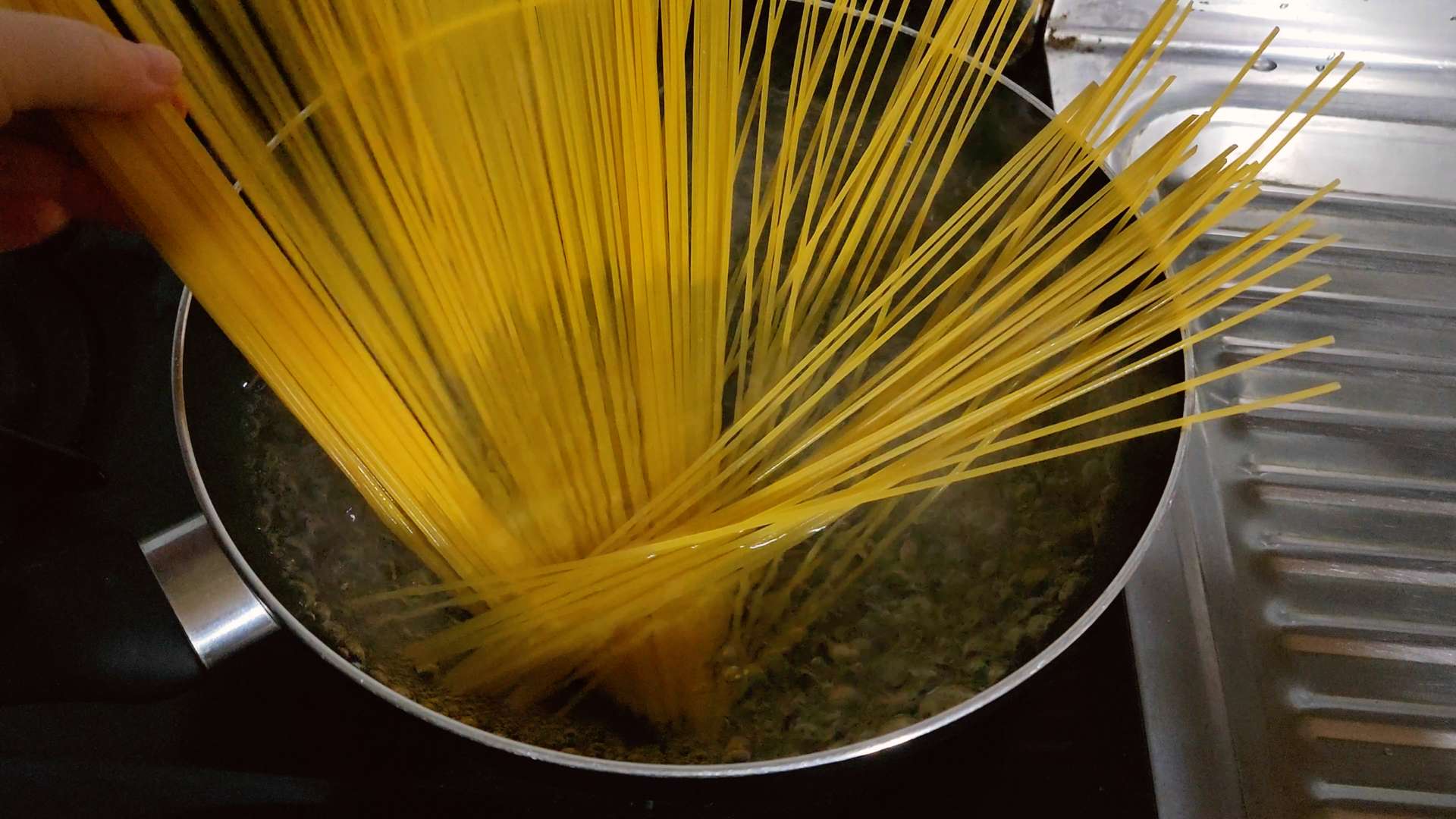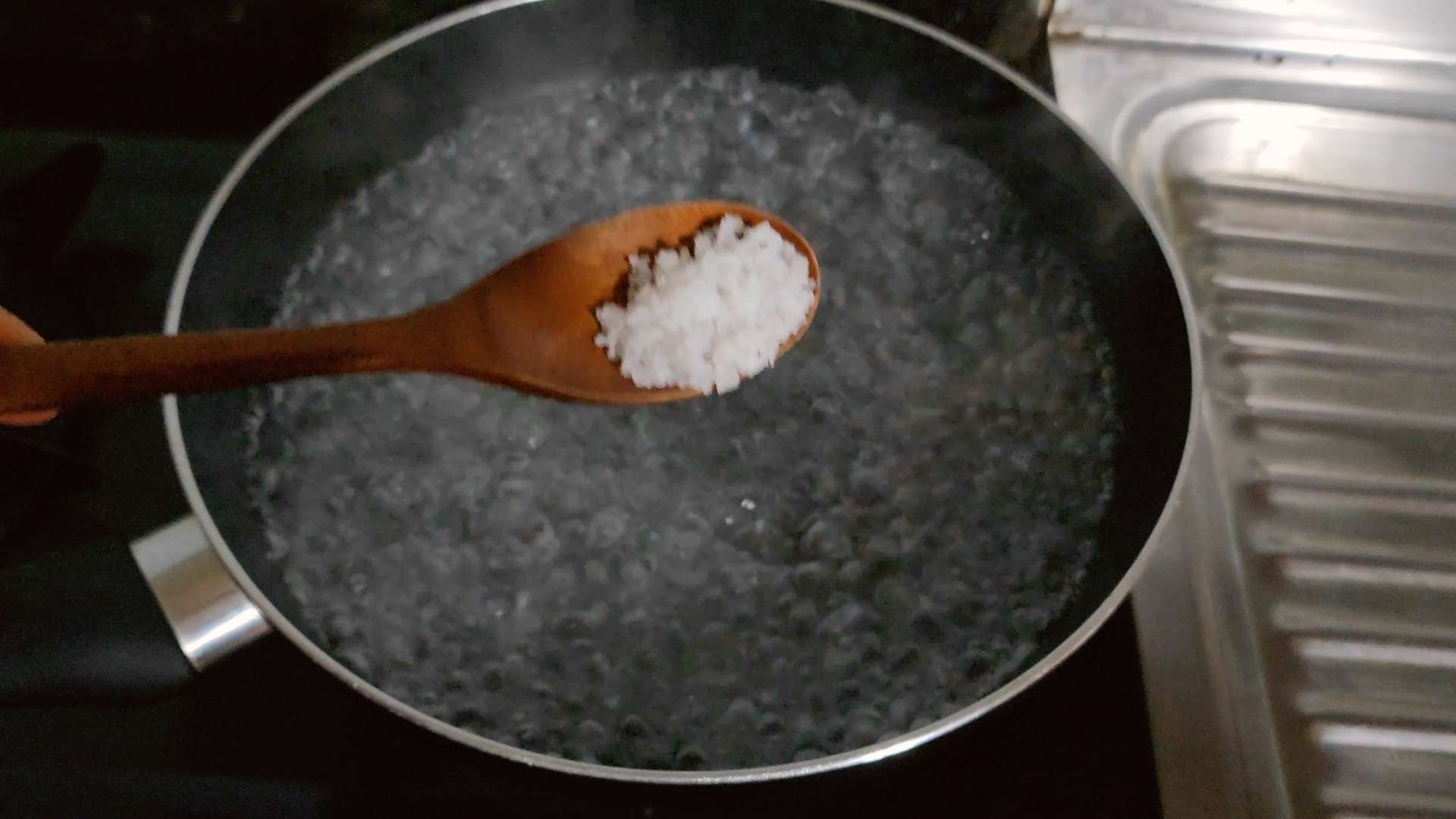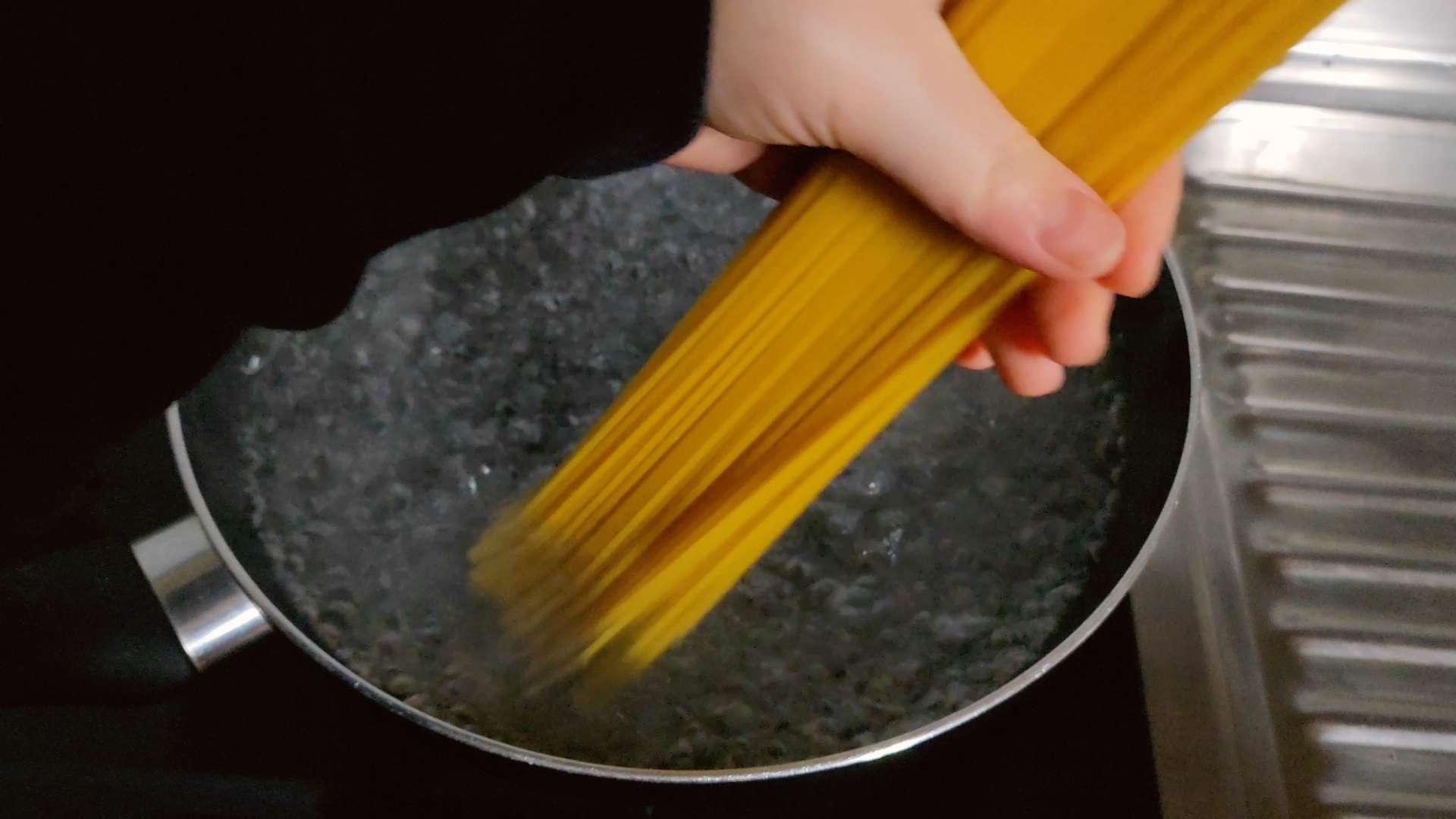 끓는물에 굵은소금 1/2T, 스파게티면 100g을 넣고