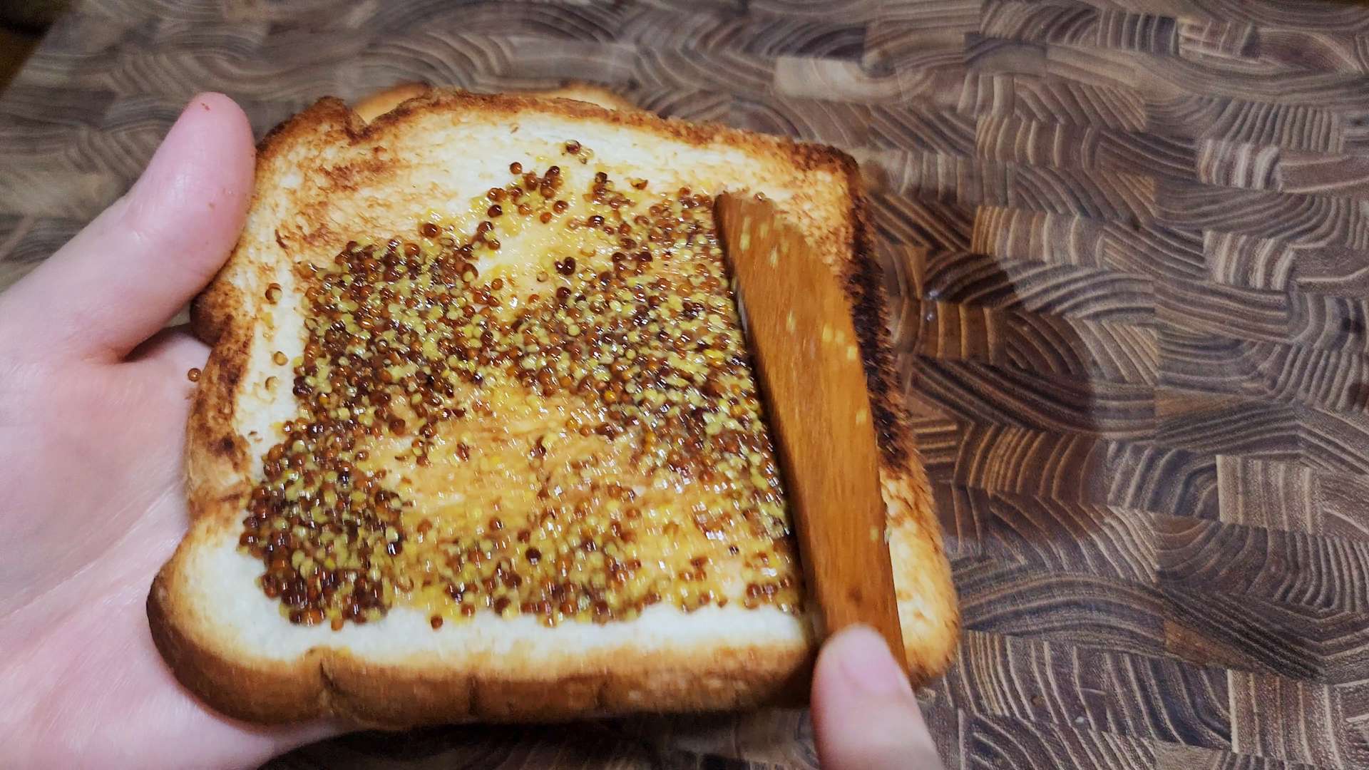 다른 식빵 한쪽 면에 씨겨자를 발라줍니다.