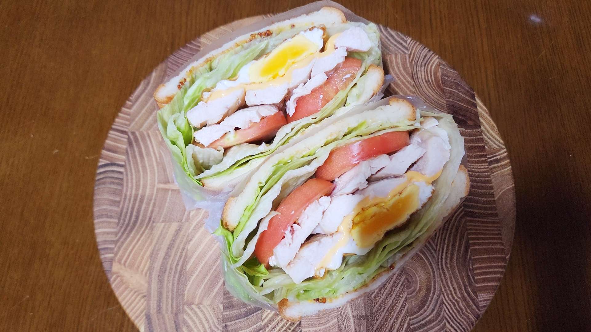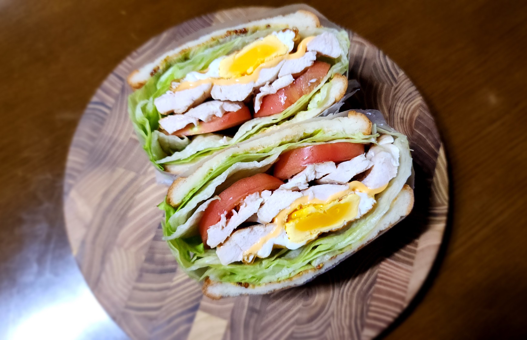 재료: 식빵 2장, 닭가슴살 1덩어리, 달걀 1개, 토마토 1개, 양상추 4장, 슬라이스 체다치즈 1장, 마요네즈, 씨겨자, 소금, 식용유