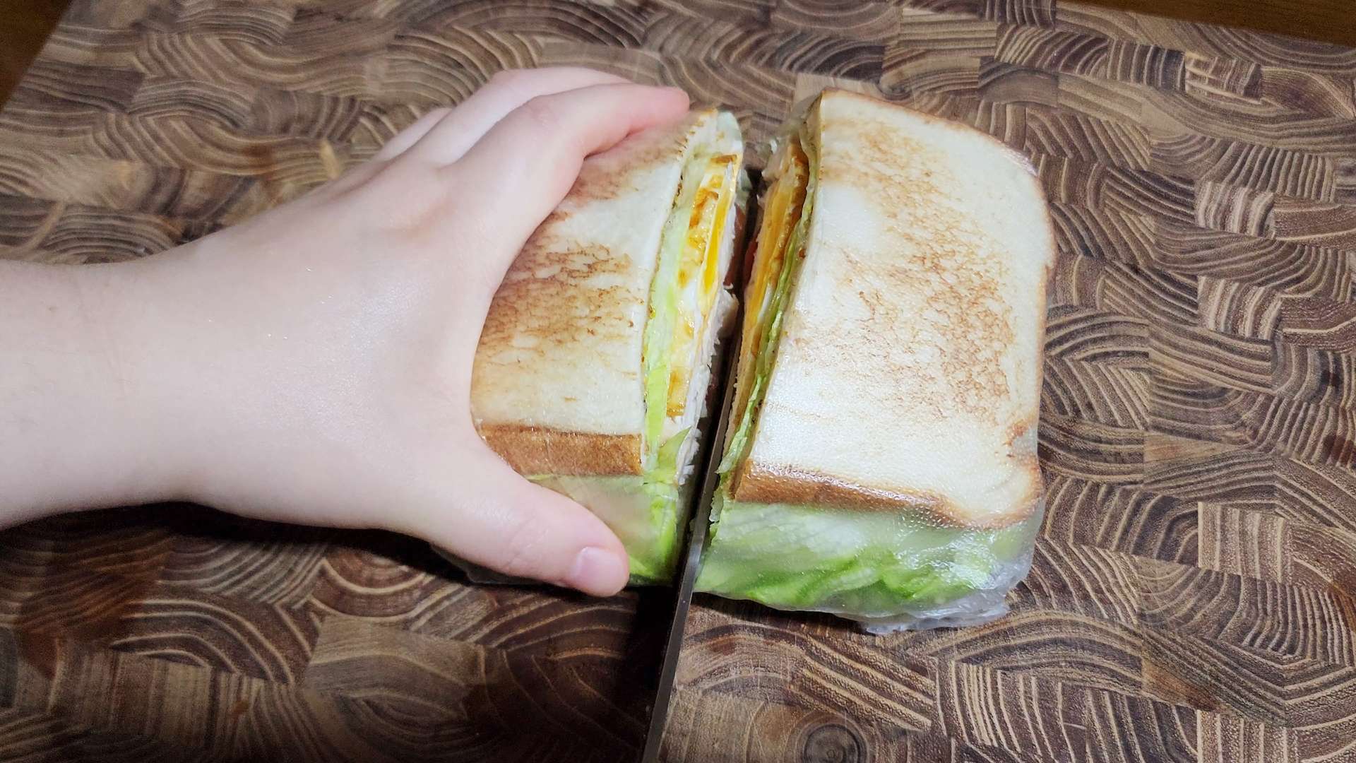 랩으로 감싸고 반으로 잘라줍니다.