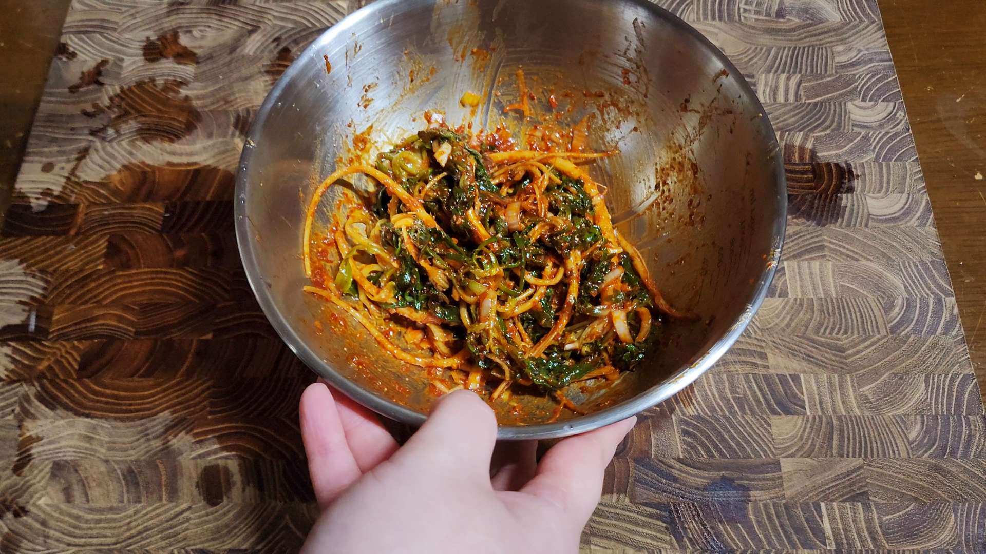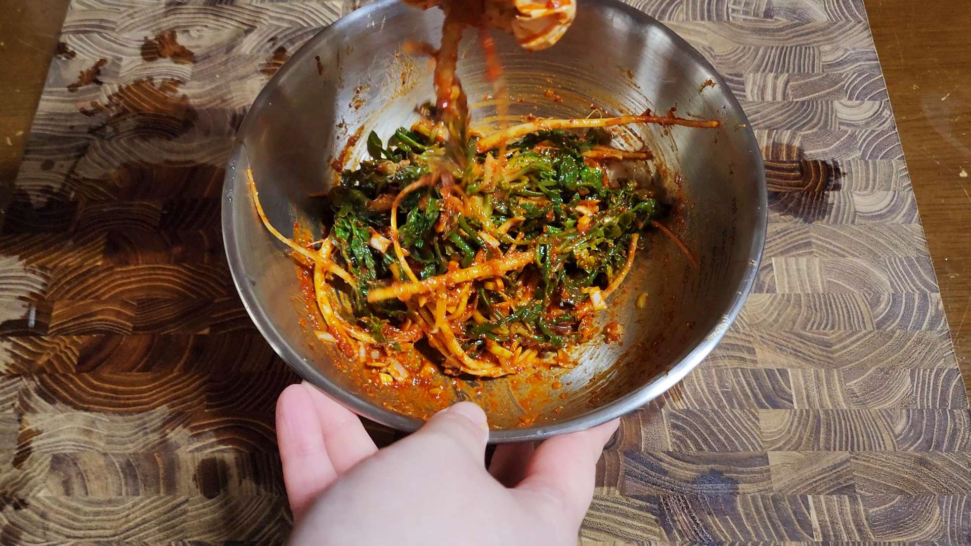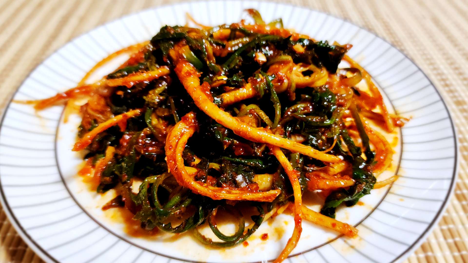 양념: 고춧가루 0.5T, 매실액 2T, 고추장 1T,
