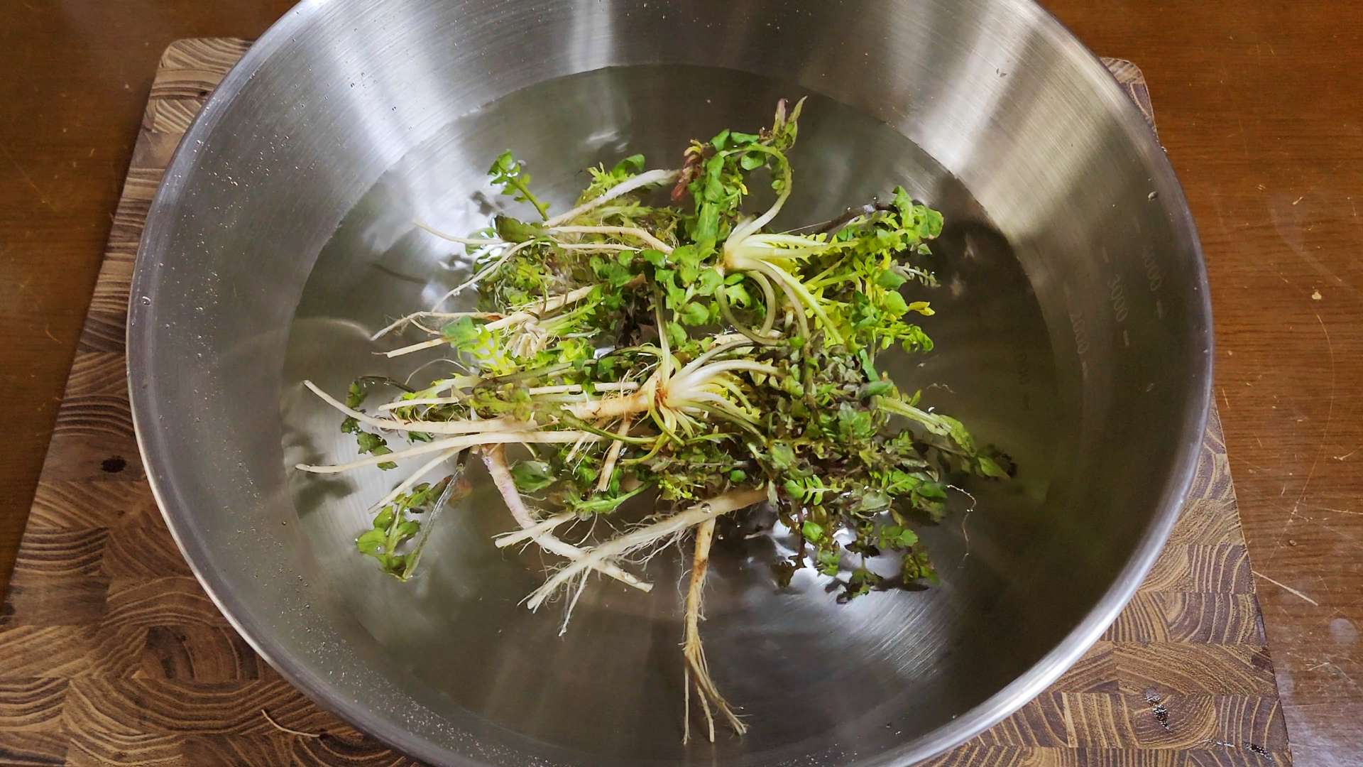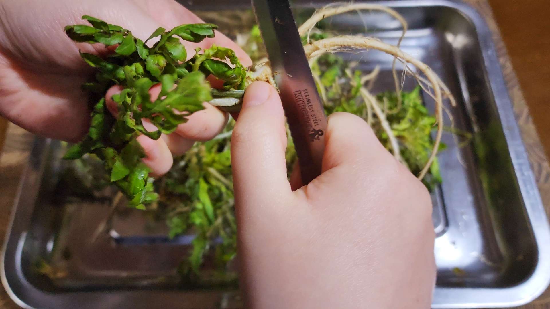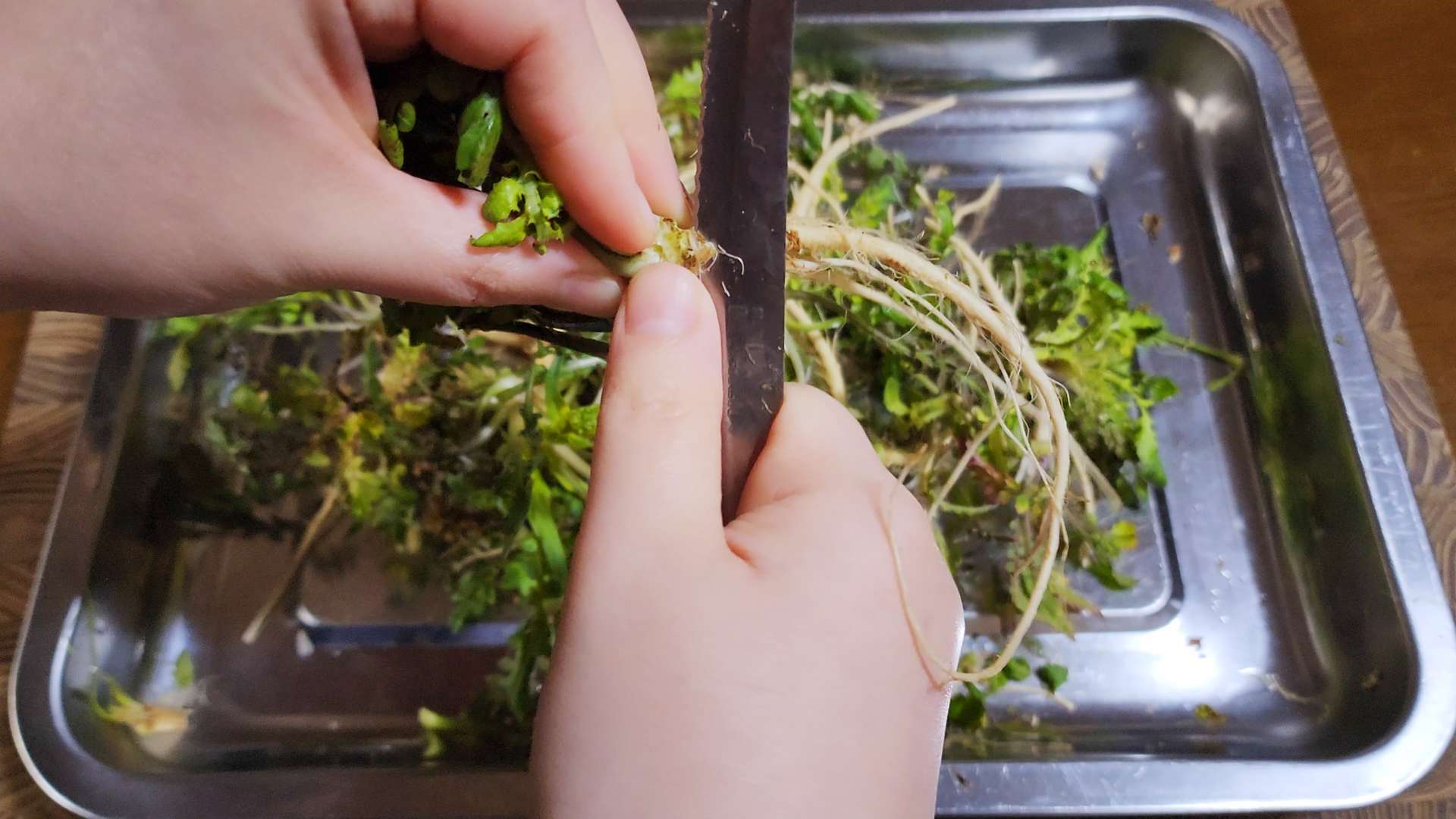 냉이는 뿌리와 잎 사이를 칼로 긁어줍니다.