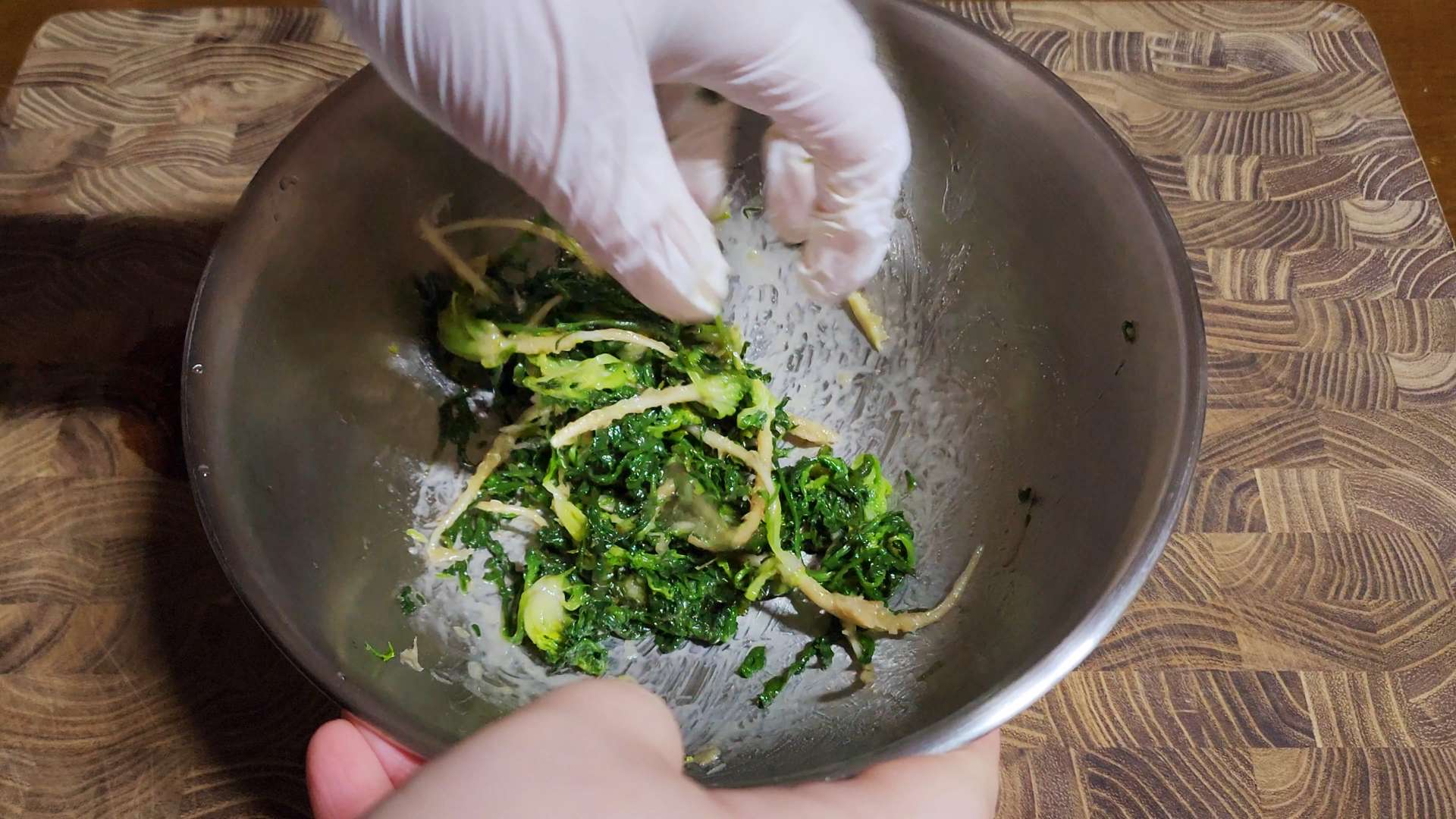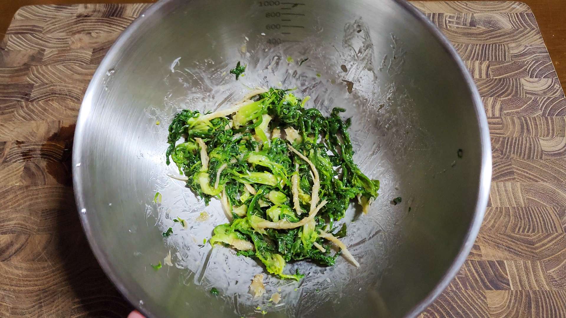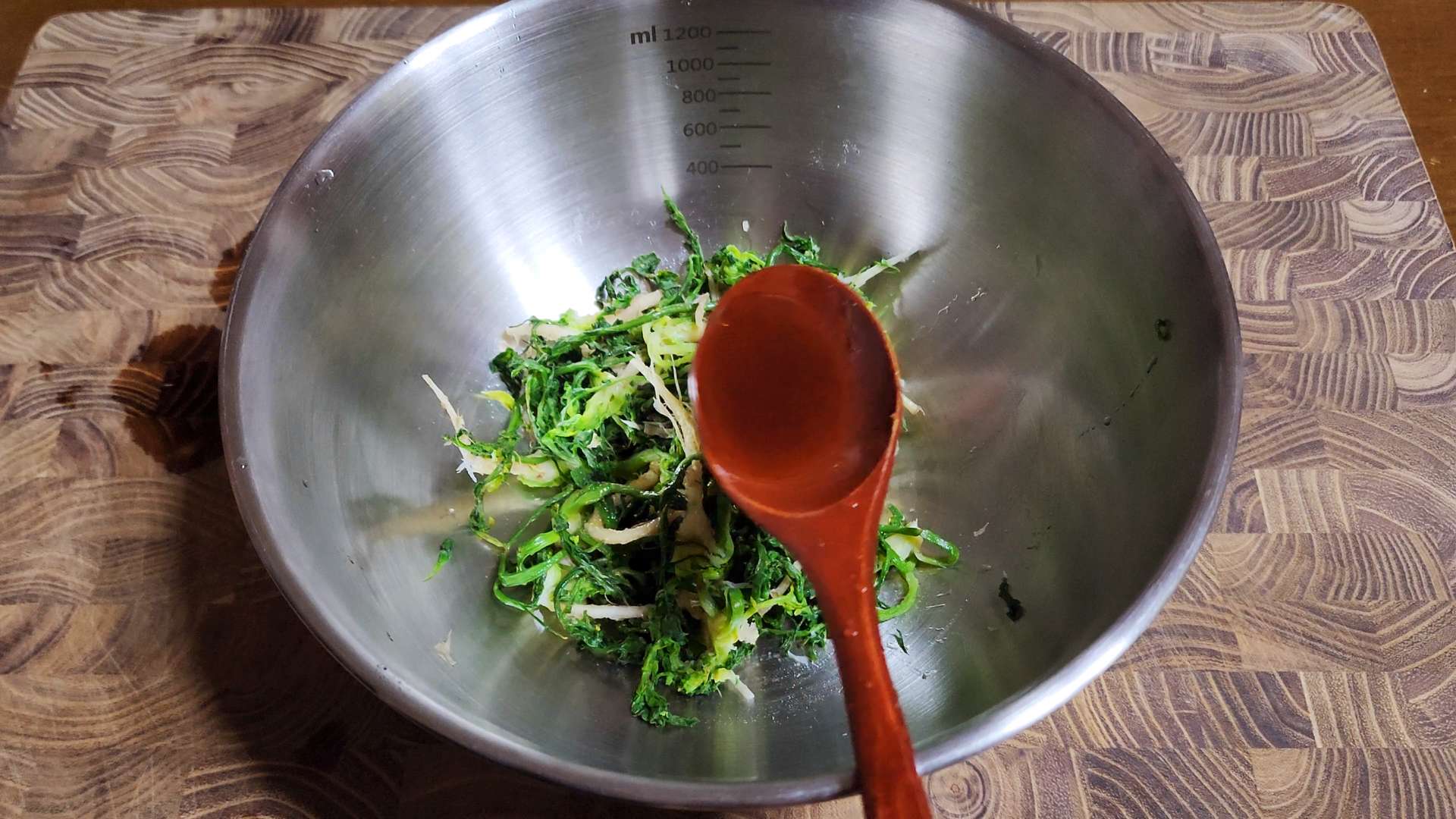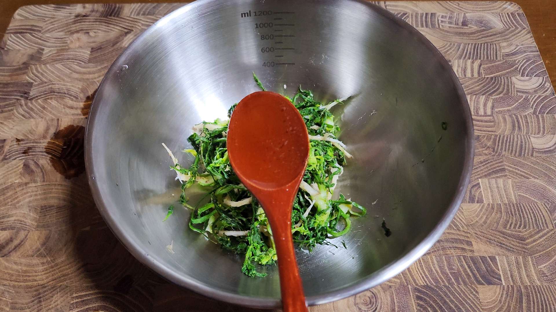냉이, 들기름 1T, 멸치액젓 0.7T 넣고 무쳐줍니다.