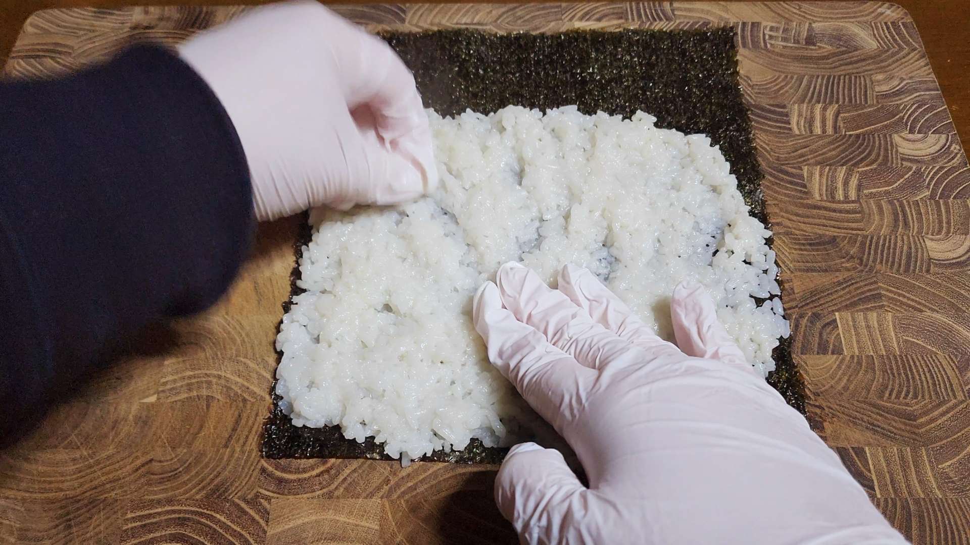 김밥김 거친면에 밥 반공기를 올려 펴줍니다.