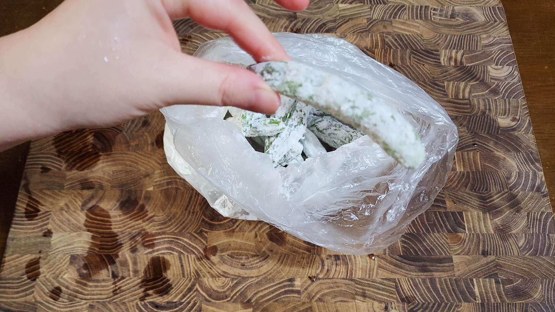 위생백에 꽈리고추, 밀가루 3T를 넣고 흔들어 밀가루를 골고루 묻혀줍니다.