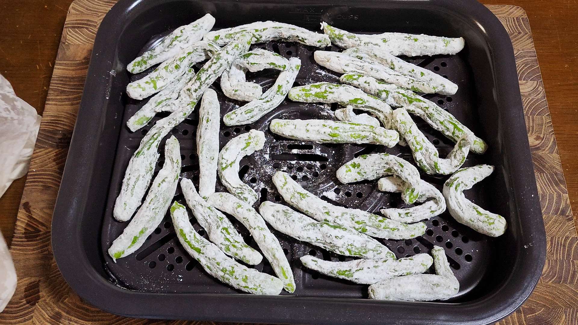밀가루 묻힌 꽈리고추를 올려줍니다.