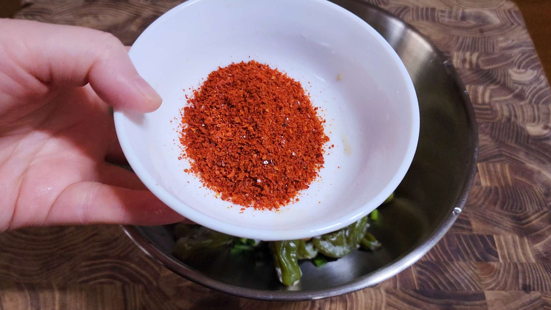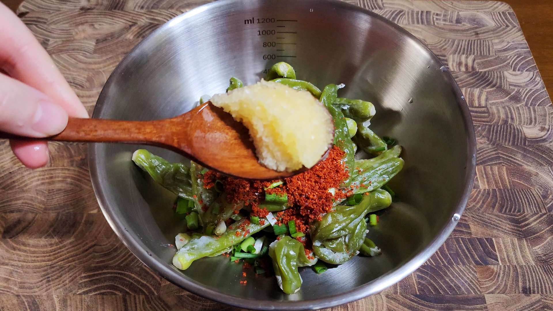 양념: 멸치액젓 2T, 국간장 1T, 고춧가루 2T, 다진마늘 1T, 참기름 2T, 통깨