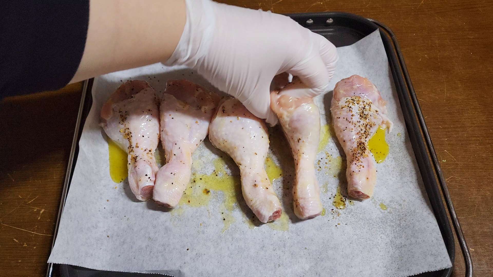 베이킹 트레이에 종이호일을 깔고 씻은 닭다리를 올려줍니다.