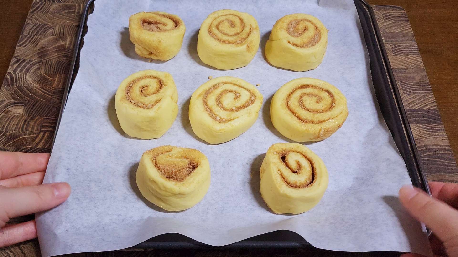 베이킹 트레이에 종이호일을 깔고 시나몬롤을 올려줍니다.