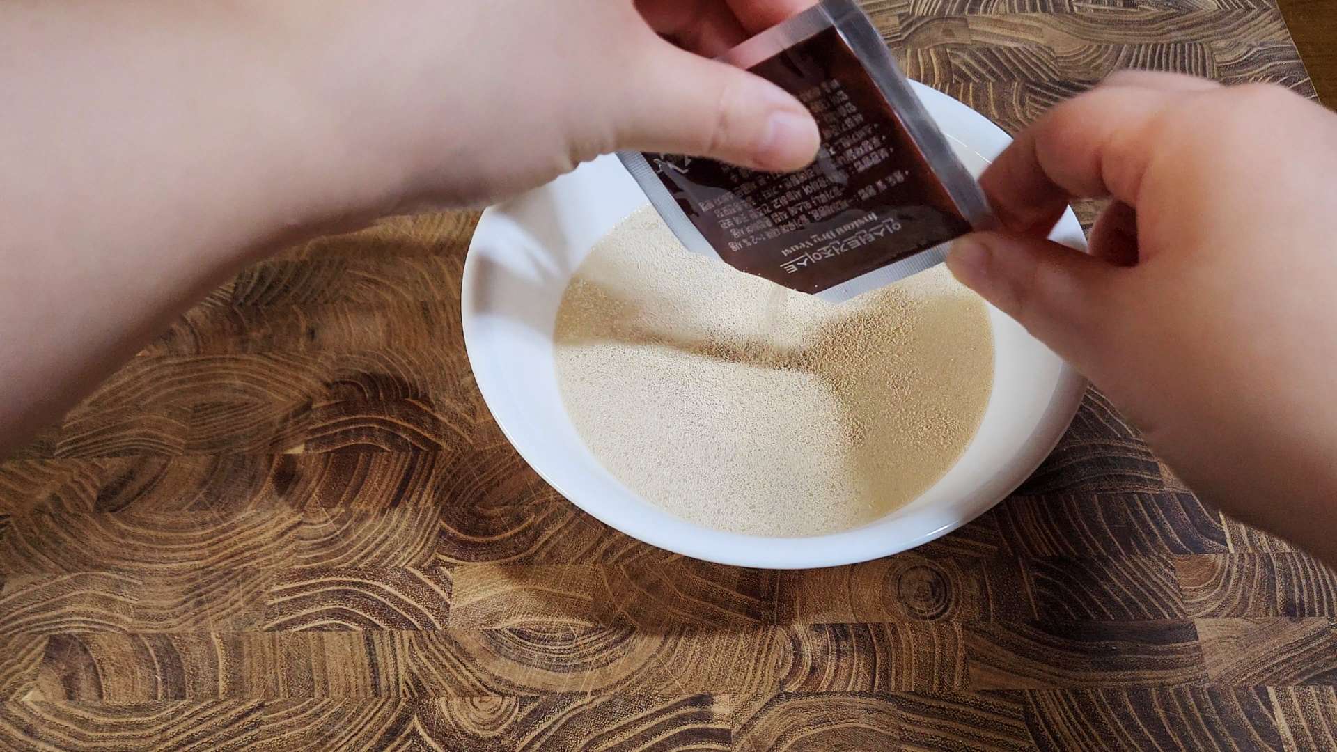 따뜻한물 160ml에 이스트를 넣고 주걱으로 골고루 저어줍니다.