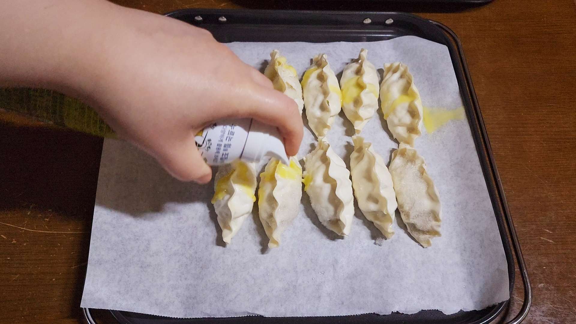 바삭한 군만두를 만들기 위해 식용유를 뿌려줍니다.