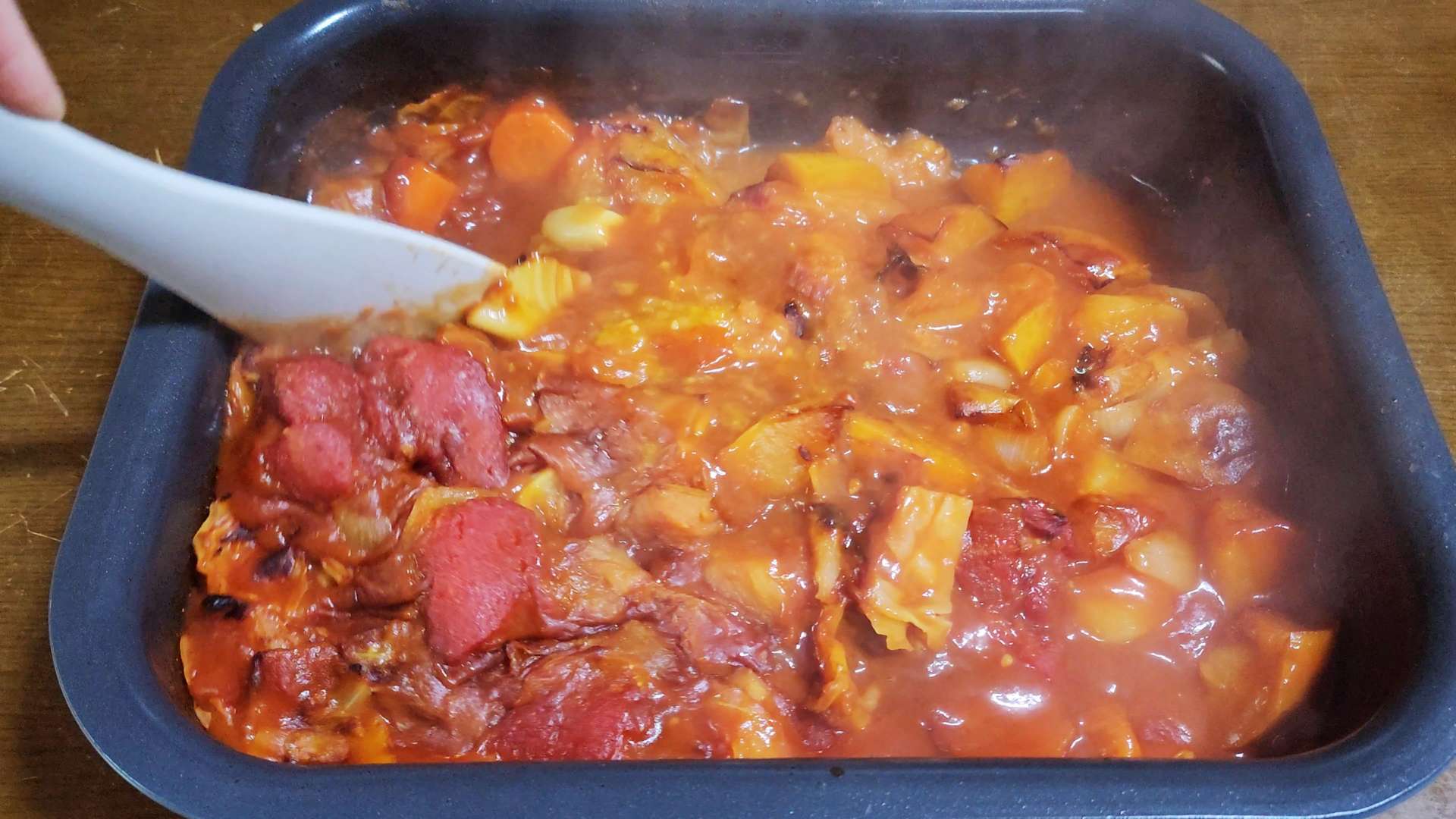 콤비팬에 양배추, 당근, 감자, 양파, 토마토, 사과, 마늘을 넣어줍니다.