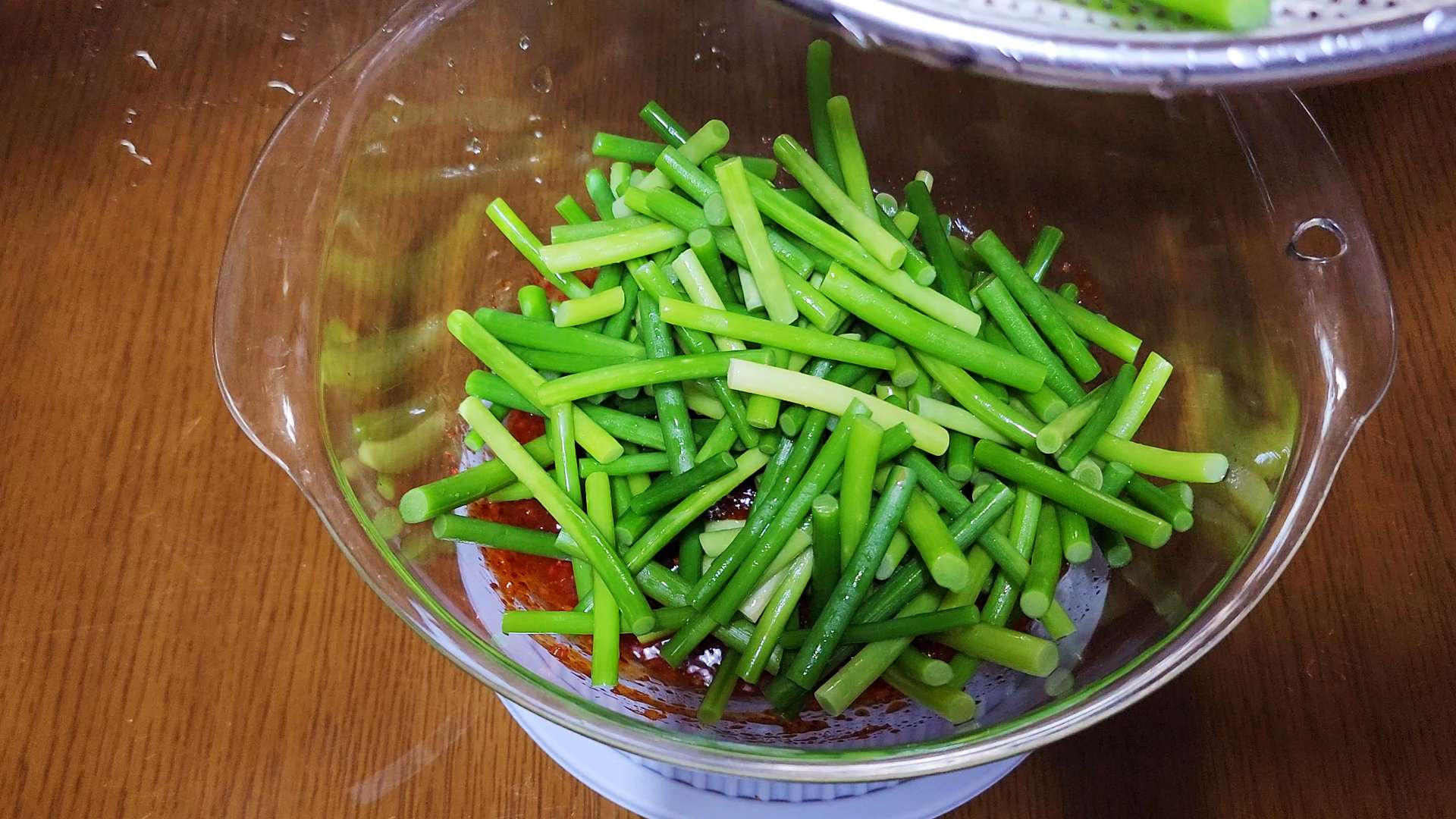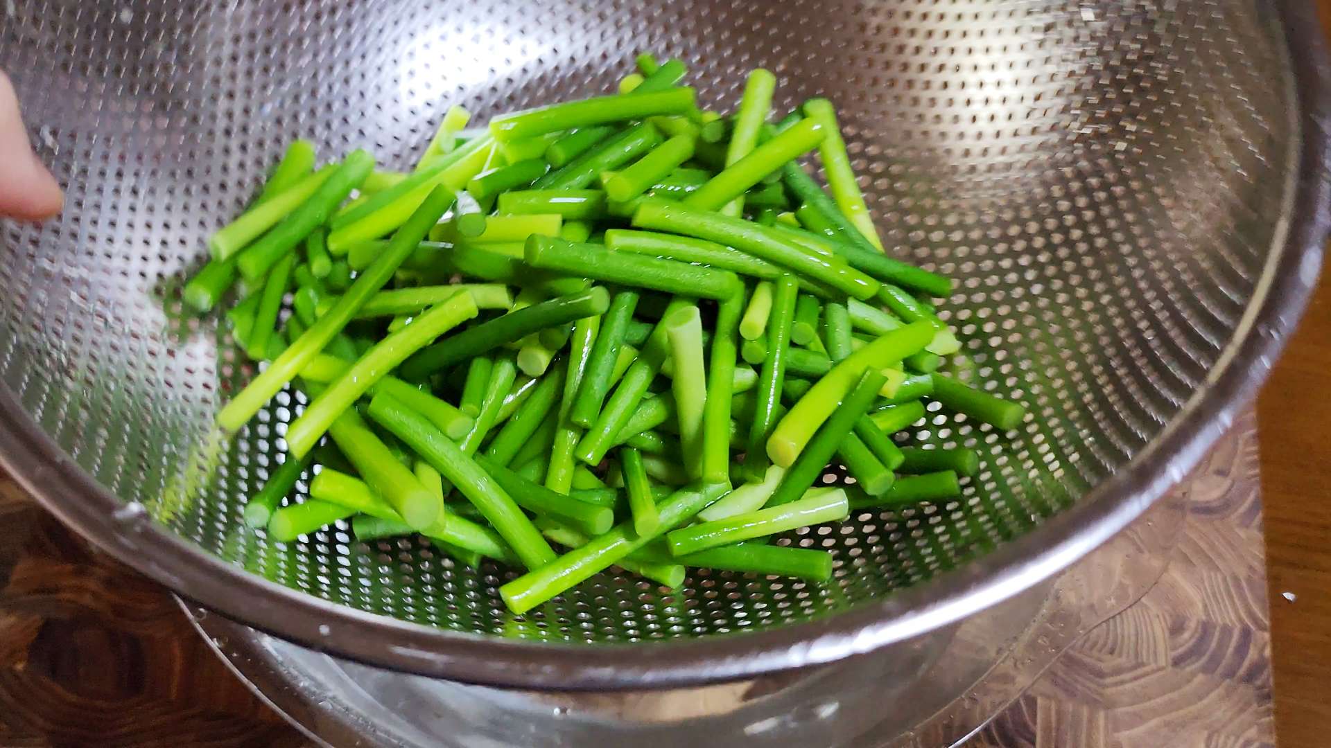 데친 마늘쫑은 찬물에 헹궈 물기를 빼줍니다.