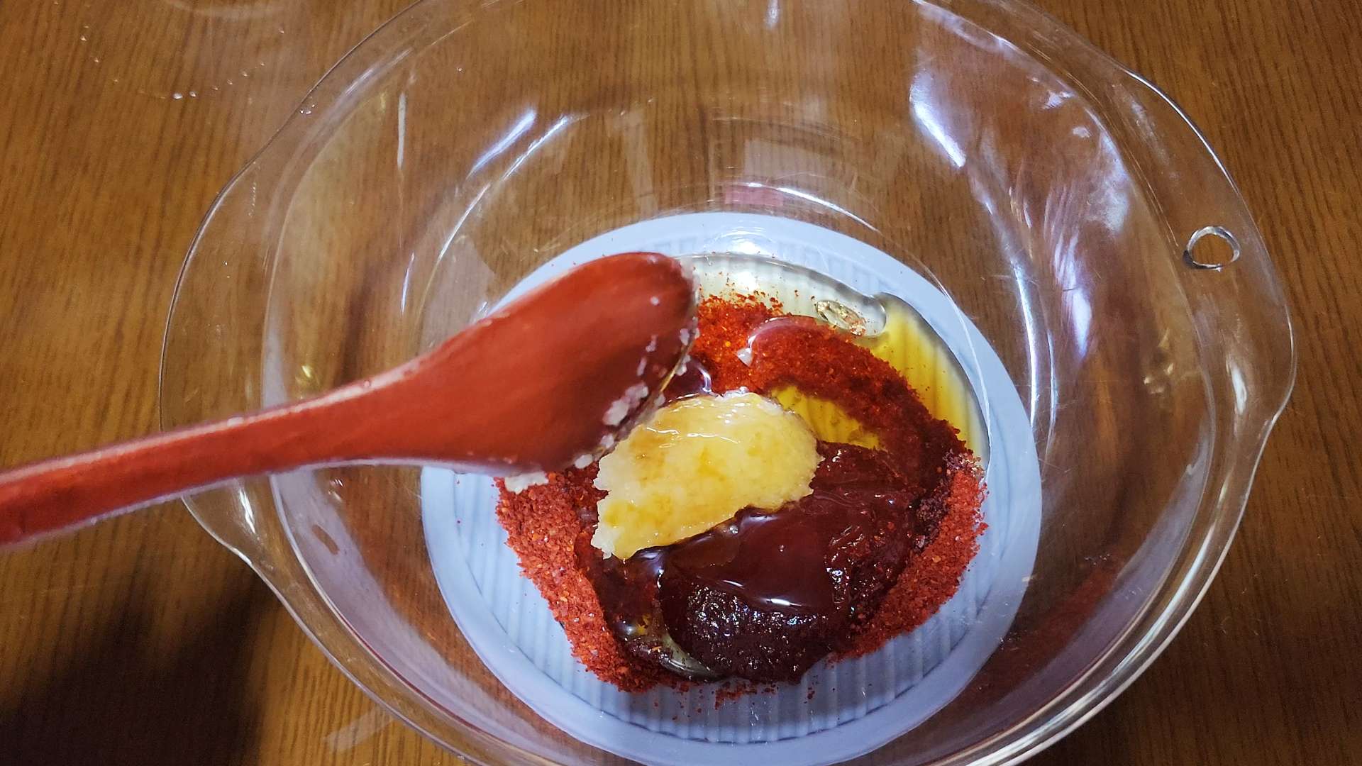 볼에 고춧가루 1T, 고추장 2T, 올리고당 3T, 다진마늘 1T, 참기름 2T을 넣고 섞어줍니다.