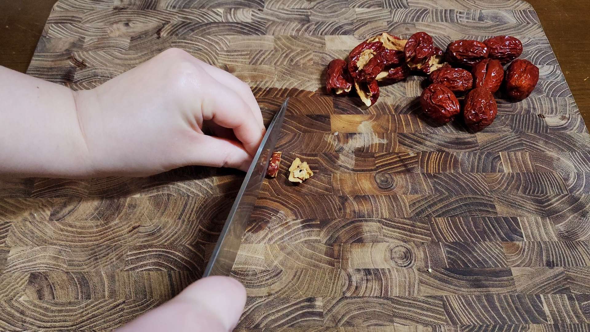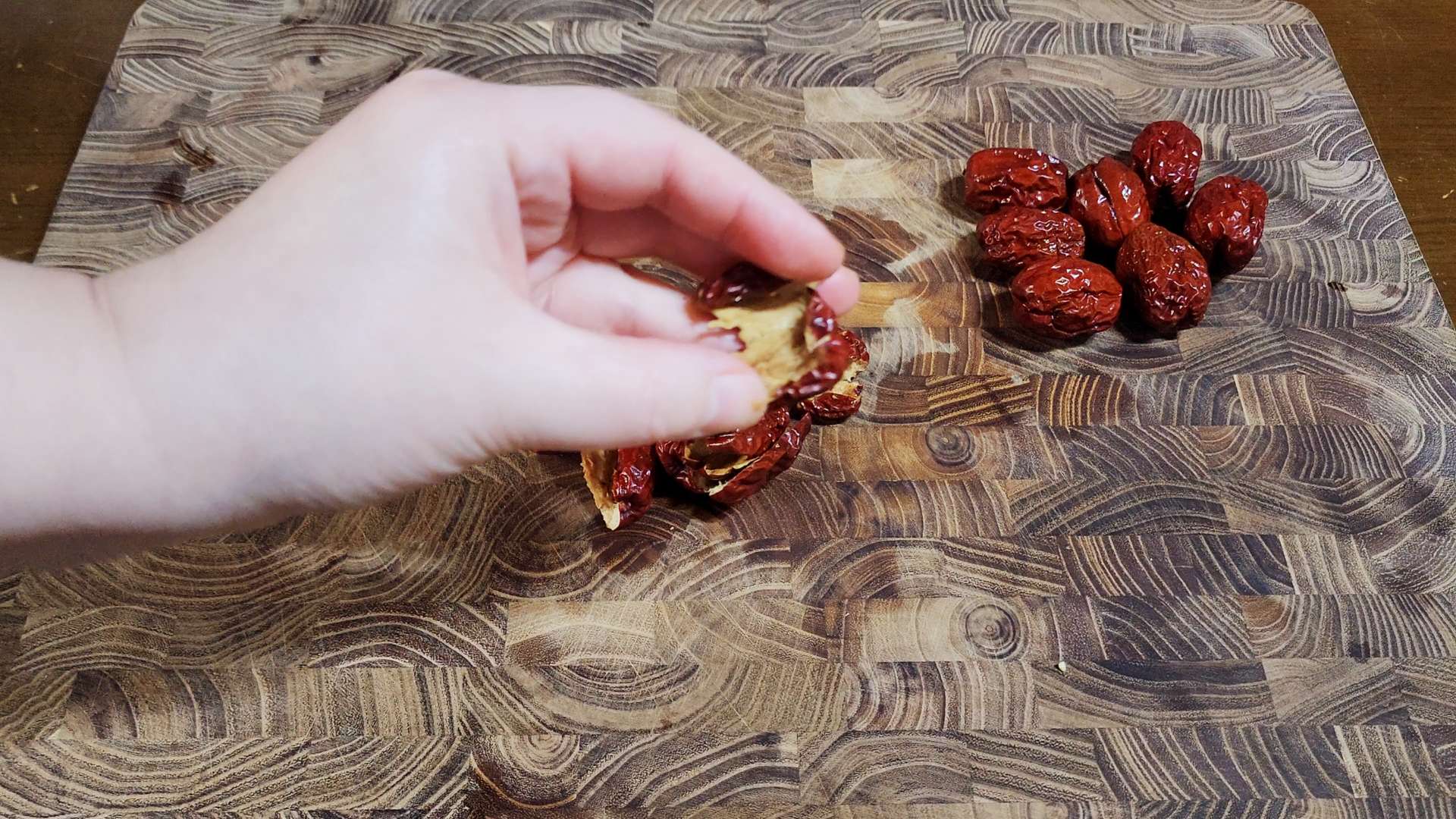 건대추 8개는 씨를 제거하고 돌돌 말아 자르고 꽃모양으로 만들어줍니다.