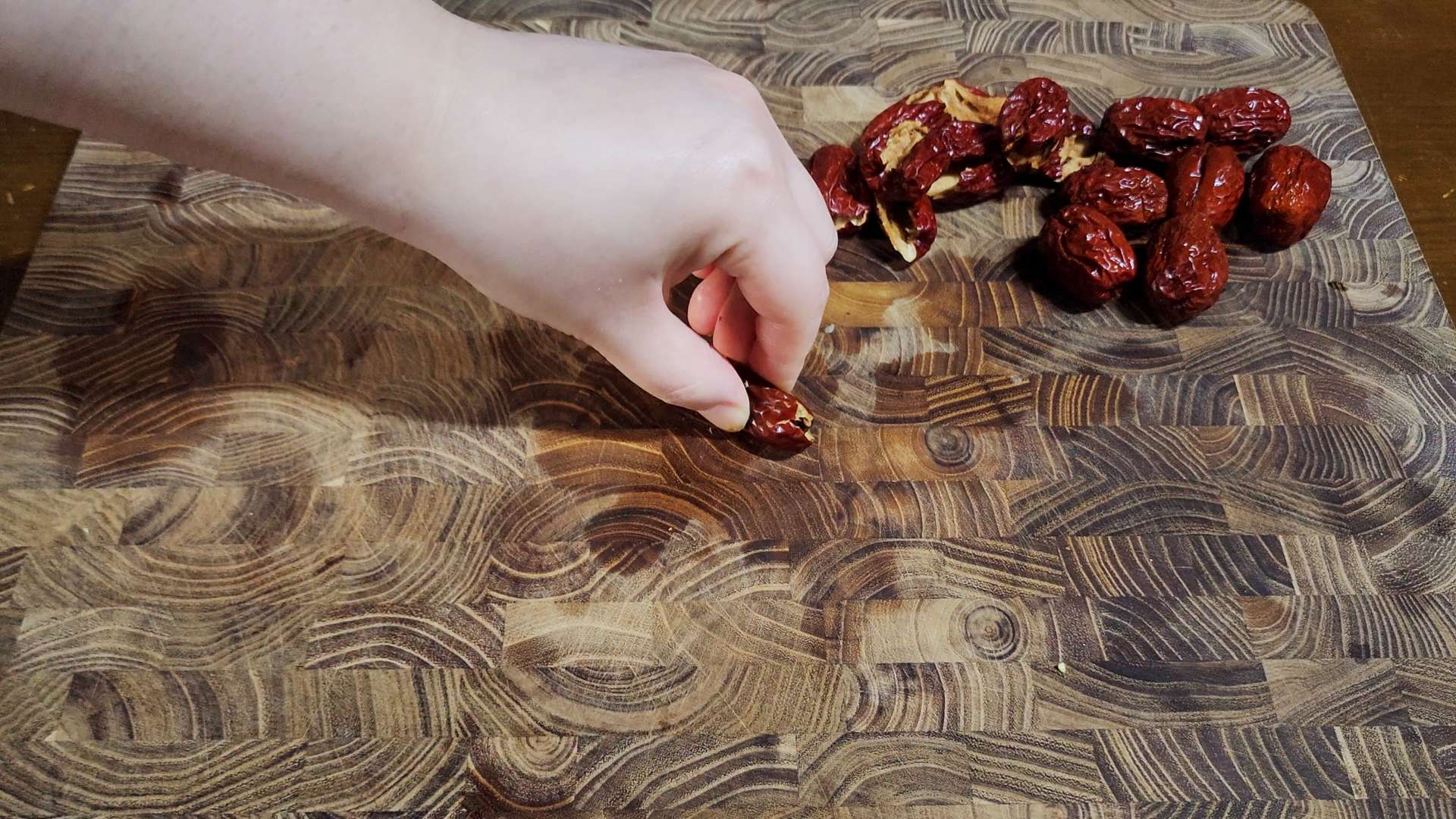 건대추 7개는 대추는 돌려 깎아 씨를 제거하고 길게 채 썰어줍니다.