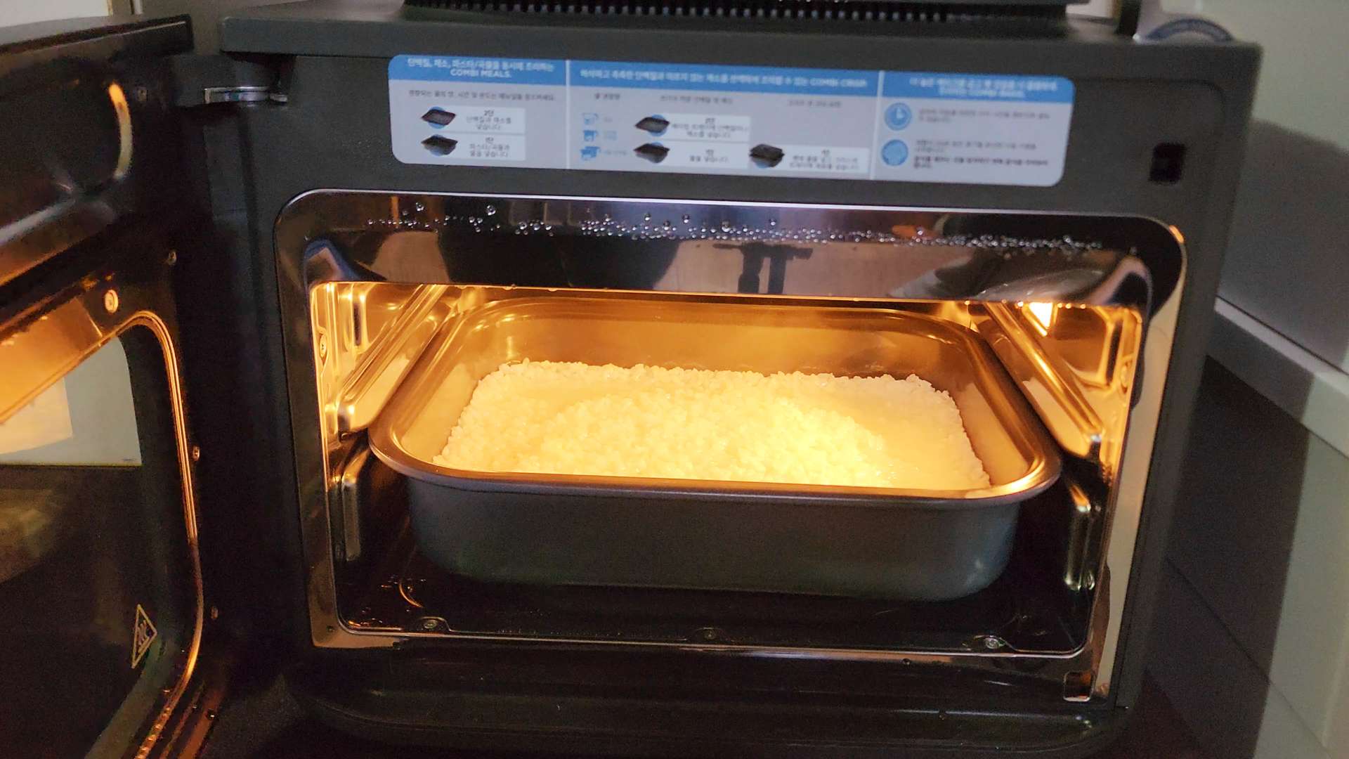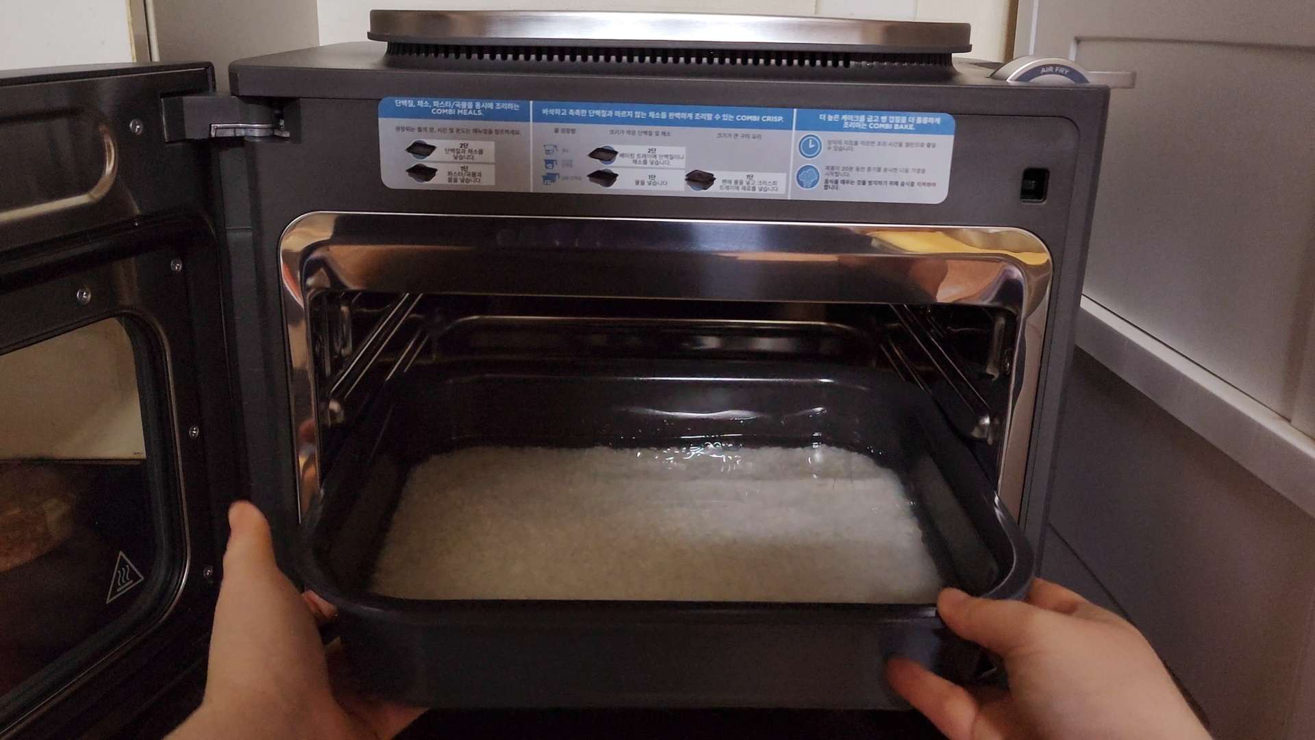 1단에는 콤비팬을 넣어 쌀밥을 만들어 볼게요.