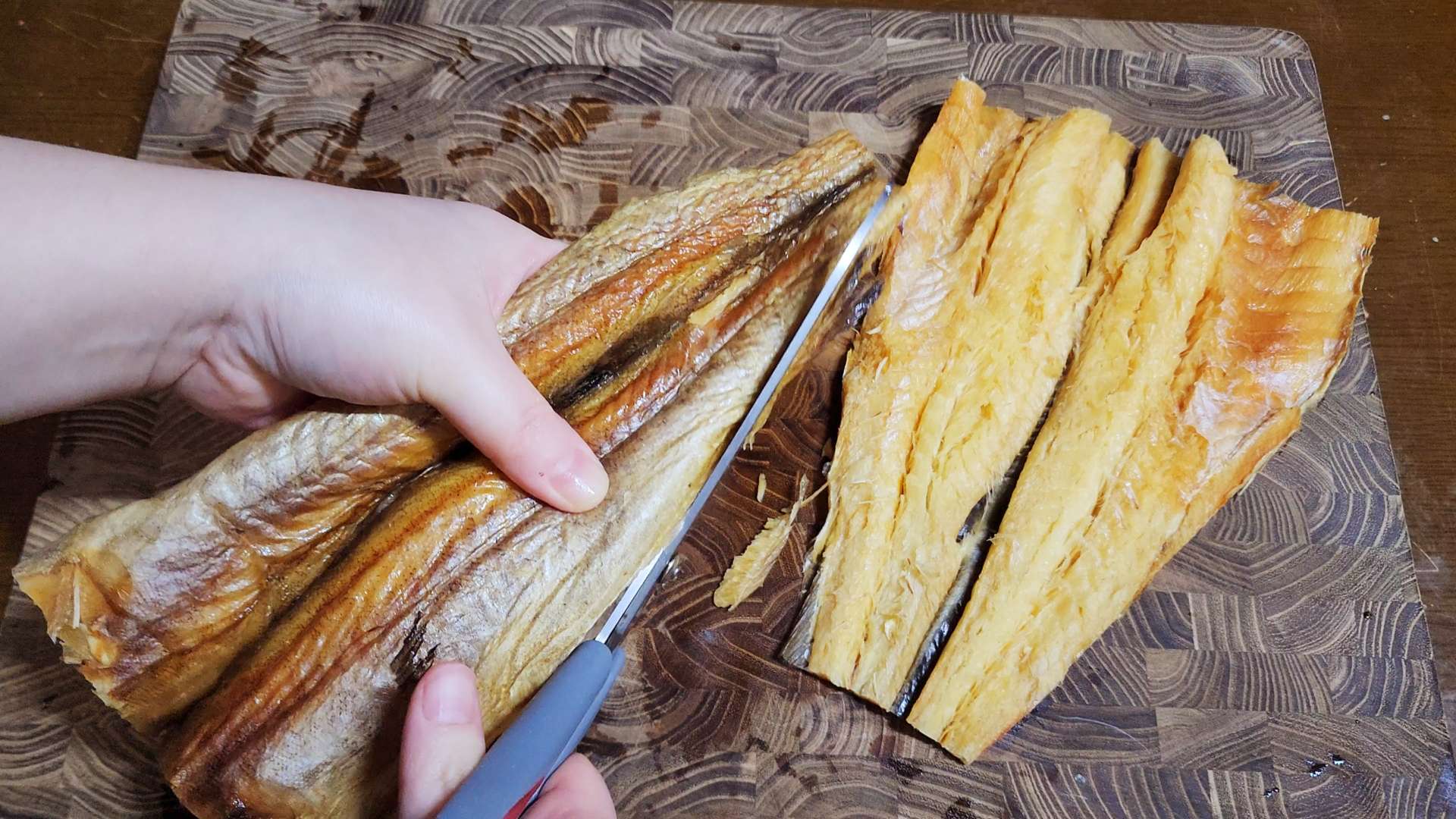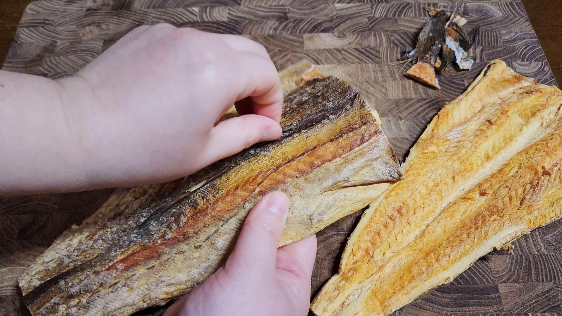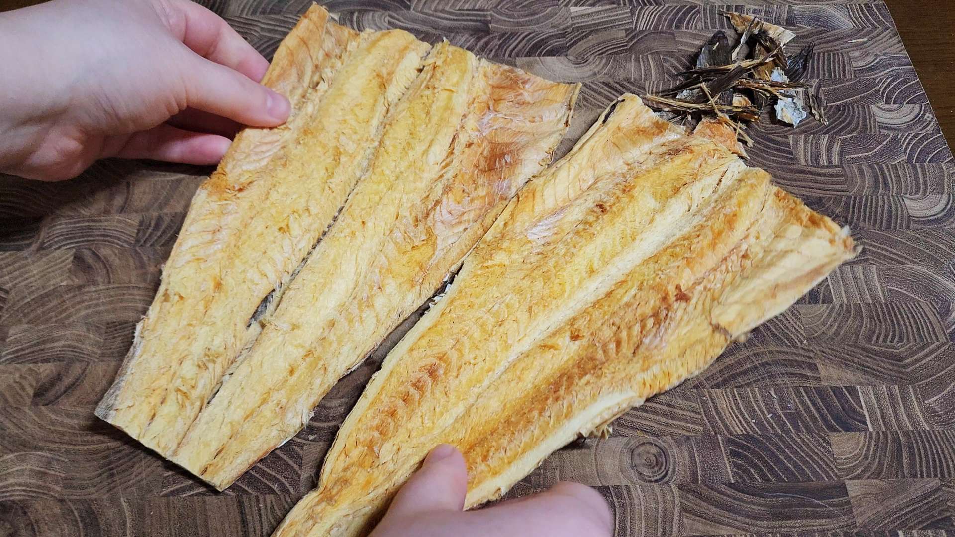 황태포는 가위로 황태포 머리, 꼬리, 지느러미를