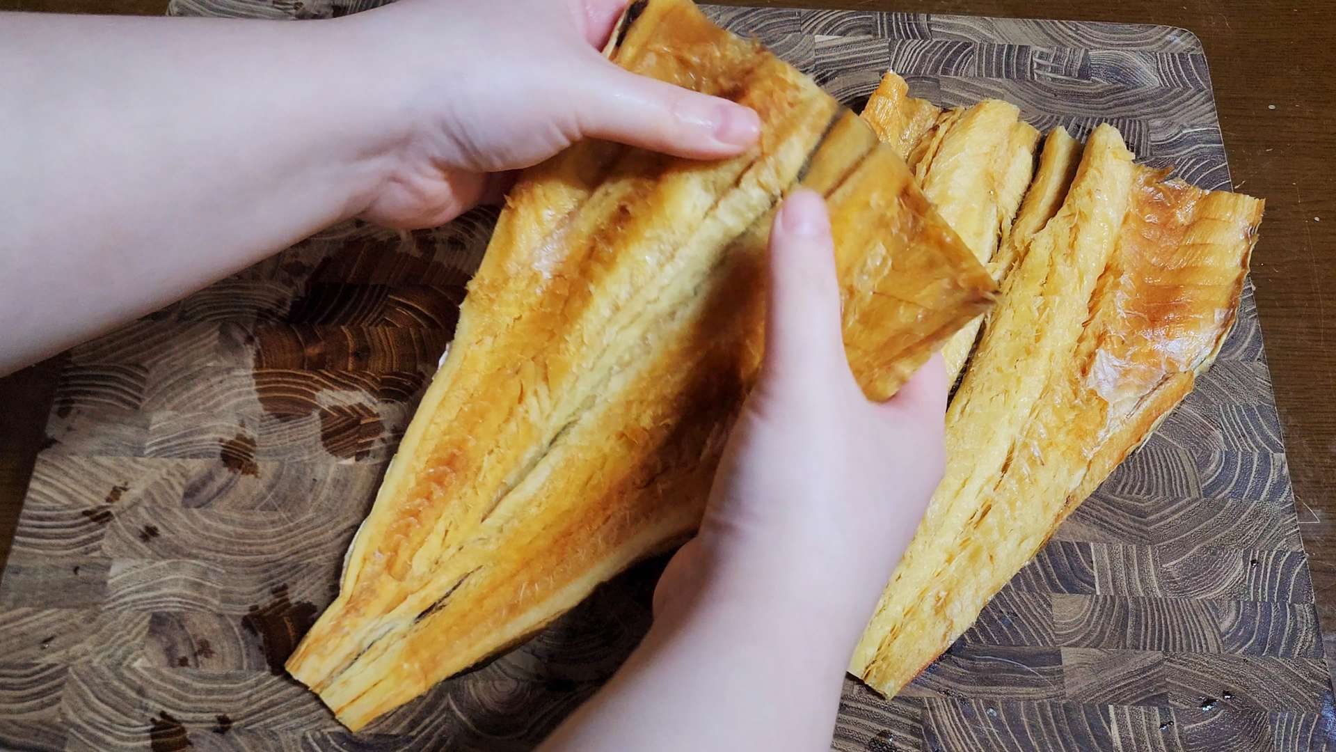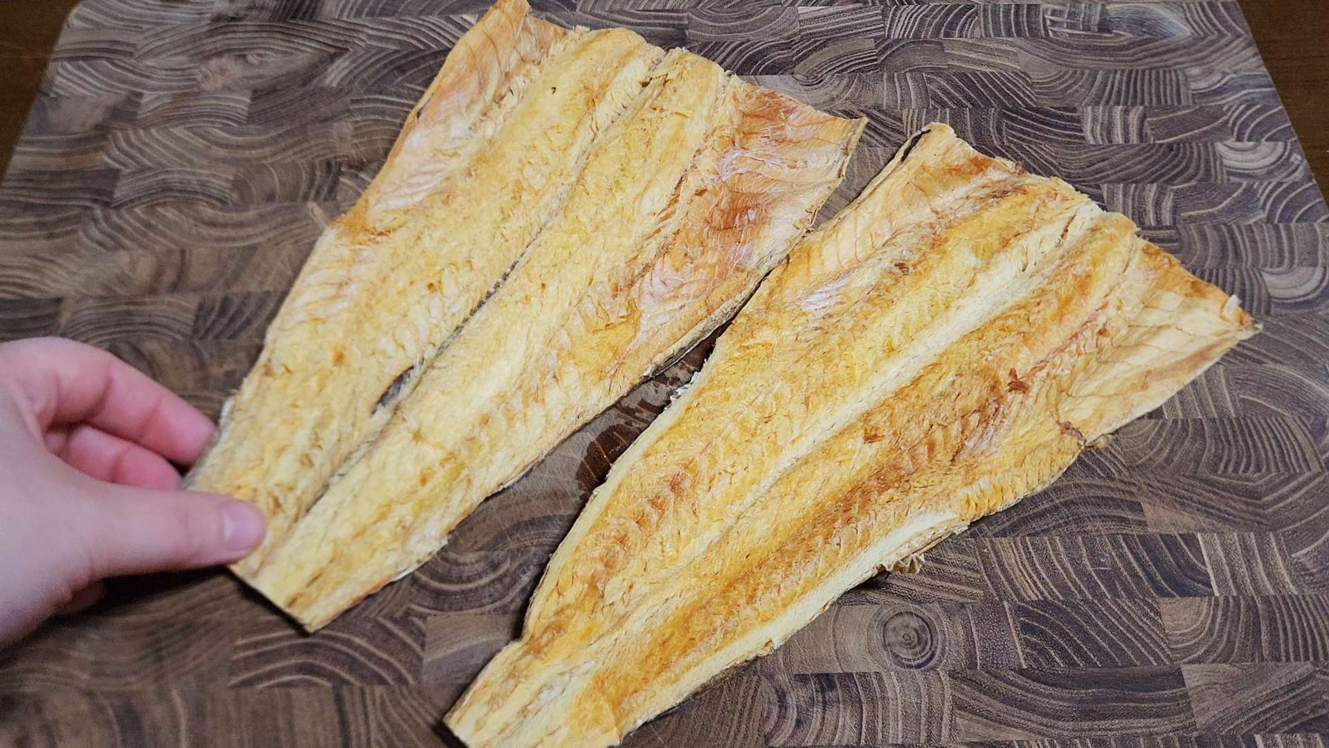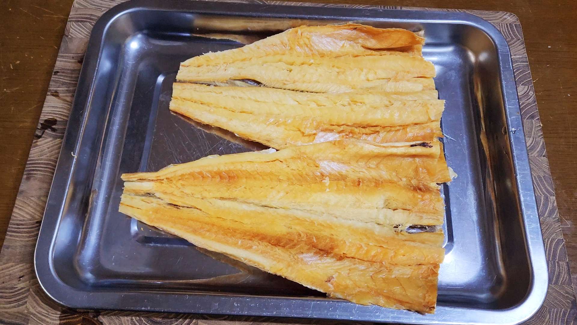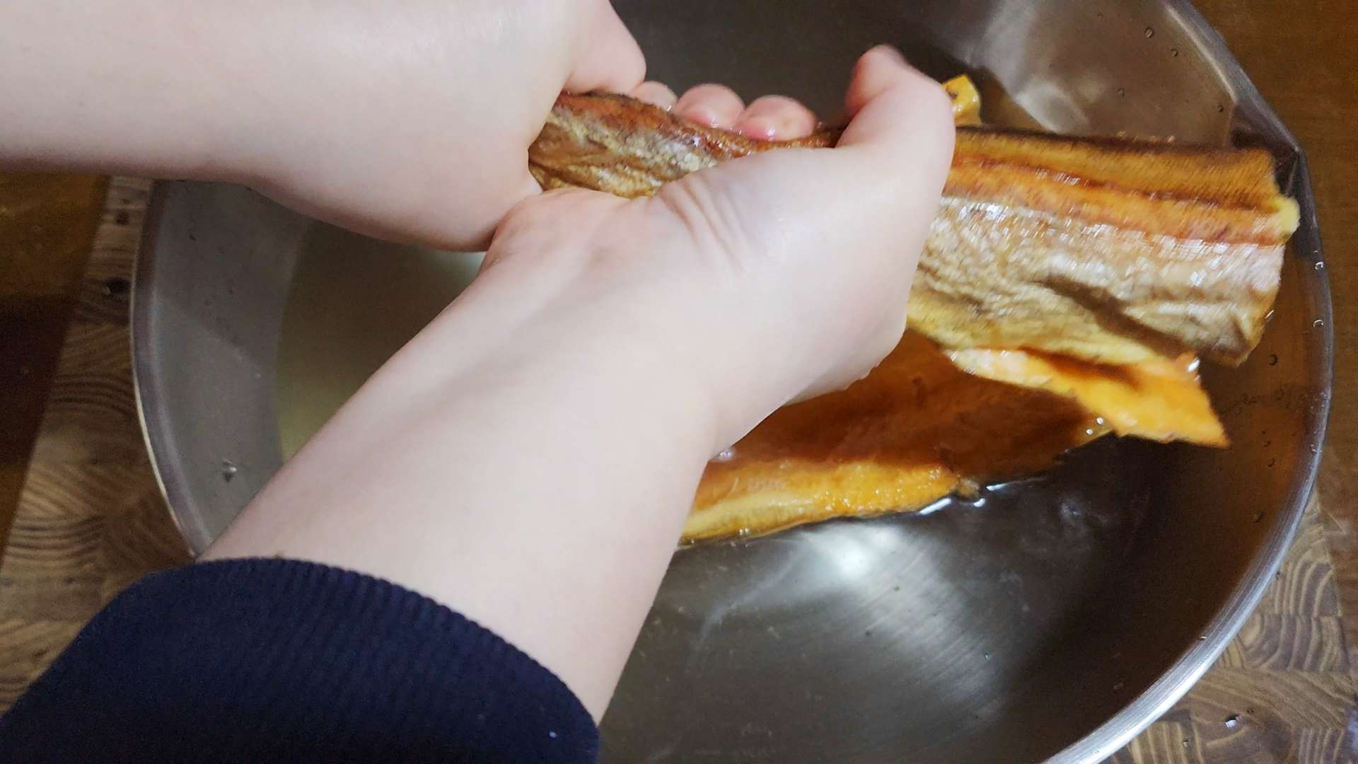 황태포는 가위로 황태포 머리, 꼬리, 지느러미를