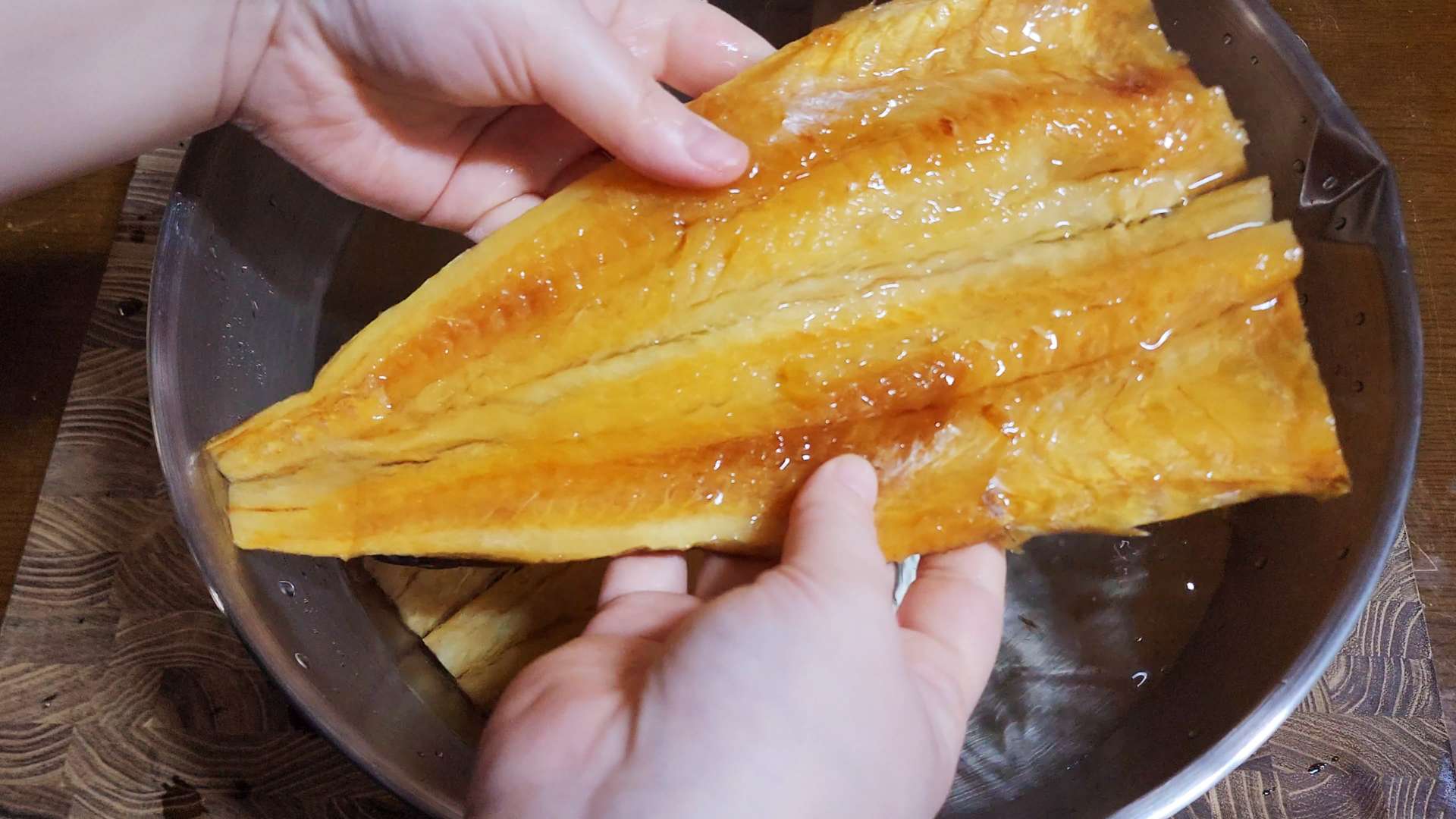 불린 황태포는 물기를 꼭 짜고 가시를 제거해줍니다.