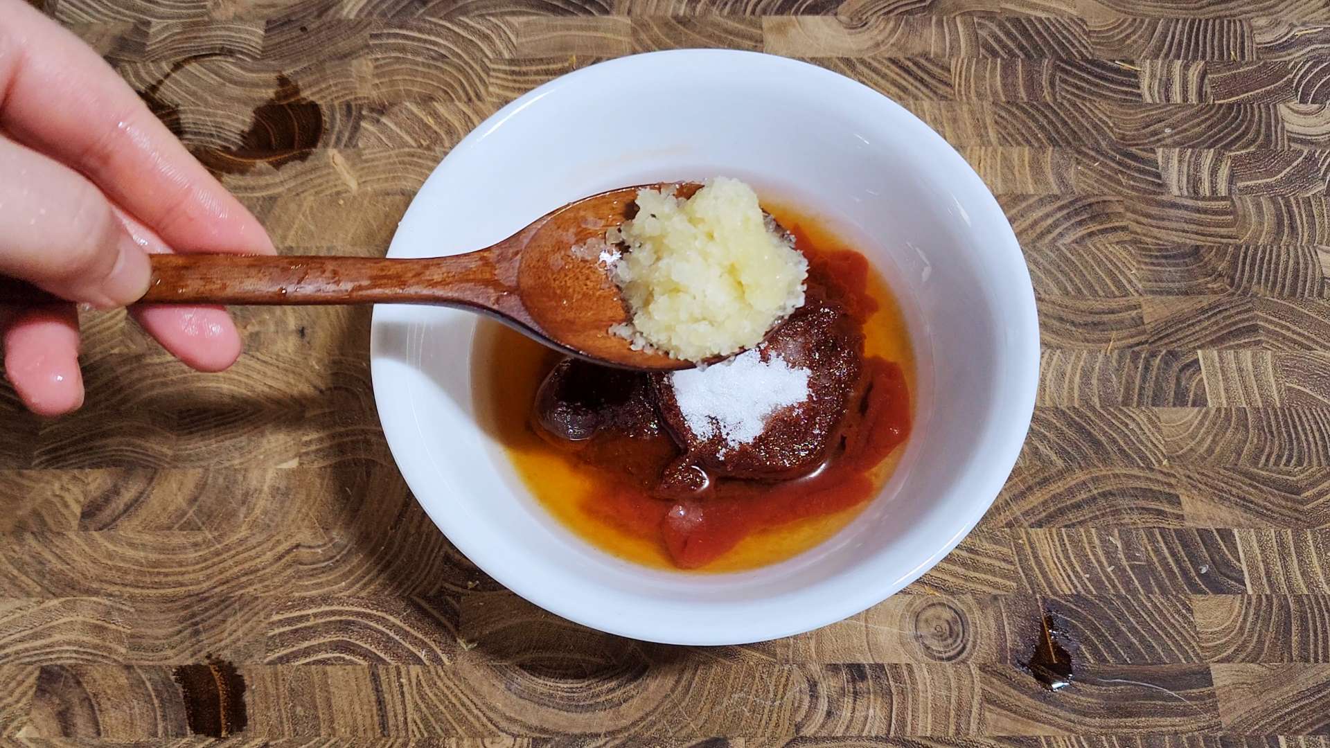 고추장 5T, 설탕 0.5T, 다진 마늘 0.5T, 참기름 0.5T를 넣고 섞어줍니다.