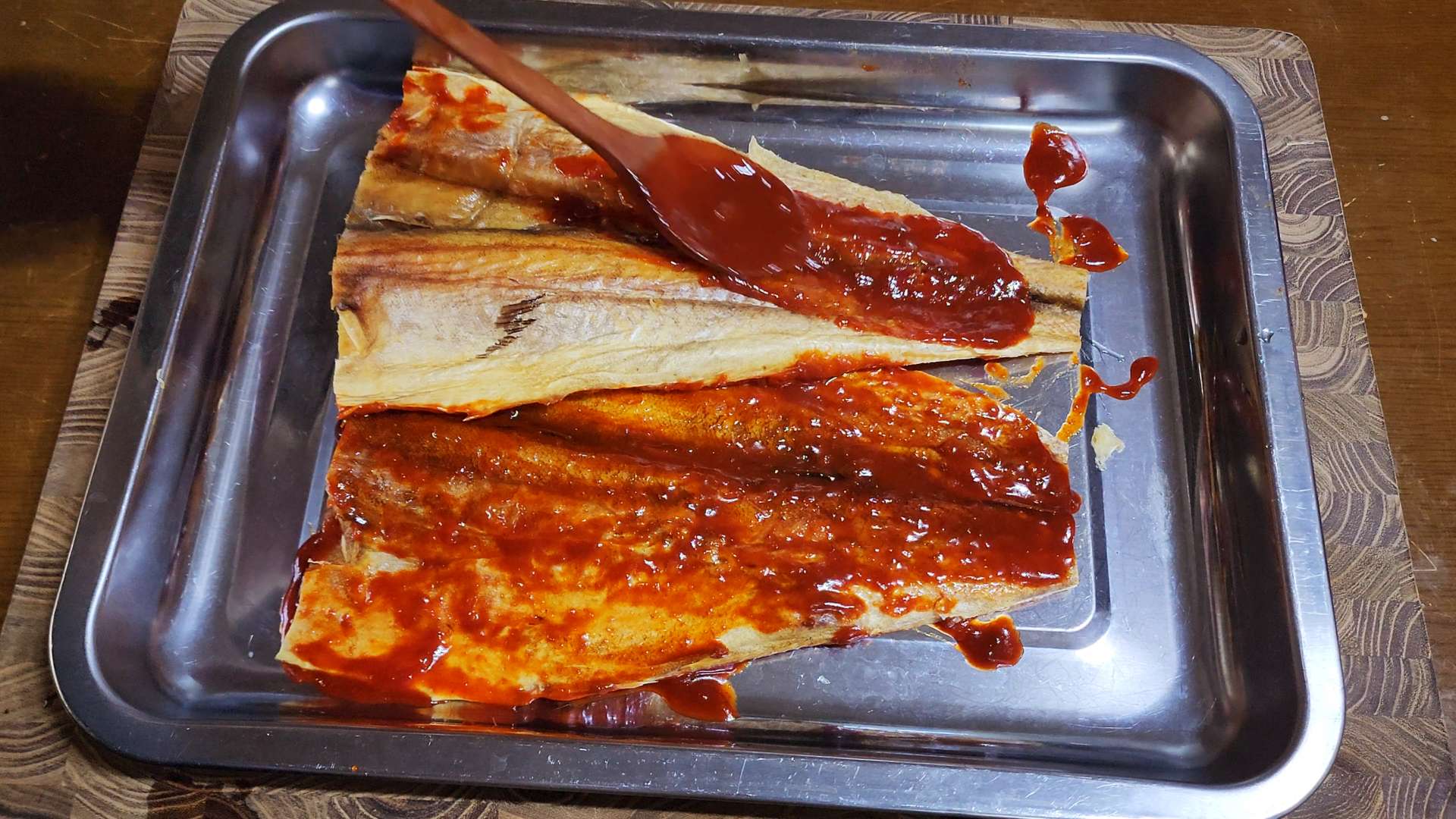 황태포 앞 뒤에 양념을 골고루 발라 재워줍니다.