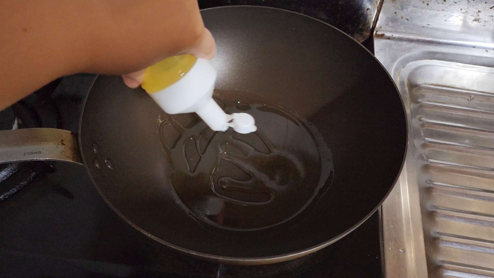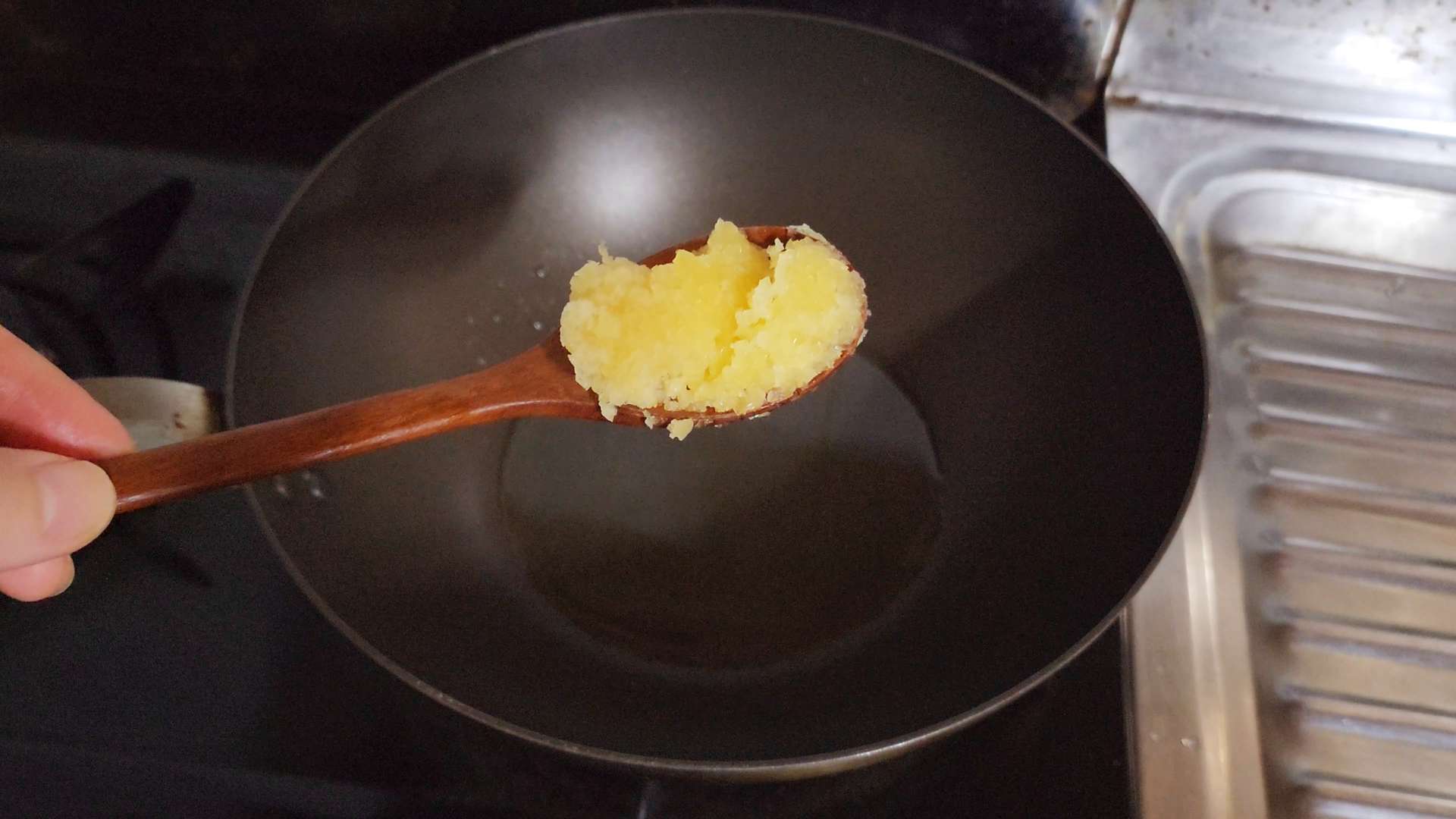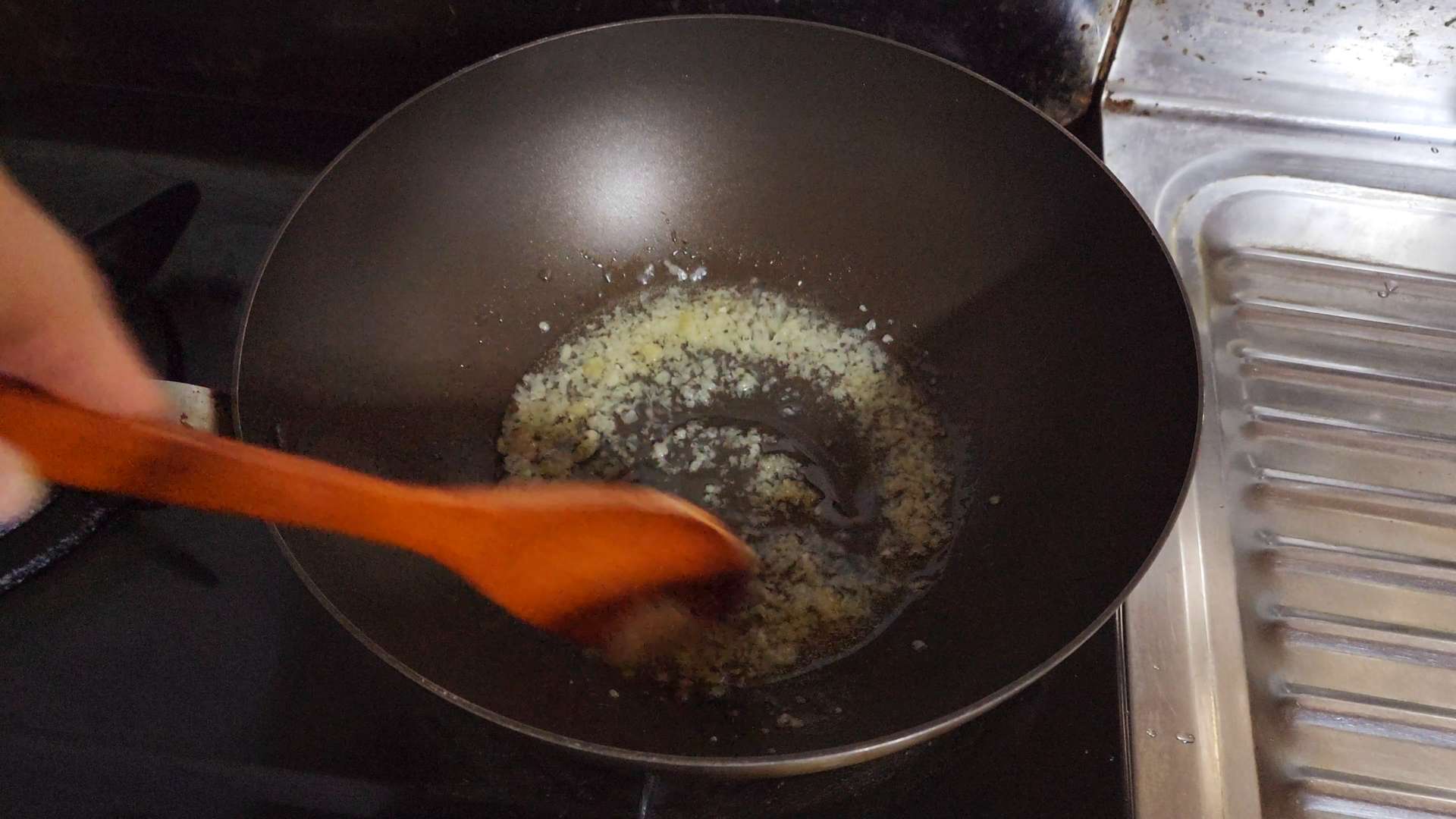 중불로 달군팬에 식용유, 다진마늘 1T를 넣고 볶아줍니다.