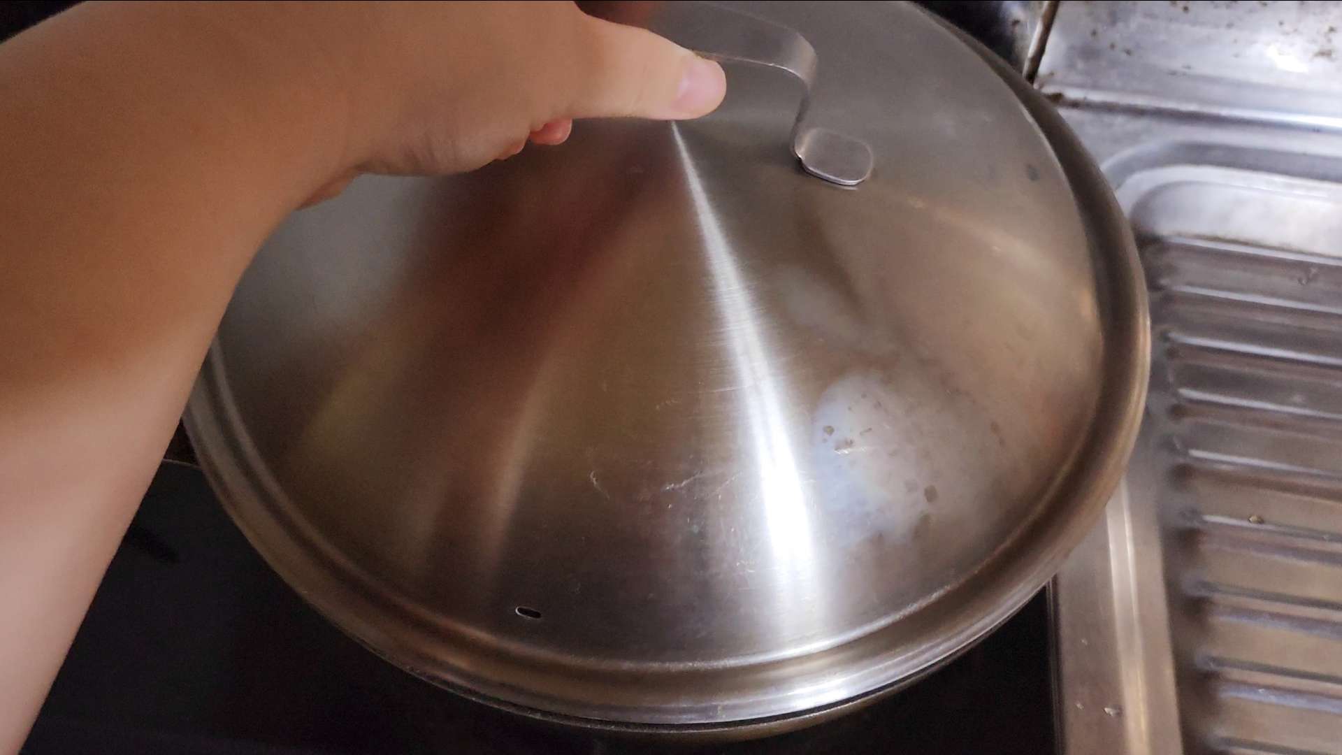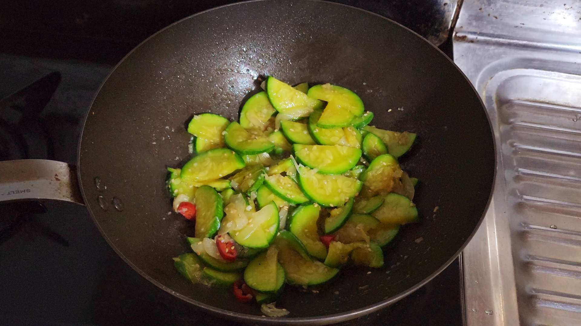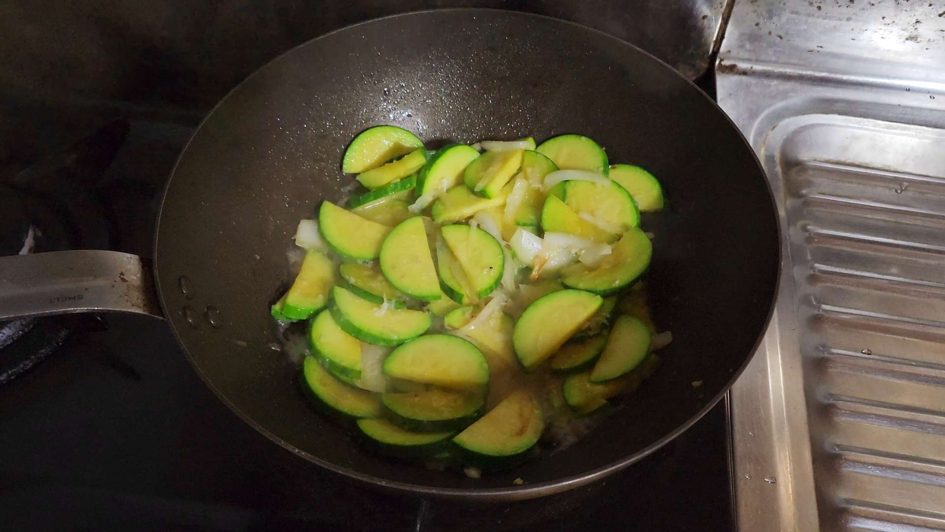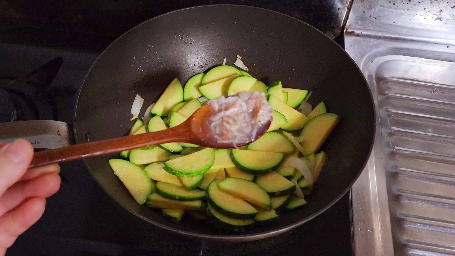 애호박, 새우젓 1T, 생수 50ml를 넣고 뚜껑 덮고 약불에서 2분 정도 익혀줍니다.