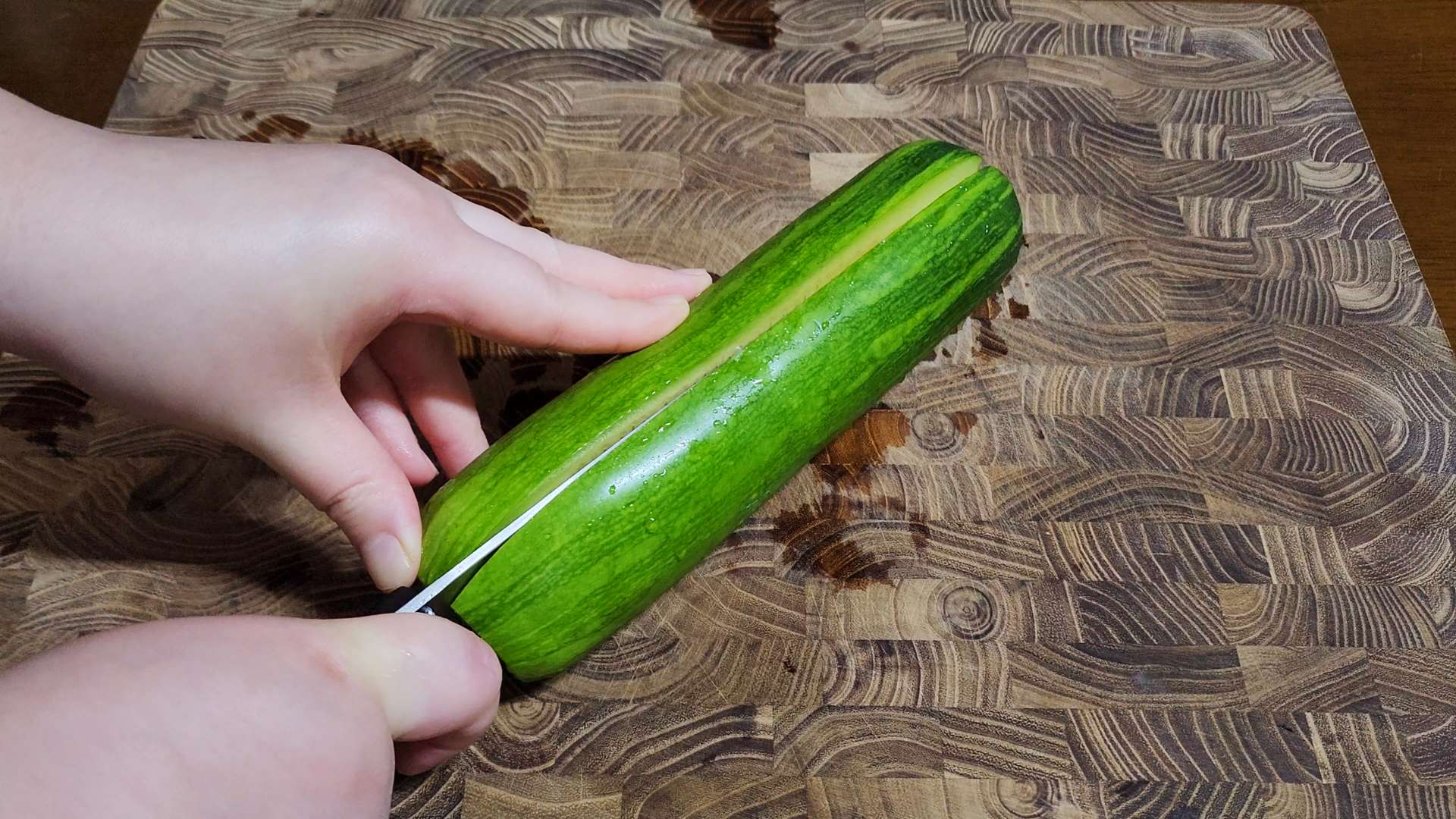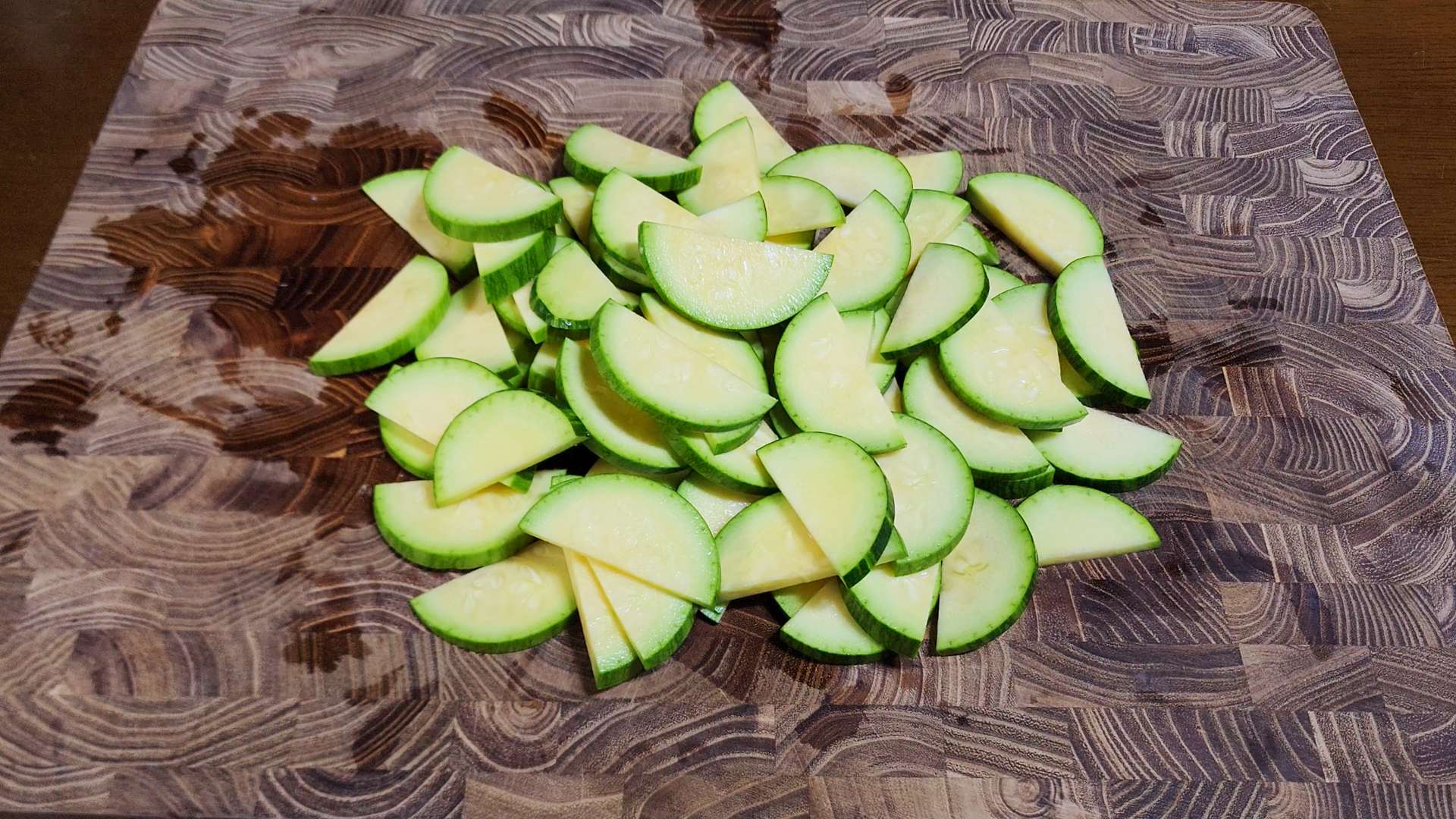 애호박은 반으로 자르고 반달 모양으로 썰어줍니다.