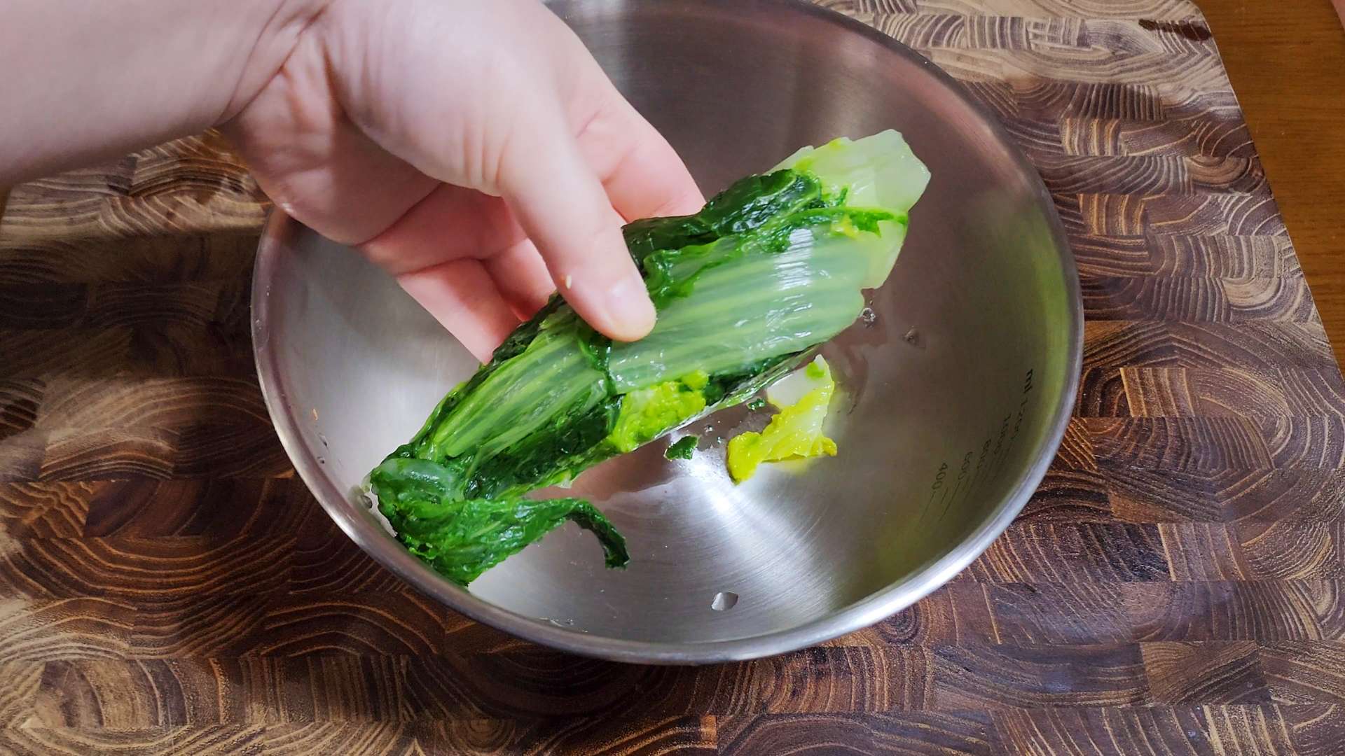 데친 얼갈이배추는 찬물에 헹구고 물기를 짜줍니다.