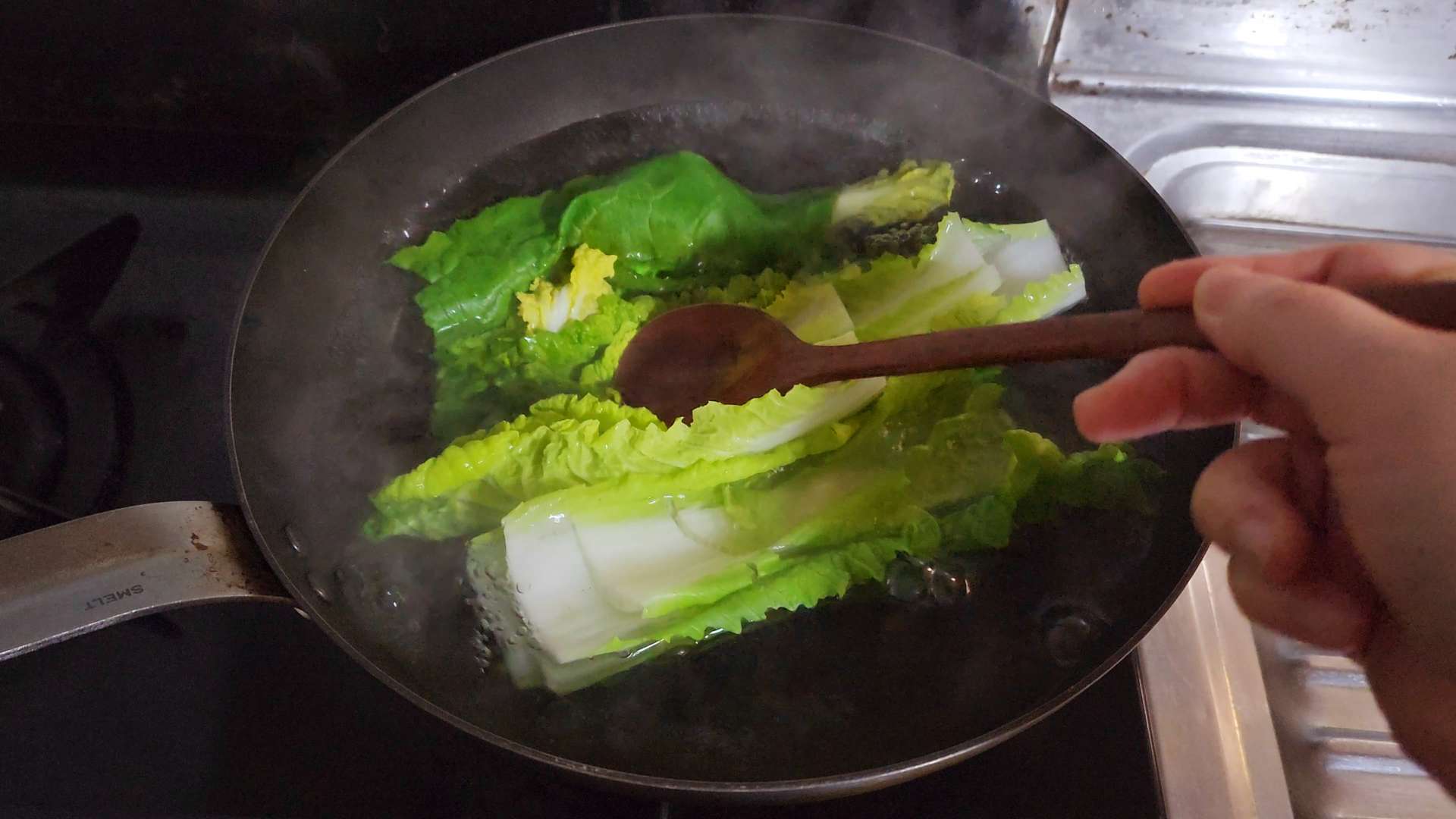 끓는 물에 굵은 소금 1T, 얼갈이배추 넣고 30초 정도 데쳐줍니다.