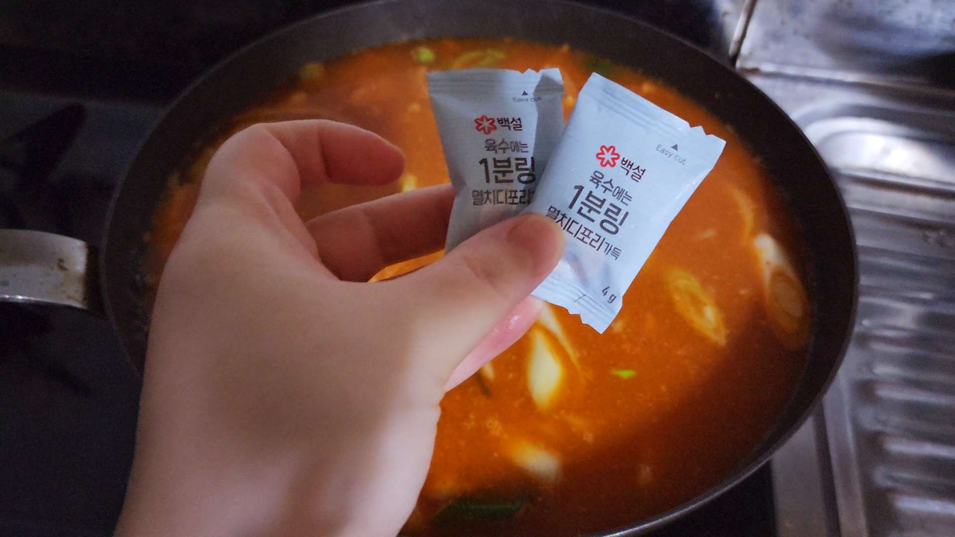물 1L, 코인육수 2개, 참치액 1T, 참기름 1T 넣고 중불에서 끓여줍니다.