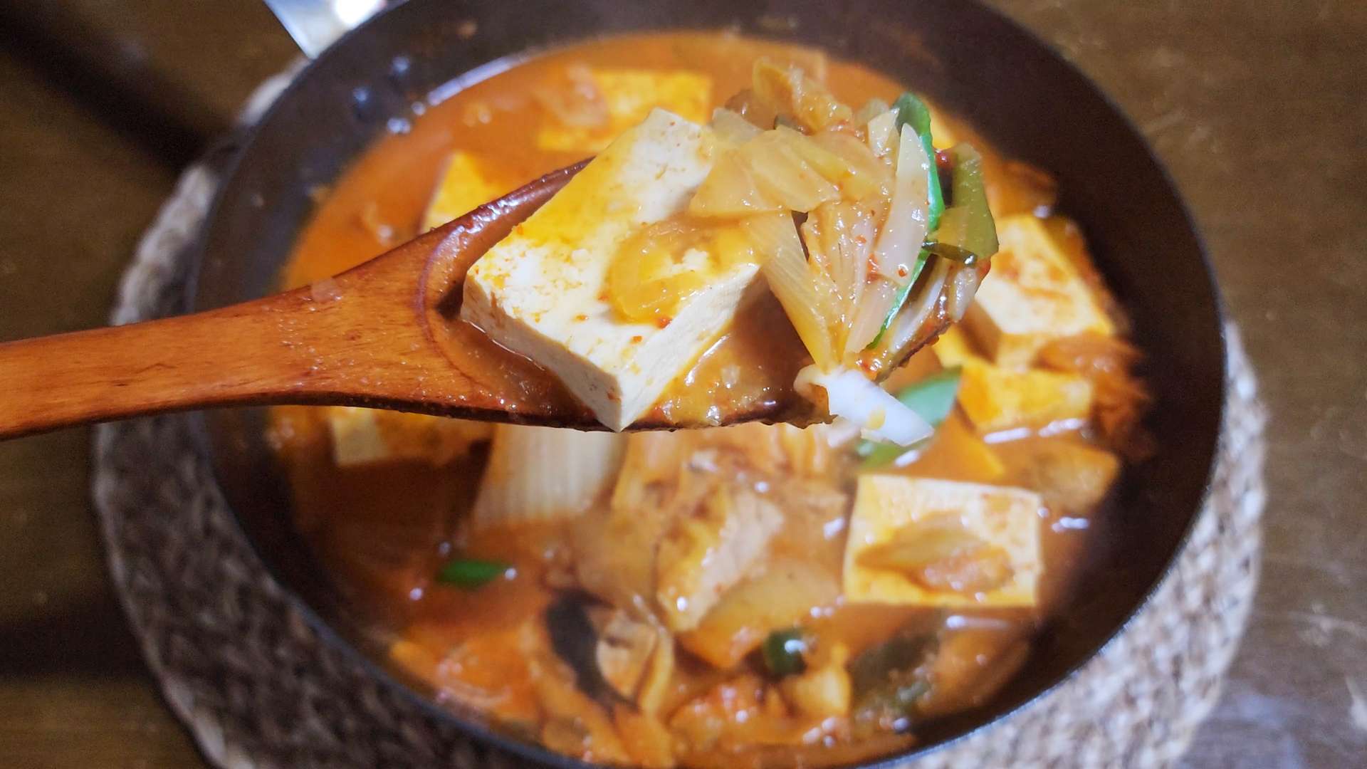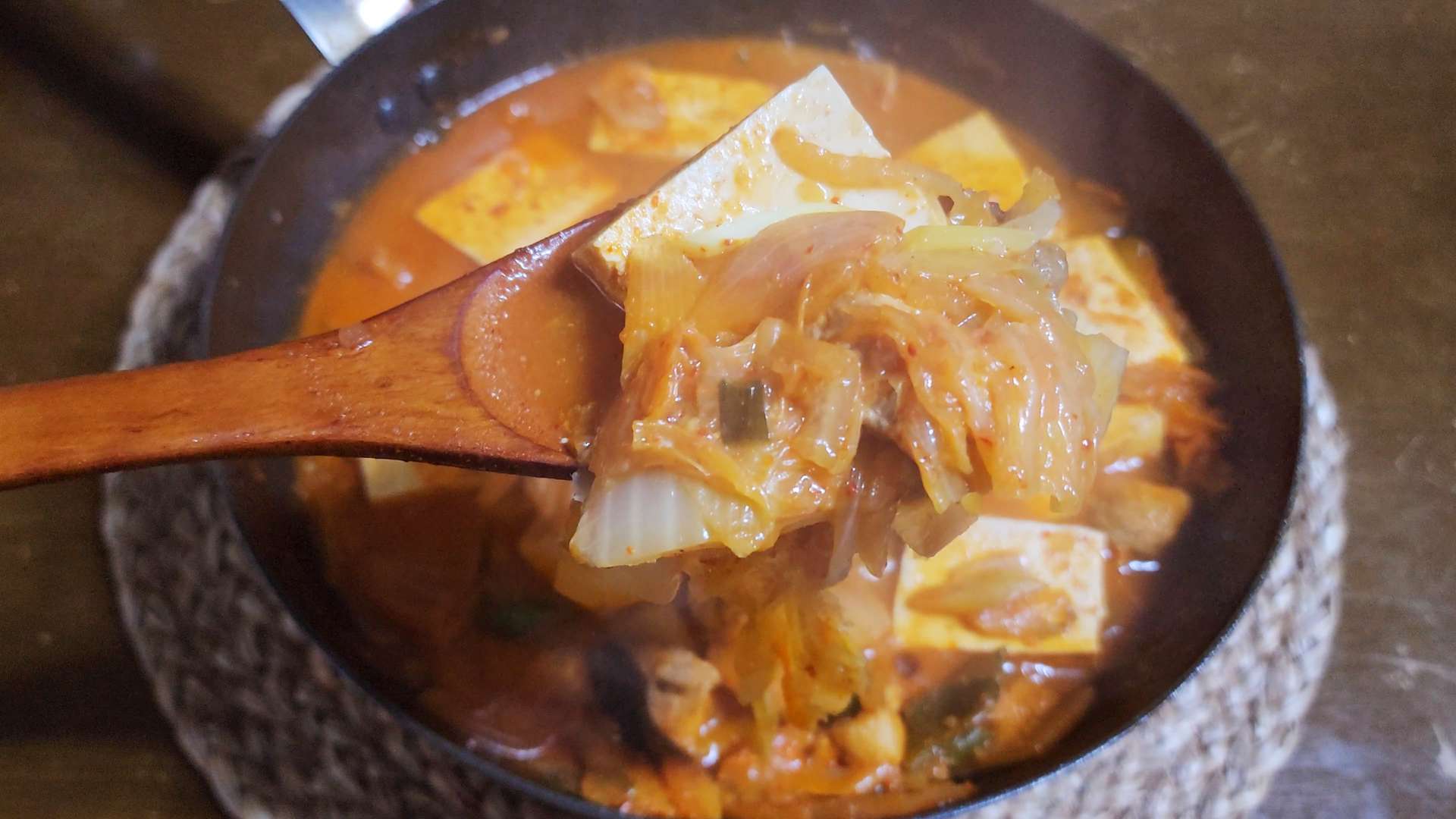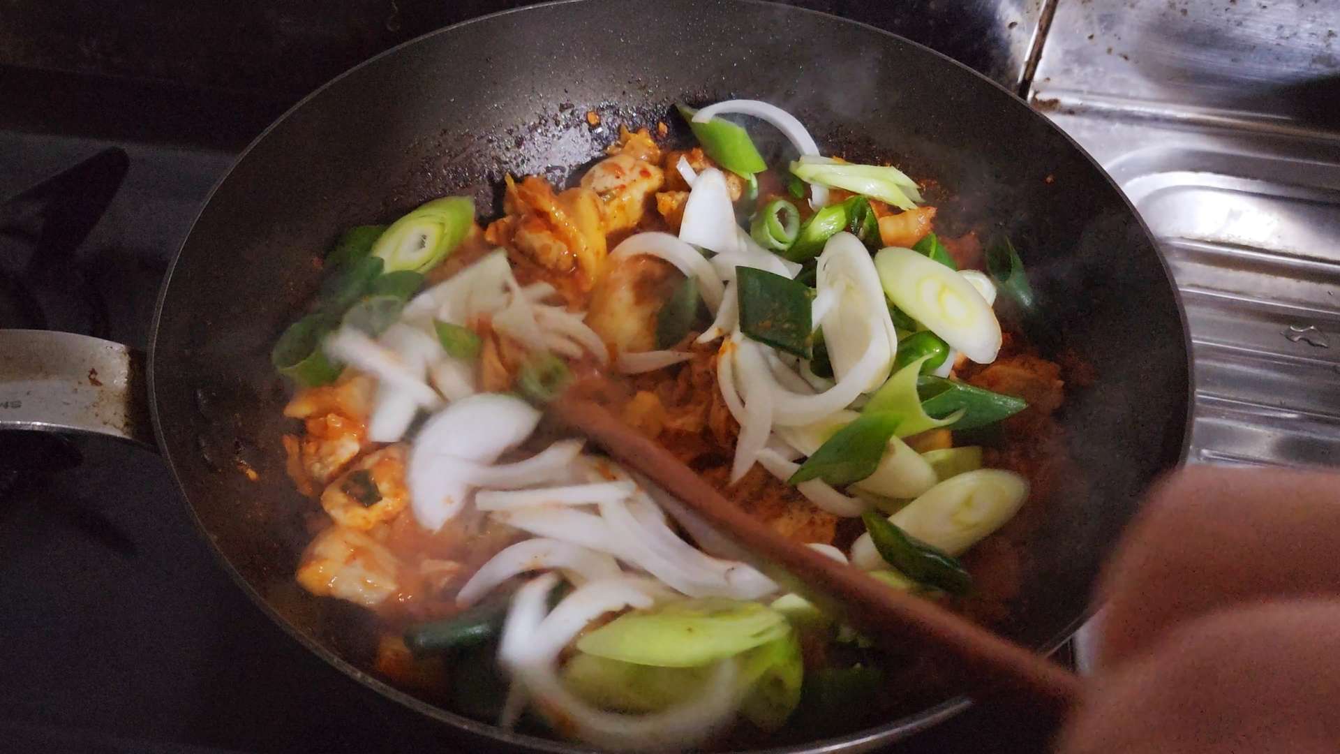 재료: 김치 1/4포기, 돼지고기 앞다리살 찌개용 200g, 대파 1대, 양파 1/2개, 청양고추 2개, 두부 1모,