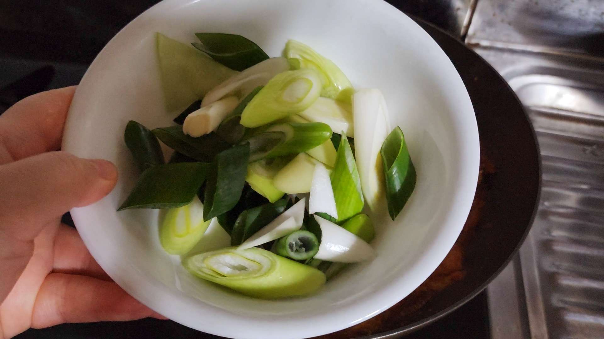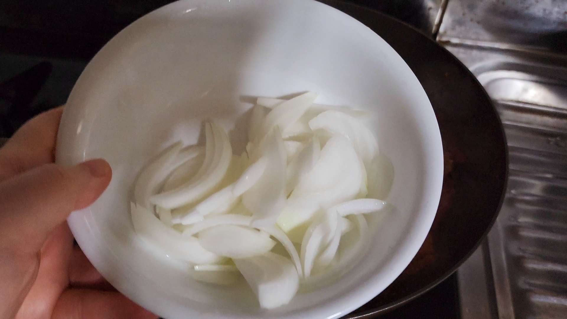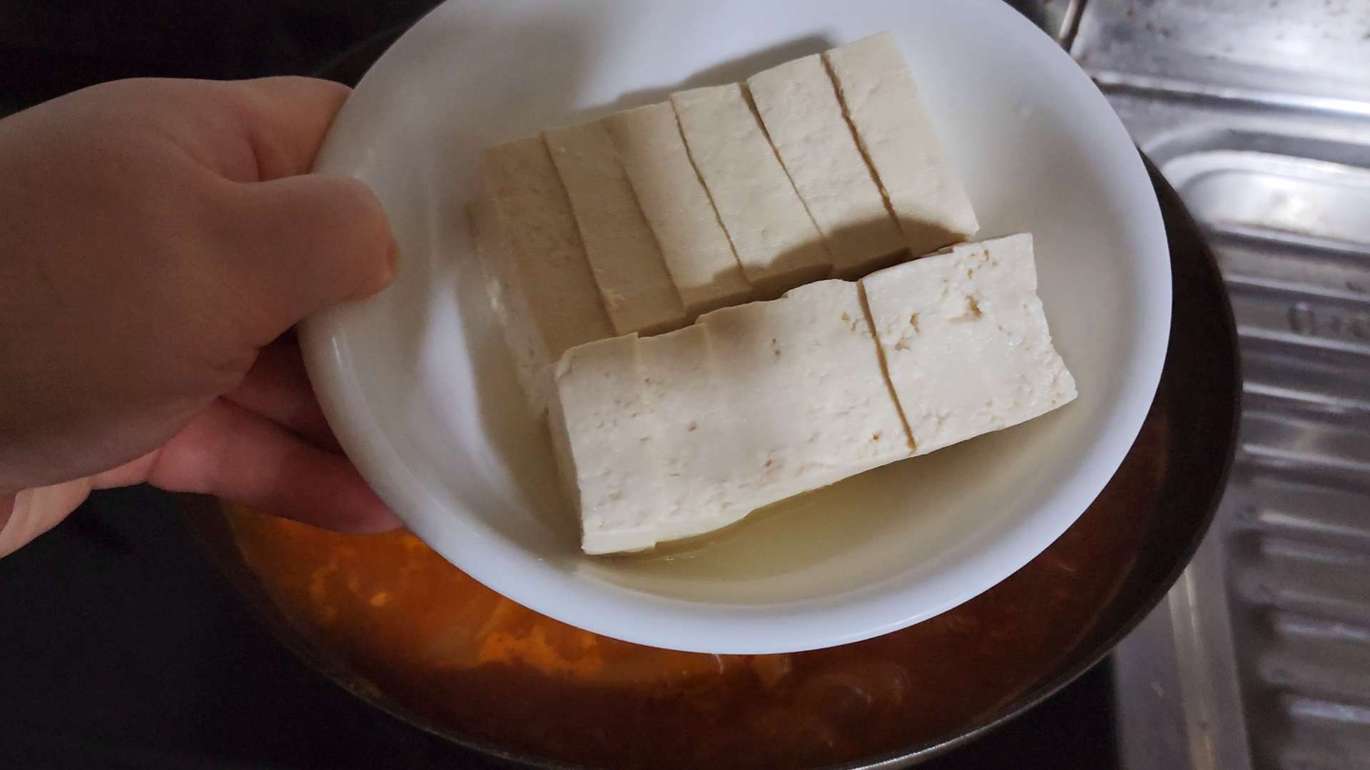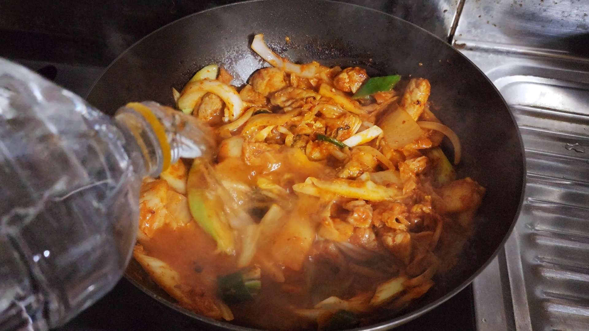 재료: 김치 1/4포기, 돼지고기 앞다리살 찌개용 200g, 대파 1대, 양파 1/2개, 청양고추 2개, 두부 1모,