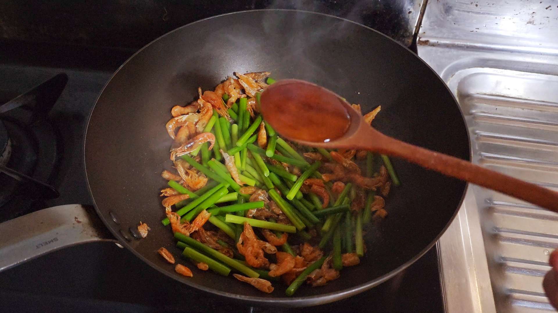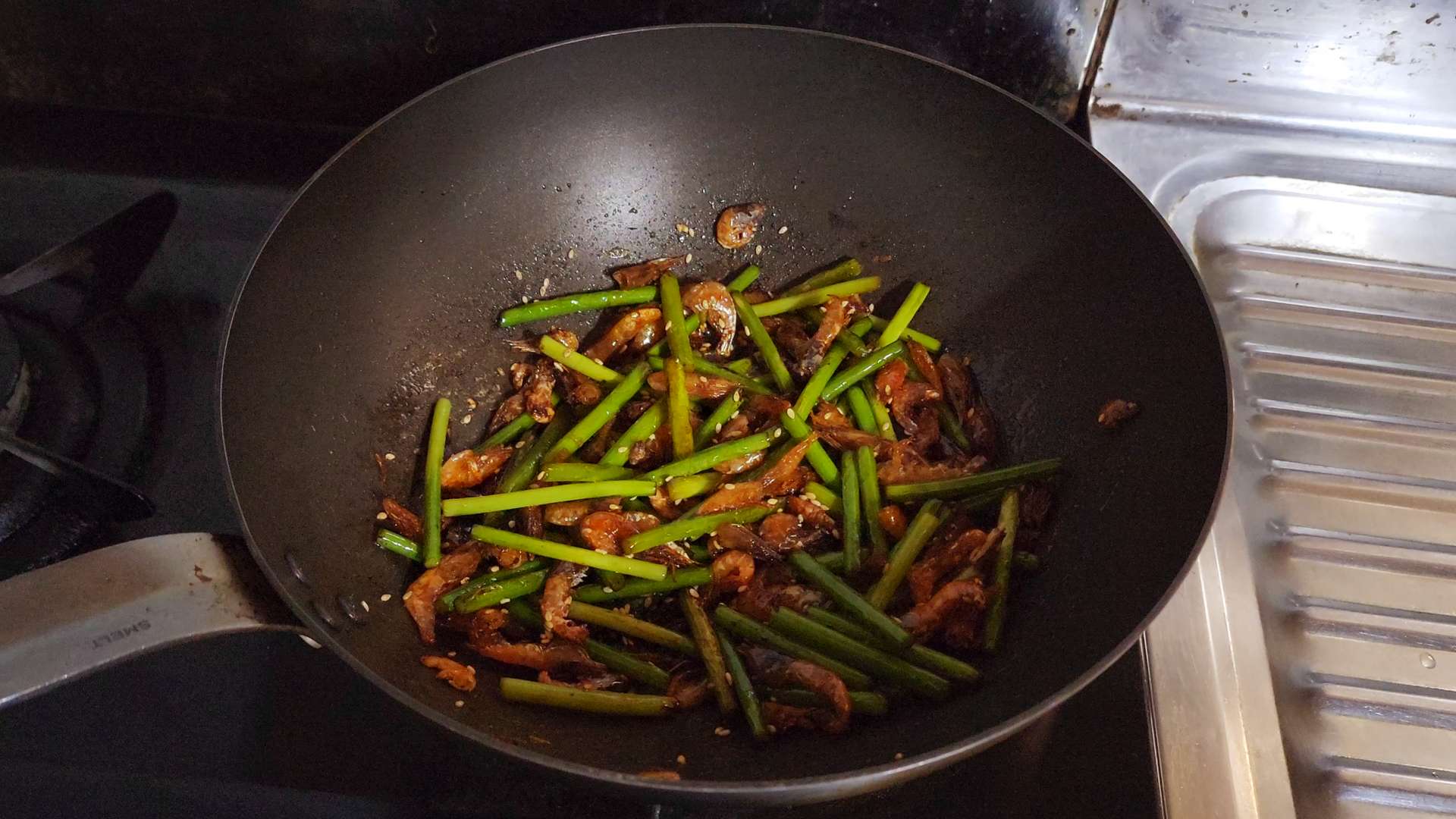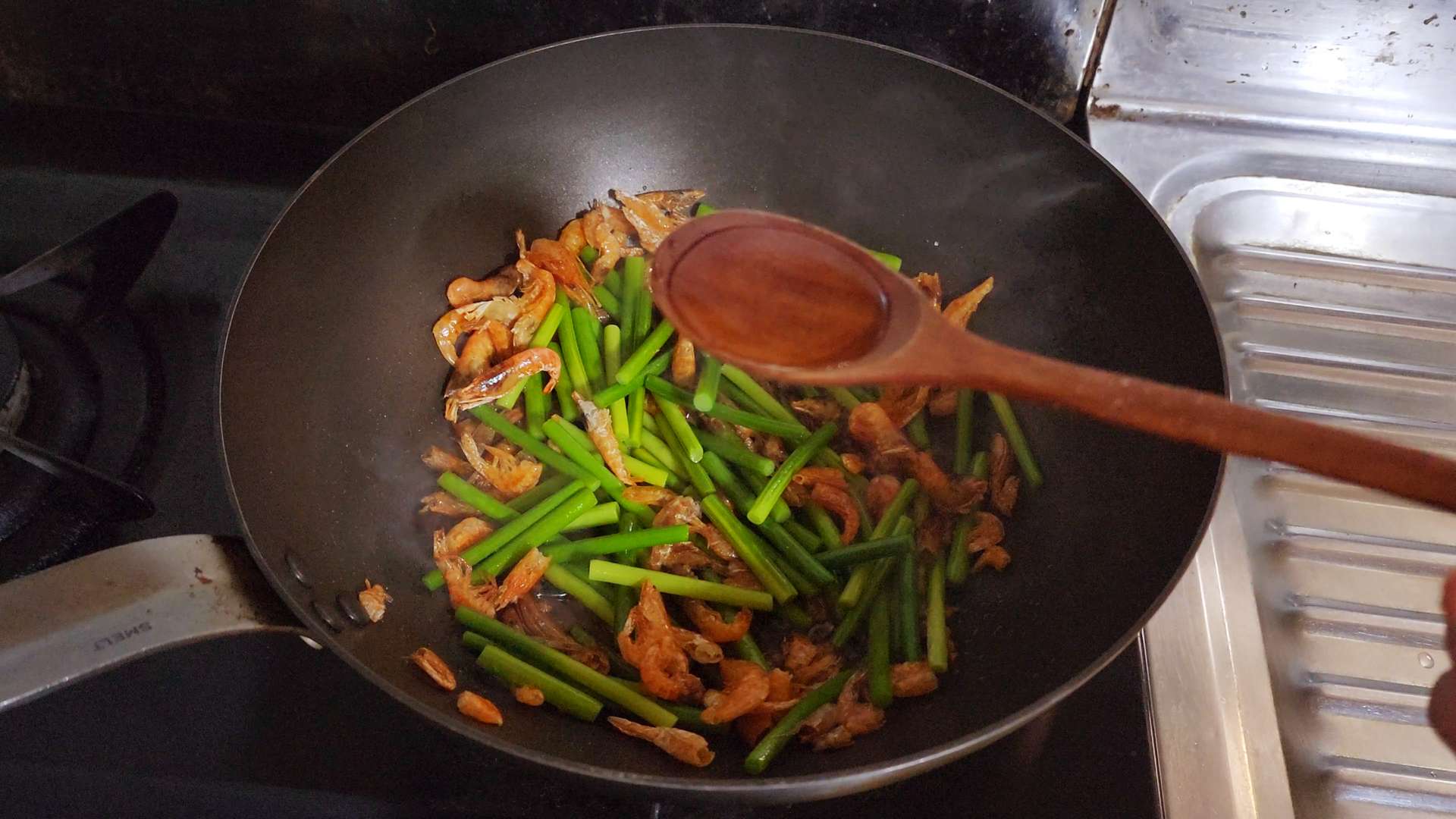중불로 달군팬에 식용유, 마늘쫑, 건새우를 넣고 볶아줍니다.